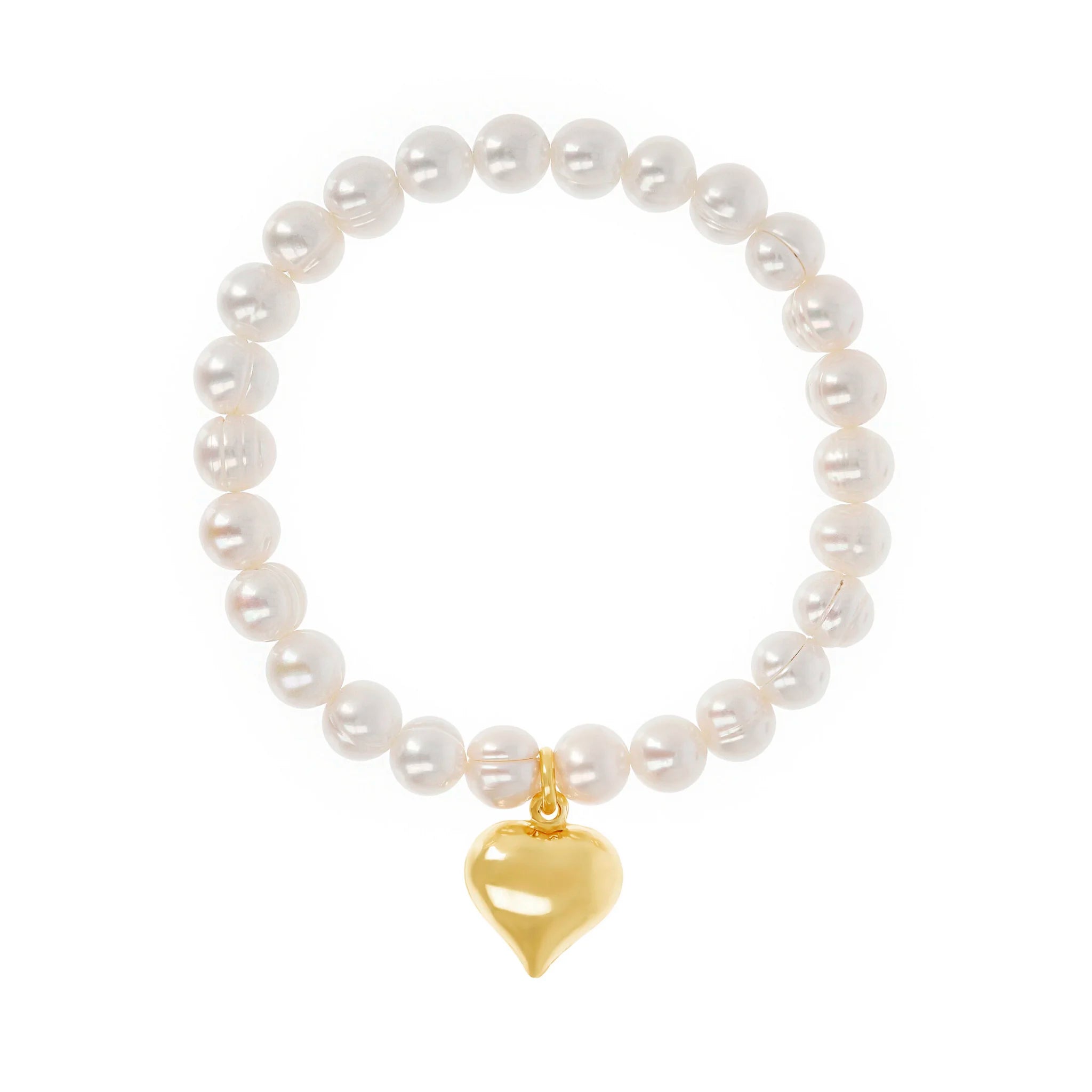 Elastisches Armband mit Herzanhänger aus 18 Karat Gelbgold vergoldetem 925er Silber und eingekreisten weißen Süßwasserperlen Ø 7/8 mm