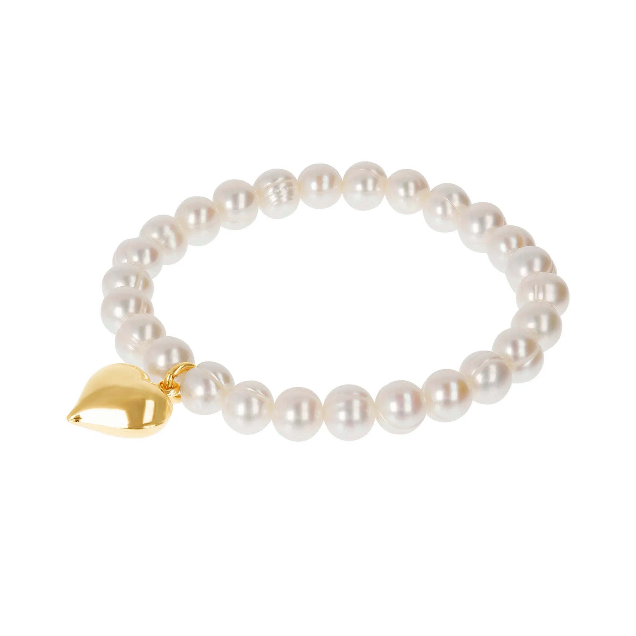 Elastisches Armband aus weißen, eingekreisten Süßwasser-Zuchtperlen mit einem Durchmesser von ca. 7/8 mm und elektrogeformtem herzförmigem Anhänger aus 18 Karat Gelbgold vergoldetem 925er Silber. Länge 17,5 cm.