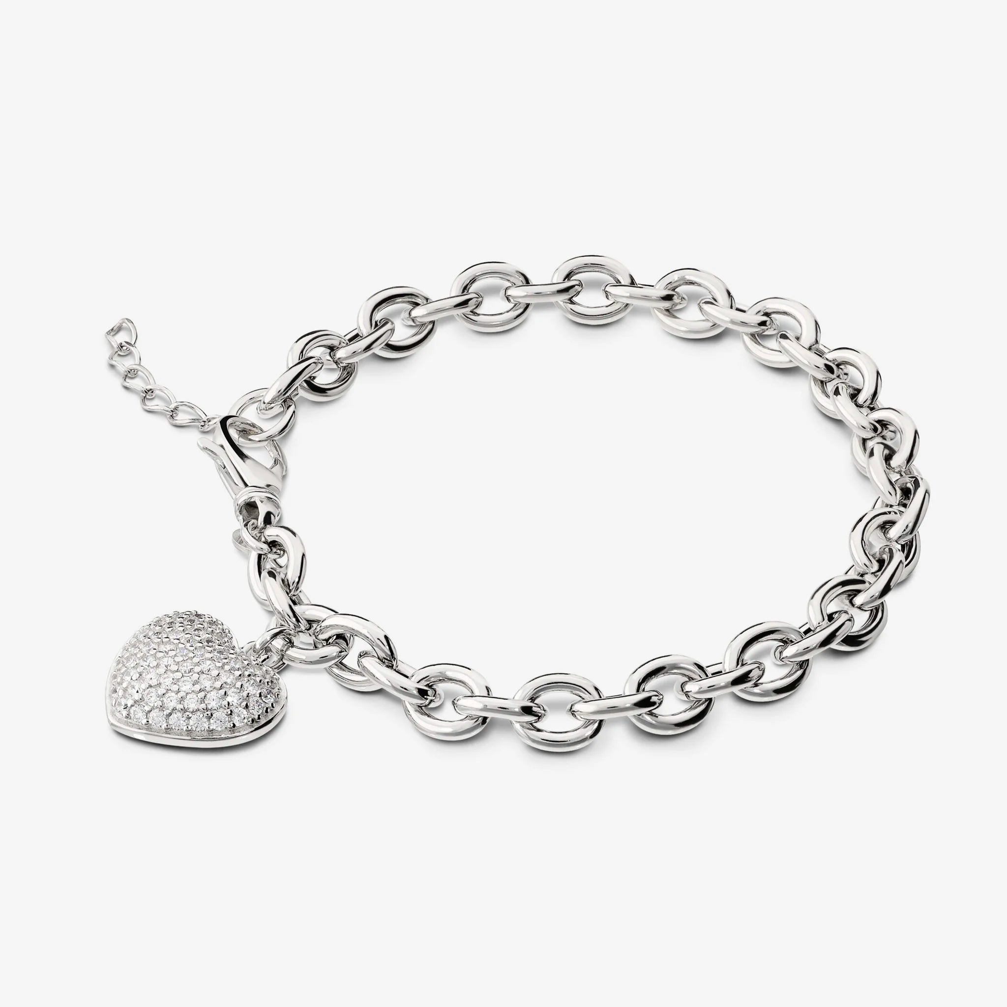 Armband aus 925er Silber plattiert mit Platin. Rolo-Glieder mit einem herzförmigen Anhänger (16x14 mm) aus Pavé mit Zirkonia, Qualität 'Luminosa'. Länge 18,5 + 2 cm Verlängerung. Karabinerverschluss.