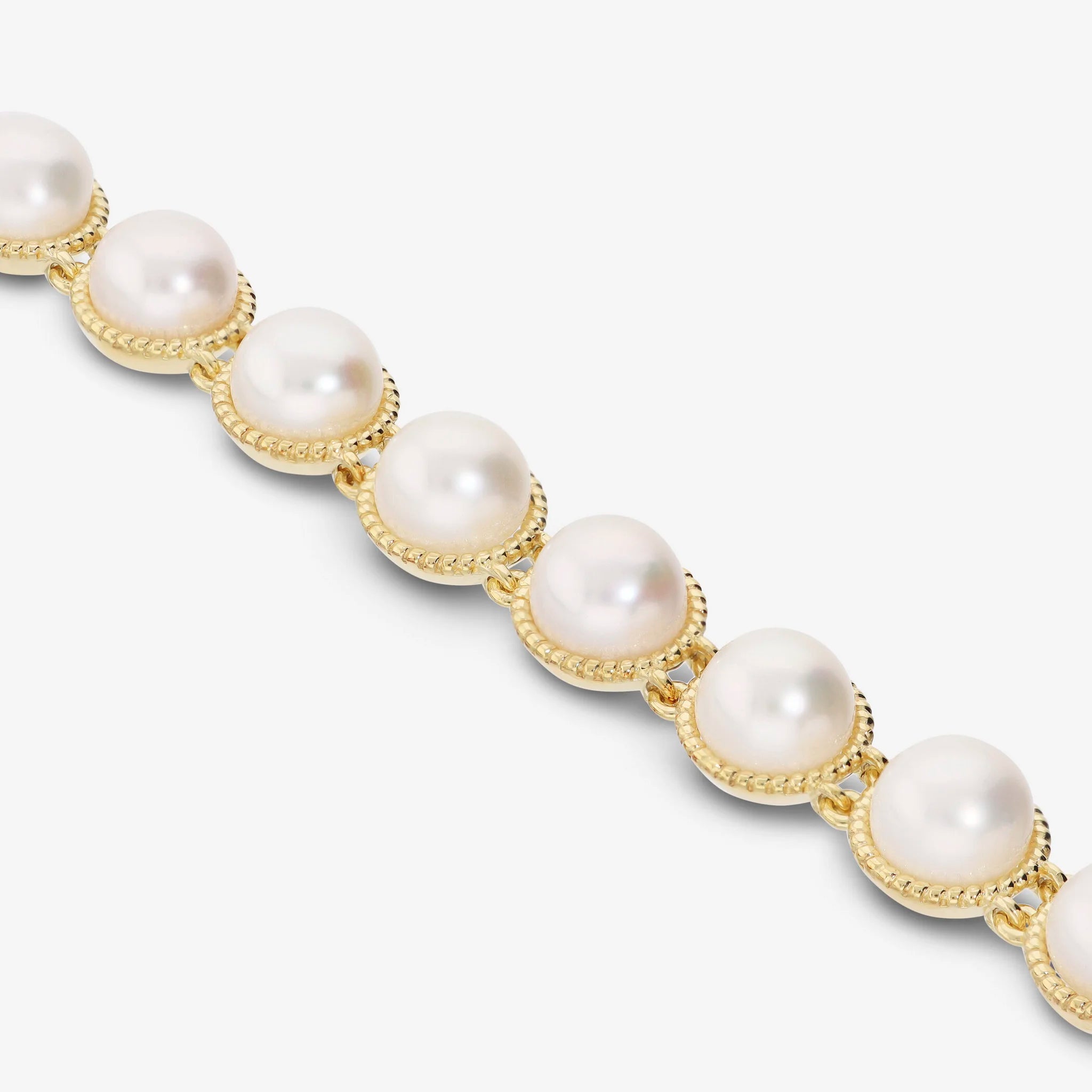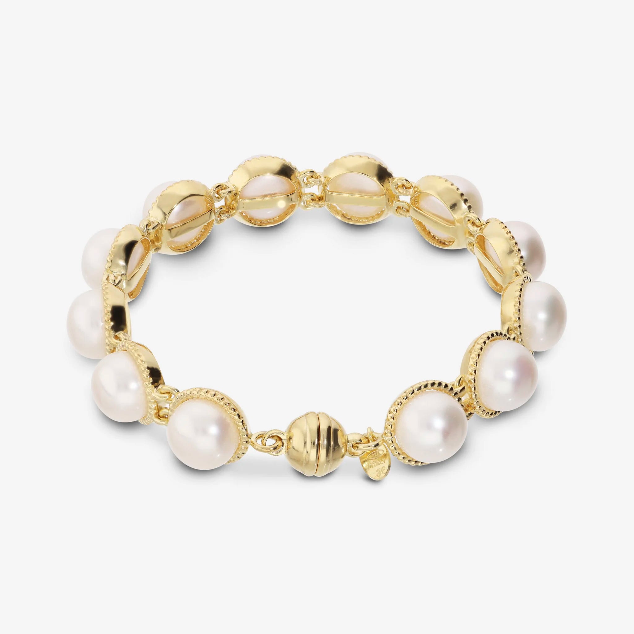 Tennisarmband aus 925er Silber, vergoldet mit 18 Karat Gelbgold, mit weißen Süßwasser-Zuchtperlen in Knopfform mit einem Durchmesser von ca. 9/9,5 mm und aufwendig gearbeiteter Fassung. Erhältlich in zwei Größen: Small/Medium (17,5 cm) und Large (19 cm). Magnetverschluss.