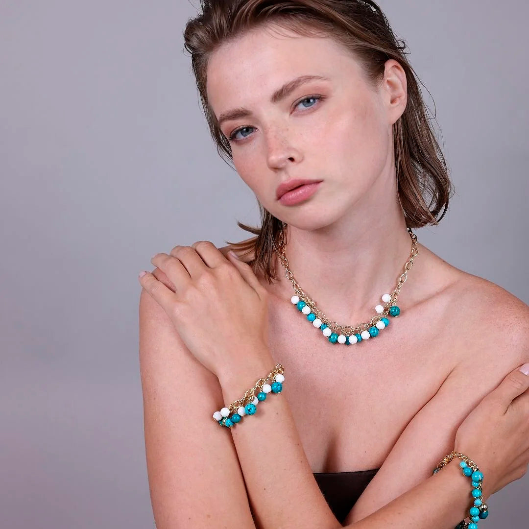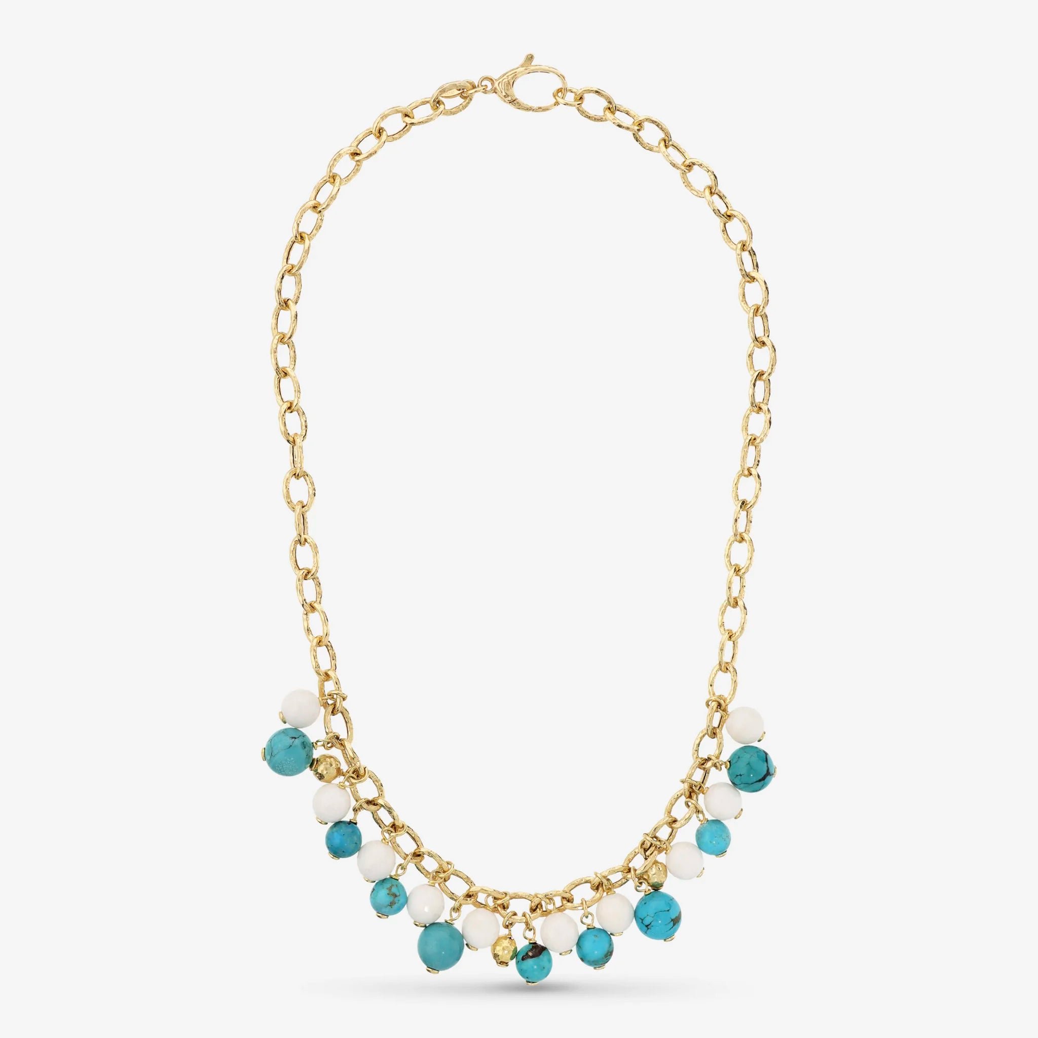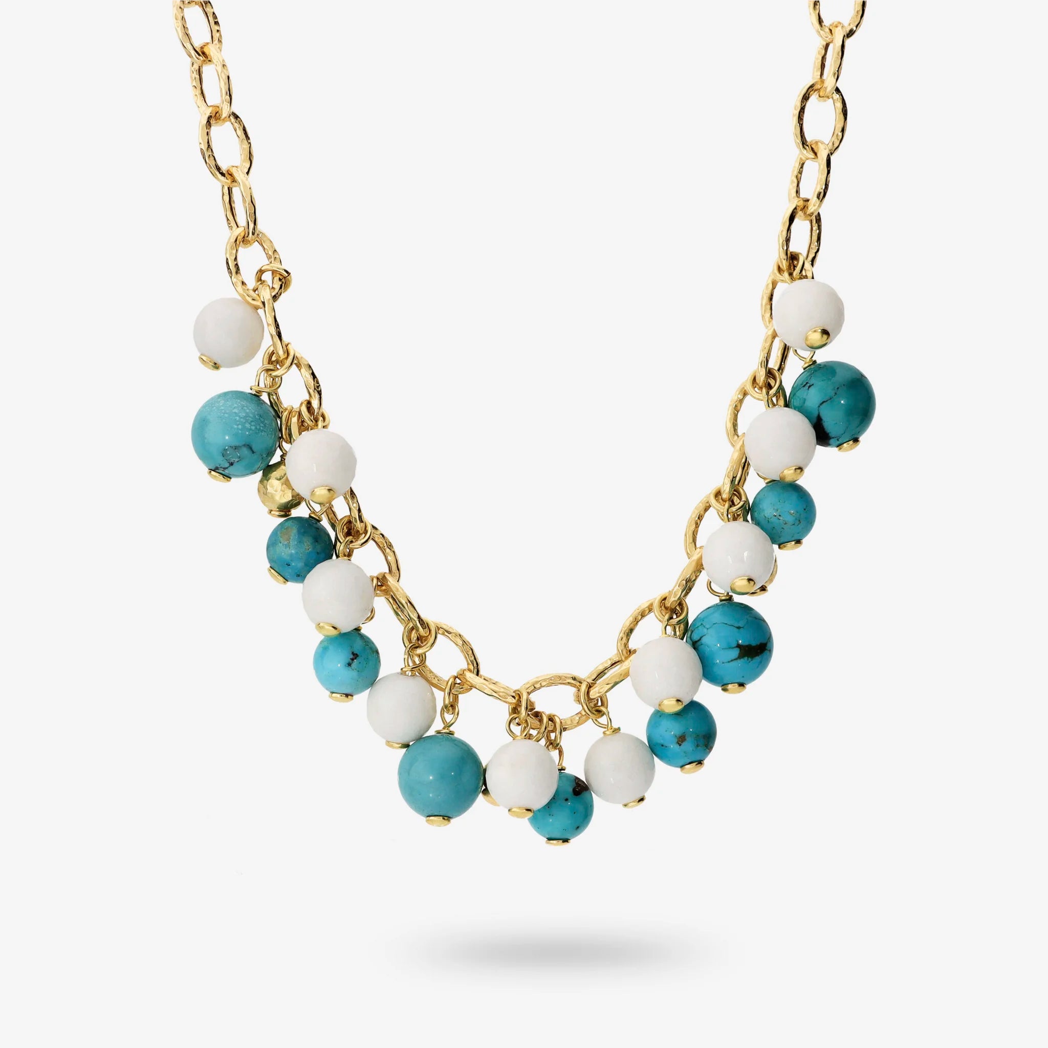 Choker-Halskette aus 18-karätigem, mit Gelbgold vergoldetem 925er-Silber. Ovales Rolo-Geflecht, leicht gehämmert mit natürlichen Türkissteinen (8/10 mm) und facettiertem weißem Quarzit (8 mm). Länge 45,5 cm. Gehämmerter Karabinerverschluss, der an jedem Hemd befestigt werden kann.