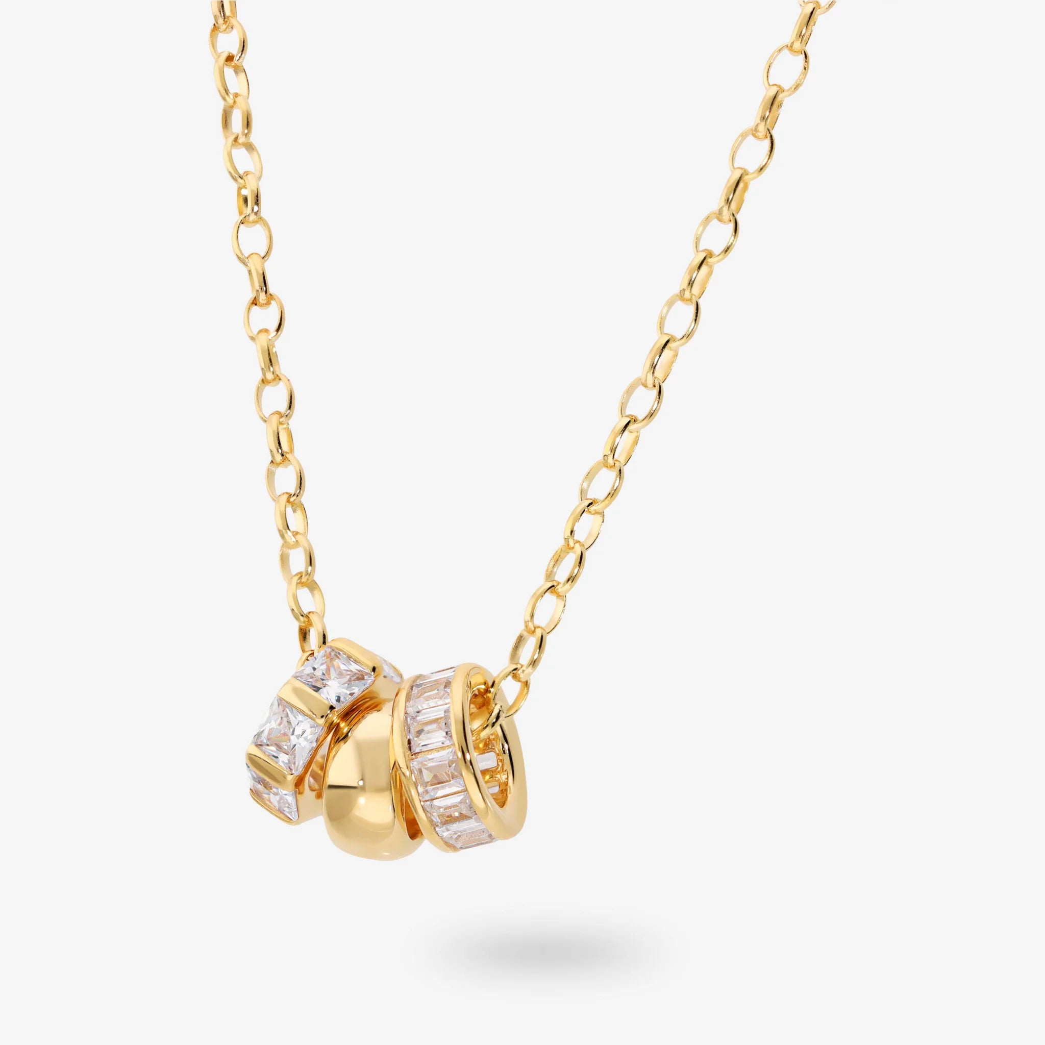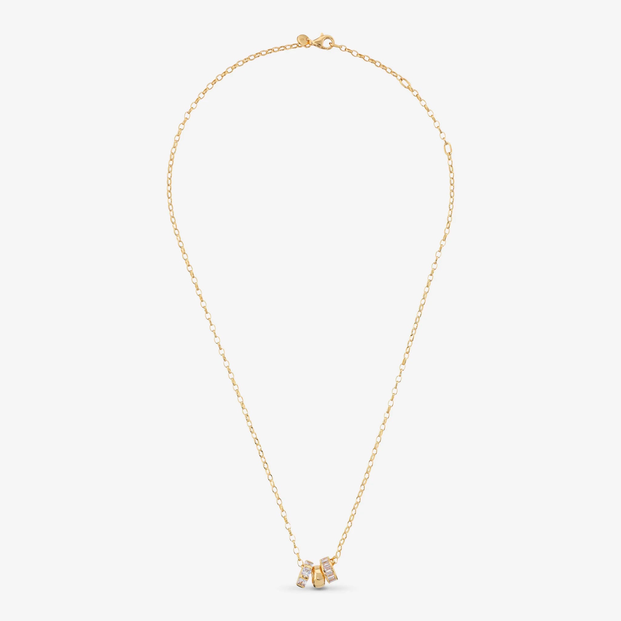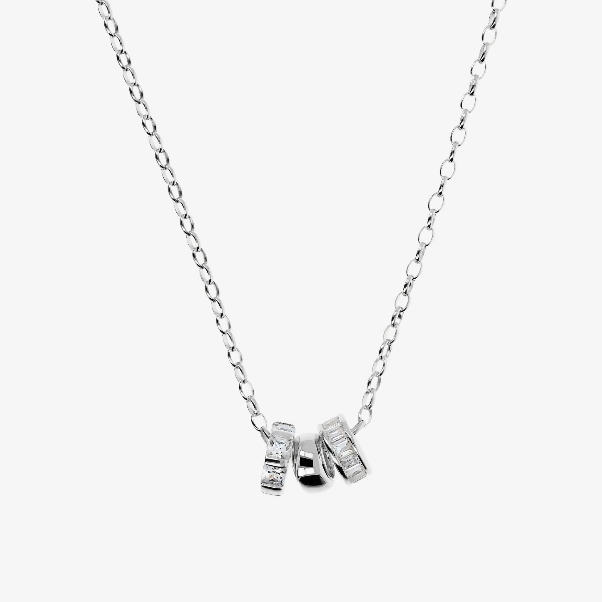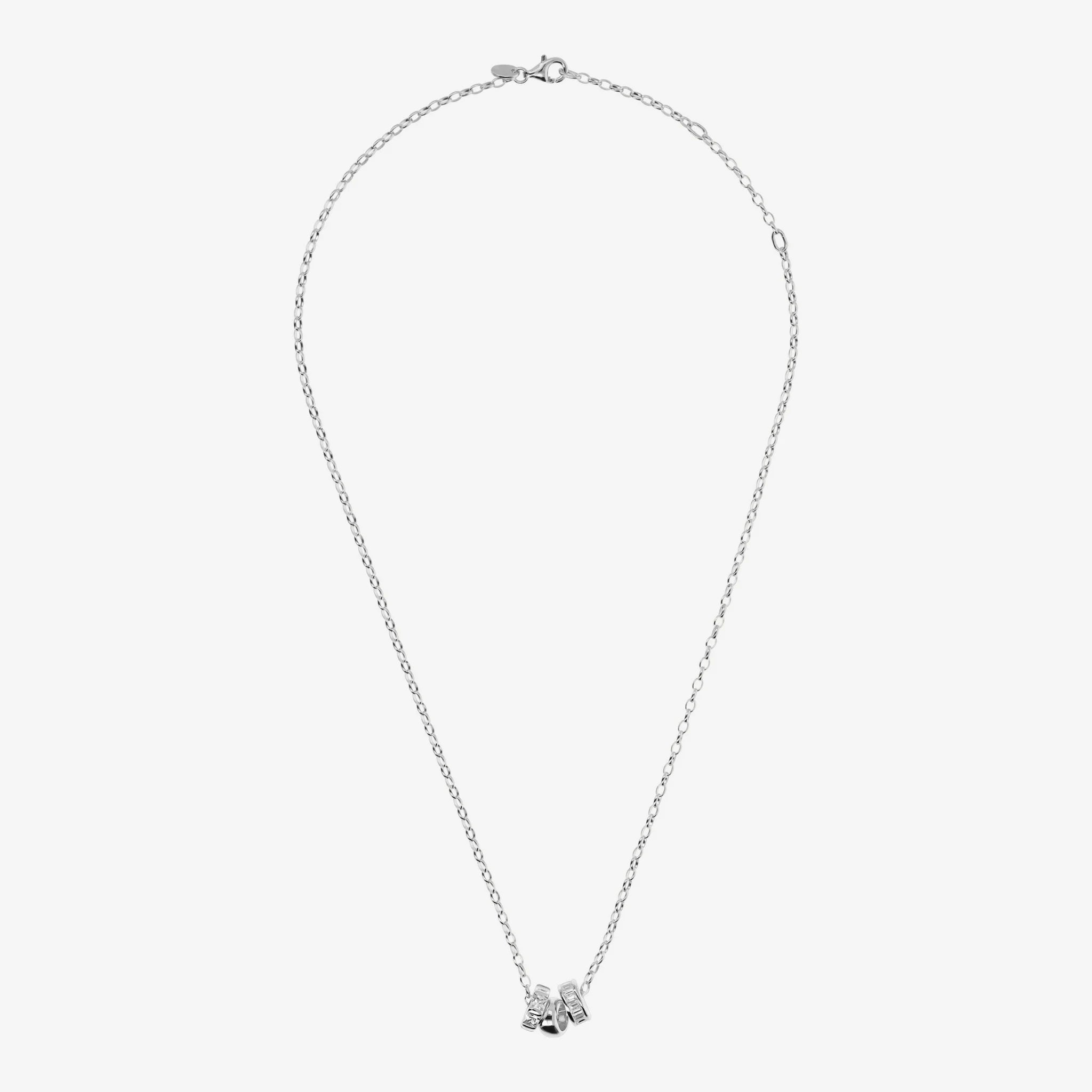 Trilogie-Halskette aus 925er Silber. Rolo-Glieder mit Anhänger bestehend aus einer glänzenden Unterlegscheibe und zwei Unterlegscheiben mit kubischen Zirkonia, Qualität „Luminous“, mit Carré- (3 x 3 mm) und Baguette-Schliff (2,5 x 2 mm) entsprechend 0,9 ct. Länge 45 cm mit Ringen bei 40 cm und 42,5 cm. Karabinerverschluss.