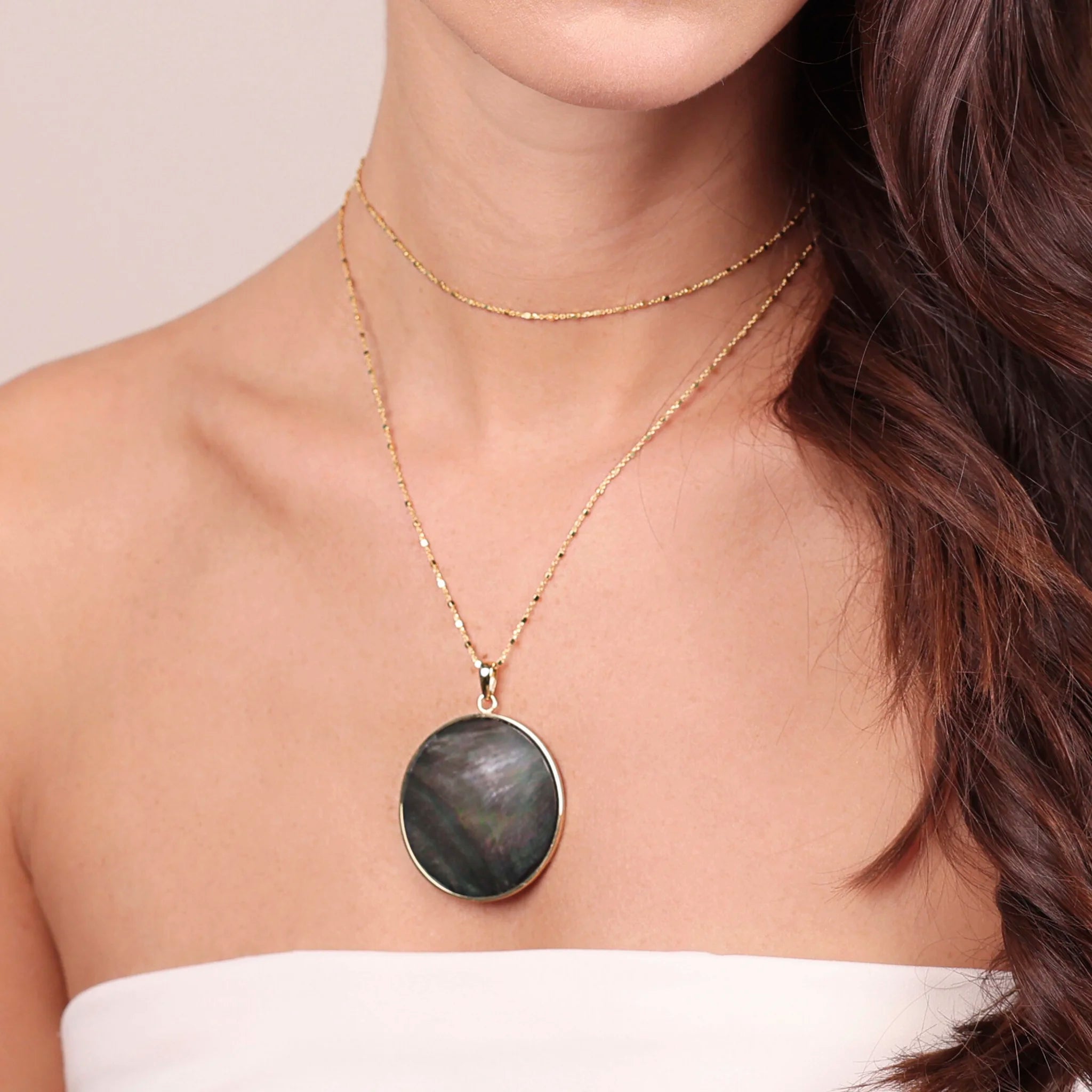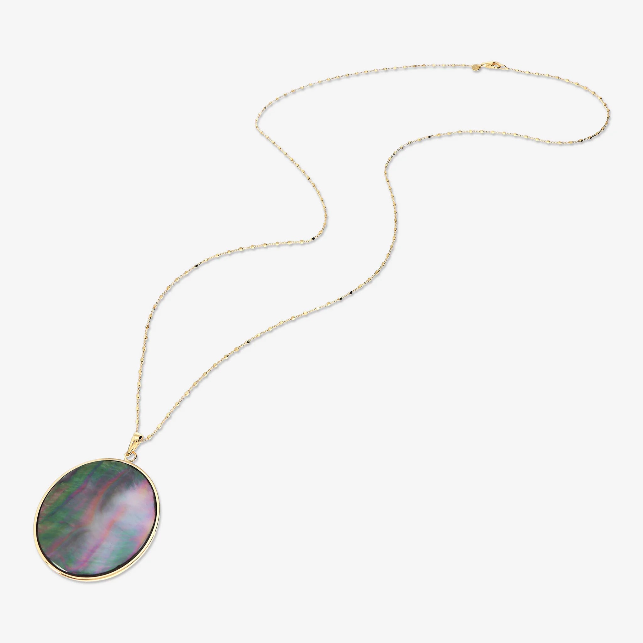 80 cm lange Halskette aus 18 Karat Gelbgold vergoldetem 925er Silber mit abnehmbarem runden Anhänger aus grauem Perlmutt-Naturstein (40 mm). Karabinerverschluss.