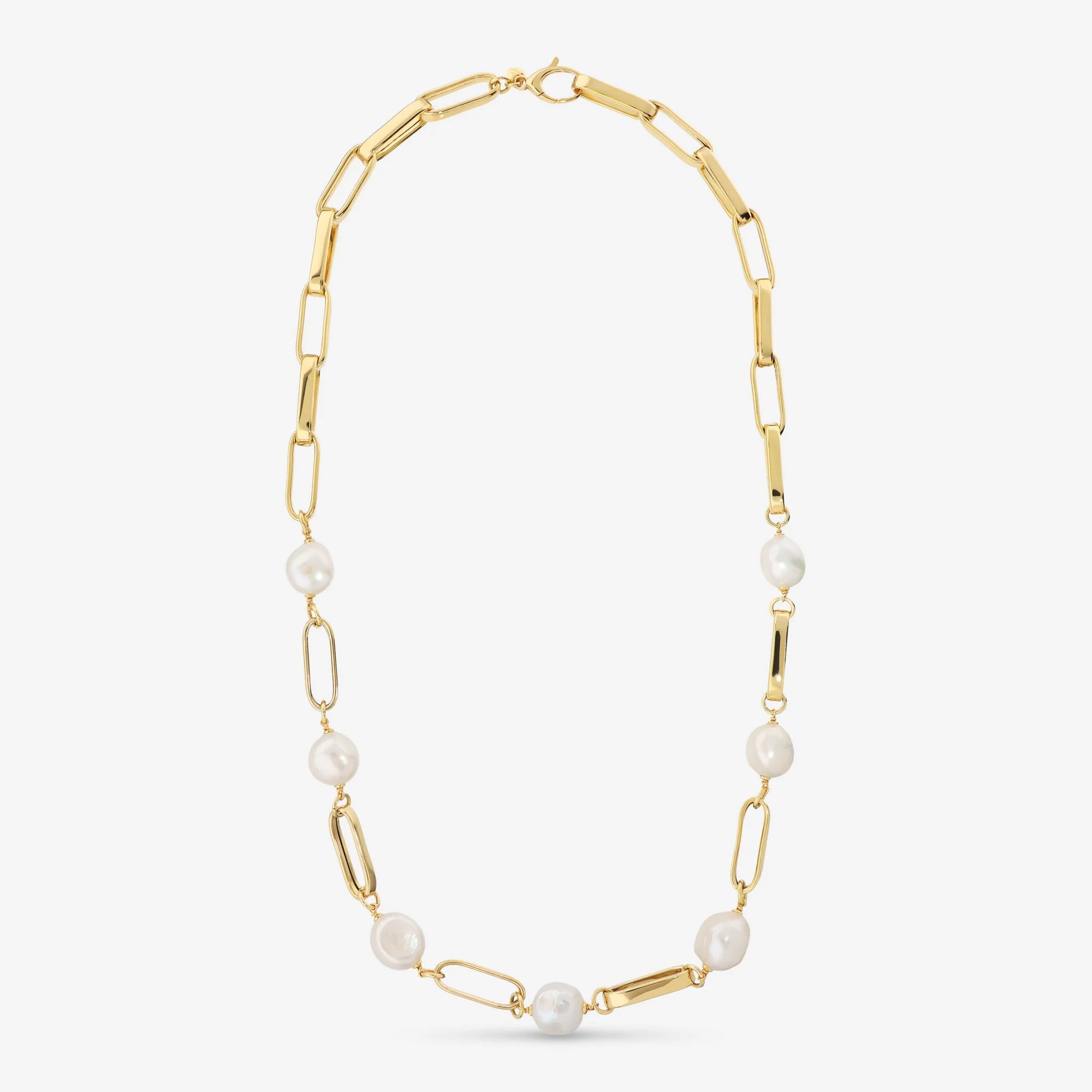 Lange Halskette aus 18 Karat Gelbgold vergoldetem 925er Silber. Längliche ovale Glieder mit sieben weißen barocken Süßwasser-Zuchtperlen mit einem Durchmesser von ca. 12/14 mm. Länge 60 cm. Tropfenförmiger Karabinerverschluss, der an jedem Hemd befestigt werden kann. Schmuckstück aus der Sonderedition „Perlaviva Couture“.