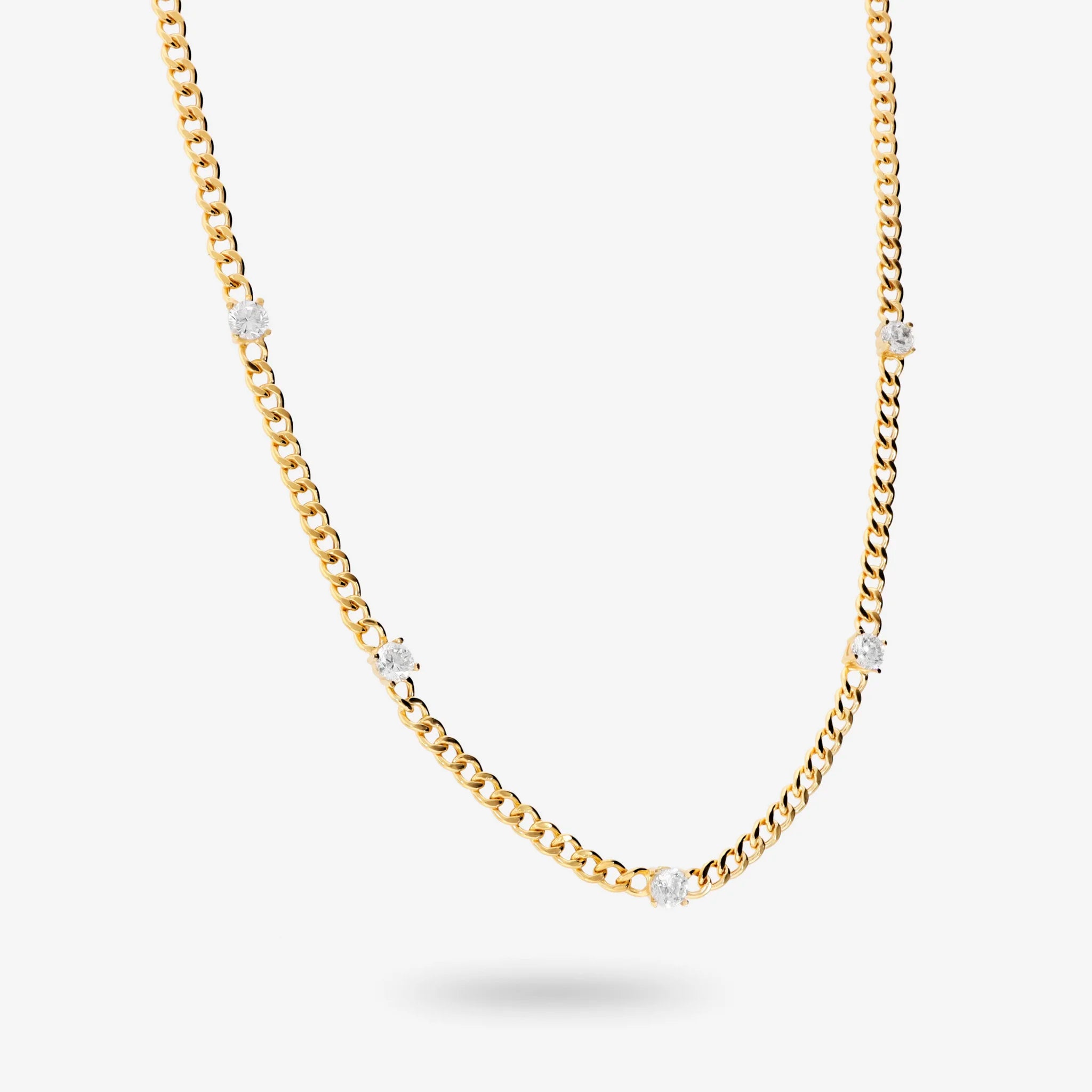Halskette aus 925er Silber, vergoldet mit 18 Karat Gelbgold. Panzerkettenglieder veredelt mit Cubic Zirkonia, Qualität "Luminosa", mit 2,5 ct. Länge 46 cm. Karabinerverschluss.