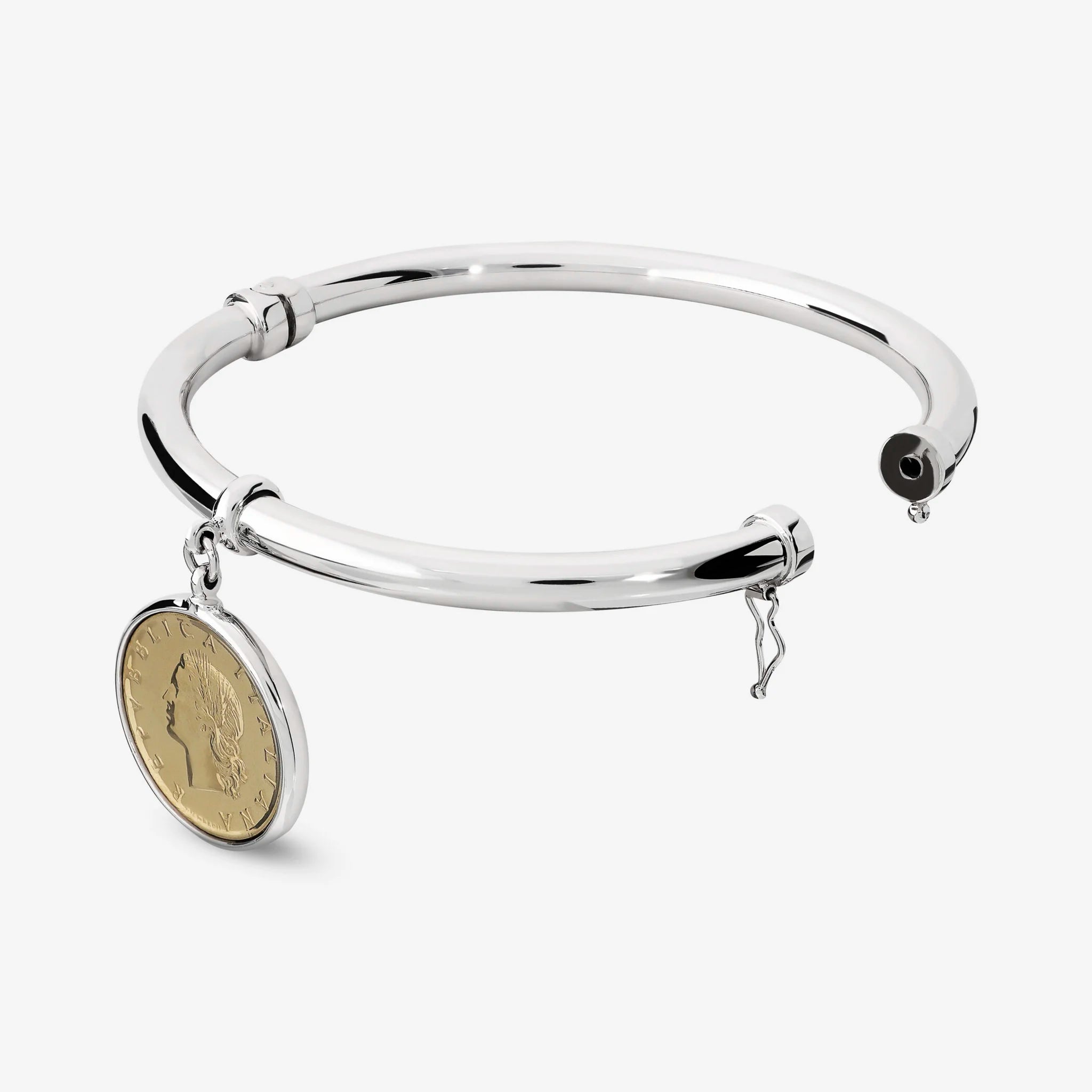 Bracciale rigido in Argento 925 placcato Platino con ciondolo in moneta da 20 Lire originale. Spessore di circa 5 mm. Dotato di snodo. Chiusura a incastro con otto di sicurezza. Diametro interno 62x55 mm.