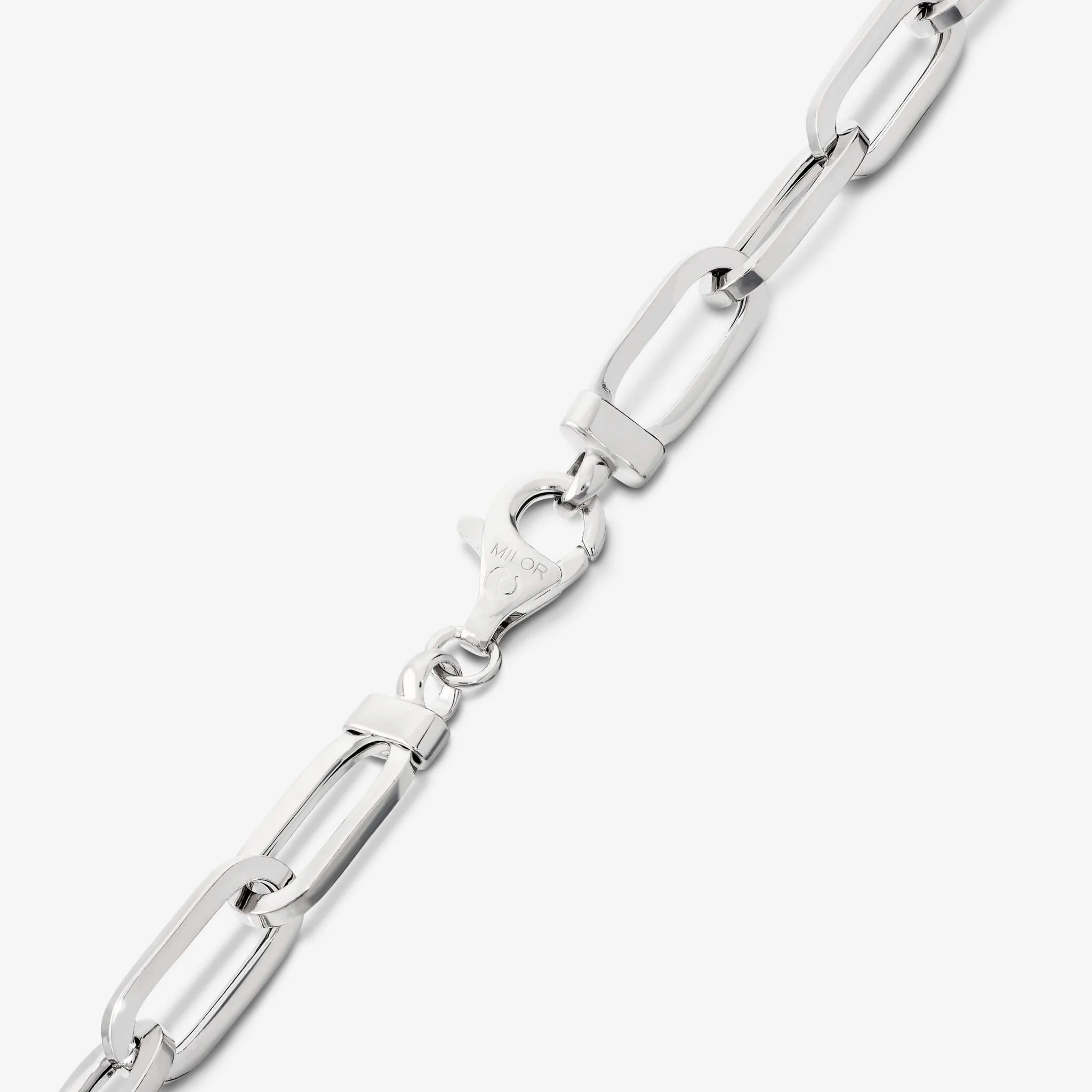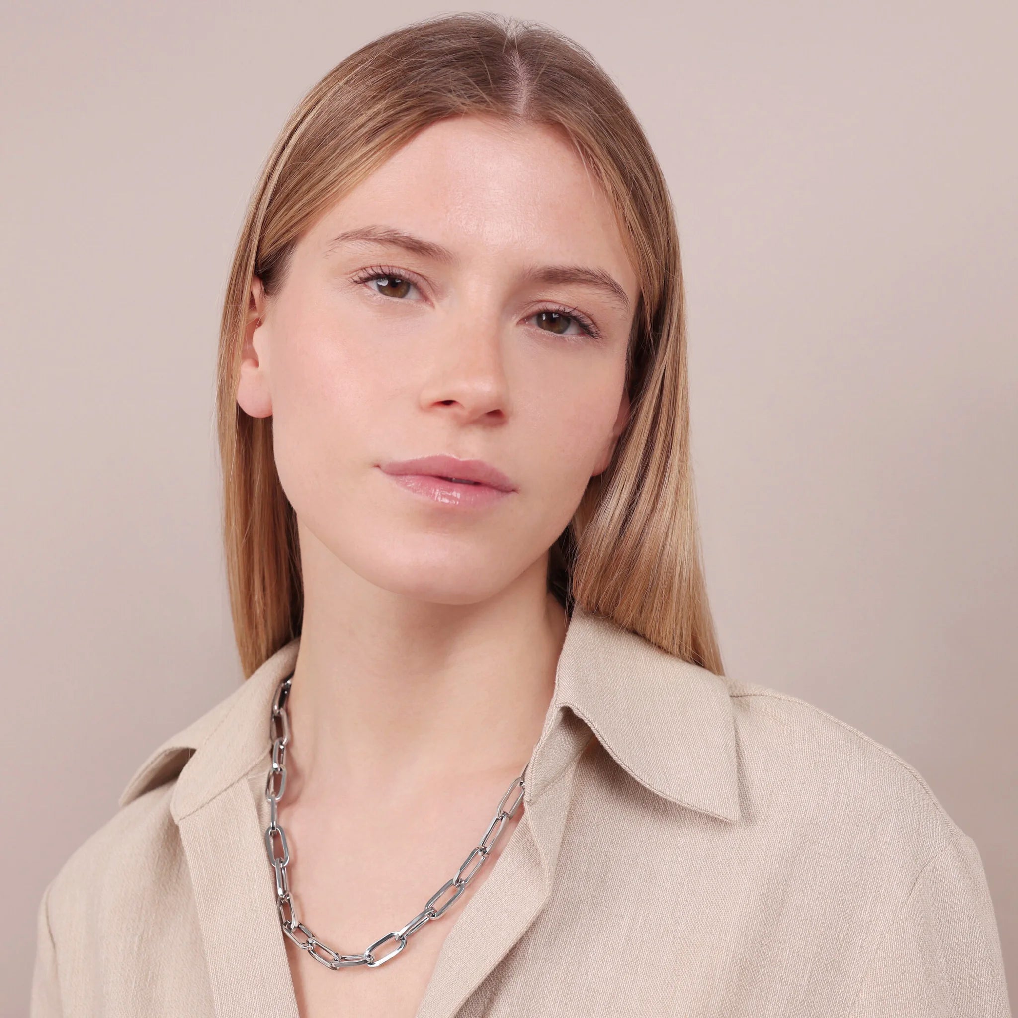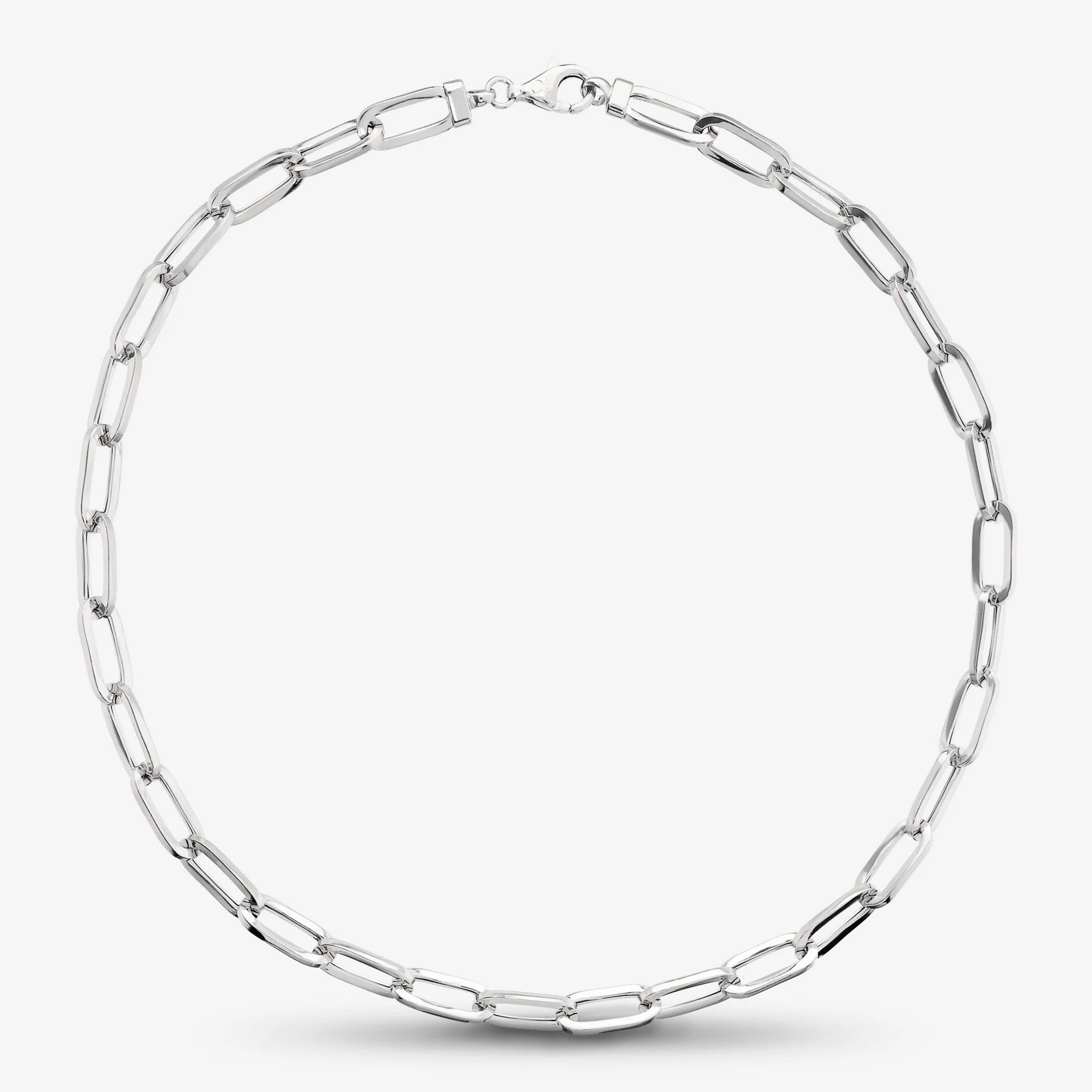 Halskette aus 925er Silber plattiert mit Platin. Oval verlängertes Glied (18x8 mm). Hochglanz-Finish. Länge 51 cm. Karabinerverschluss.