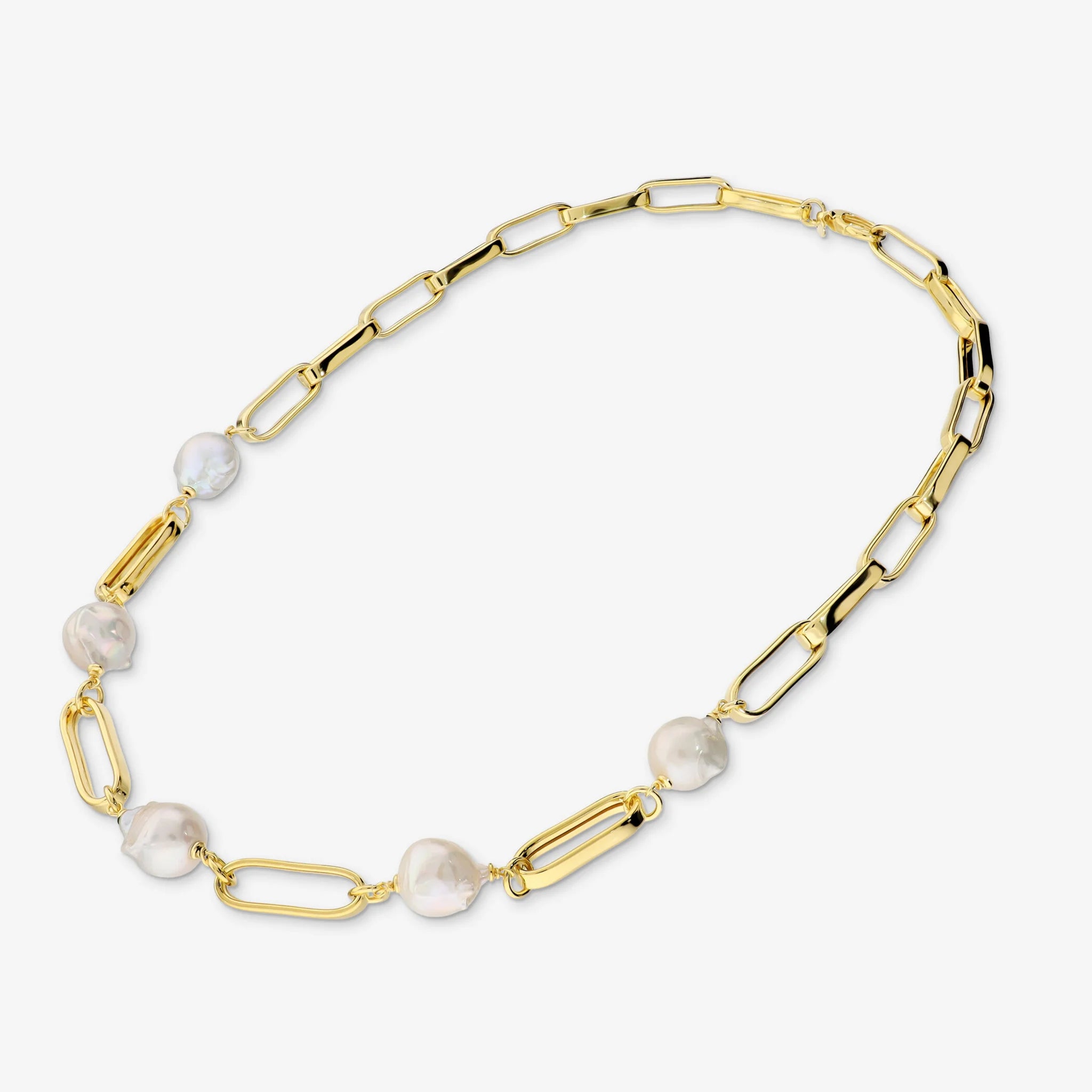 Collana girocollo realizzata in lega Golden placcata Oro giallo 18kt. Maglie ovali allungate con cinque perle Scaramazze bianche coltivate d'acqua dolce con diametro di circa 12/13 mm. Lunghezza 59 cm. Chiusura a moschettone a goccia agganciabile in qualsiasi maglia.