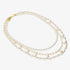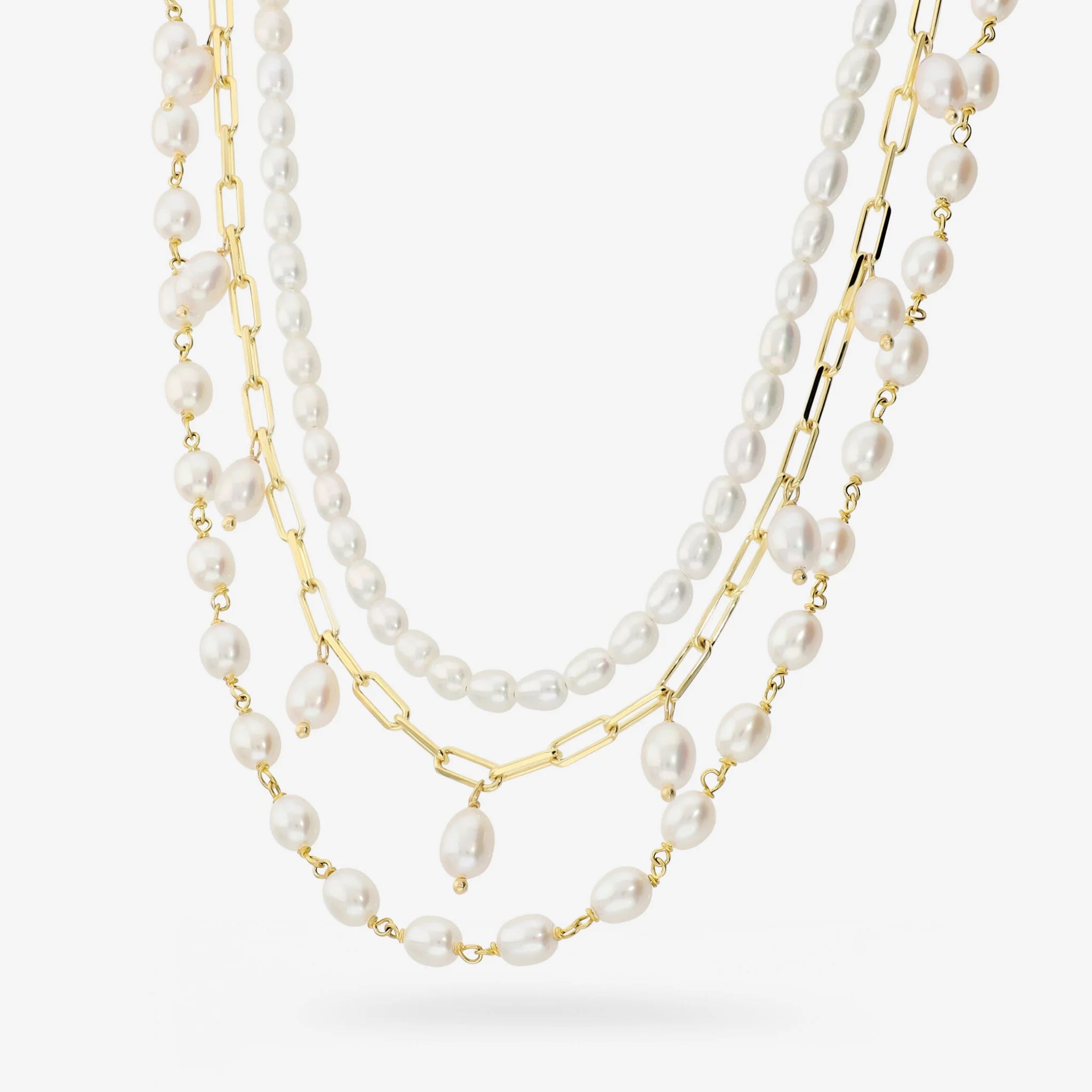 Set di tre collane realizzate in lega Golden, placcata Oro giallo 18kt, composto da un girocollo (45cm) di perle bianche a pepita (5x4mm); da una collana (50cm) con maglie ovali lucide e charms di perle bianche (6x5mm) e da una collana lunga (56cm) con maglia a rosario di perle bianche (4x5mm). Chiusura a moschettone.