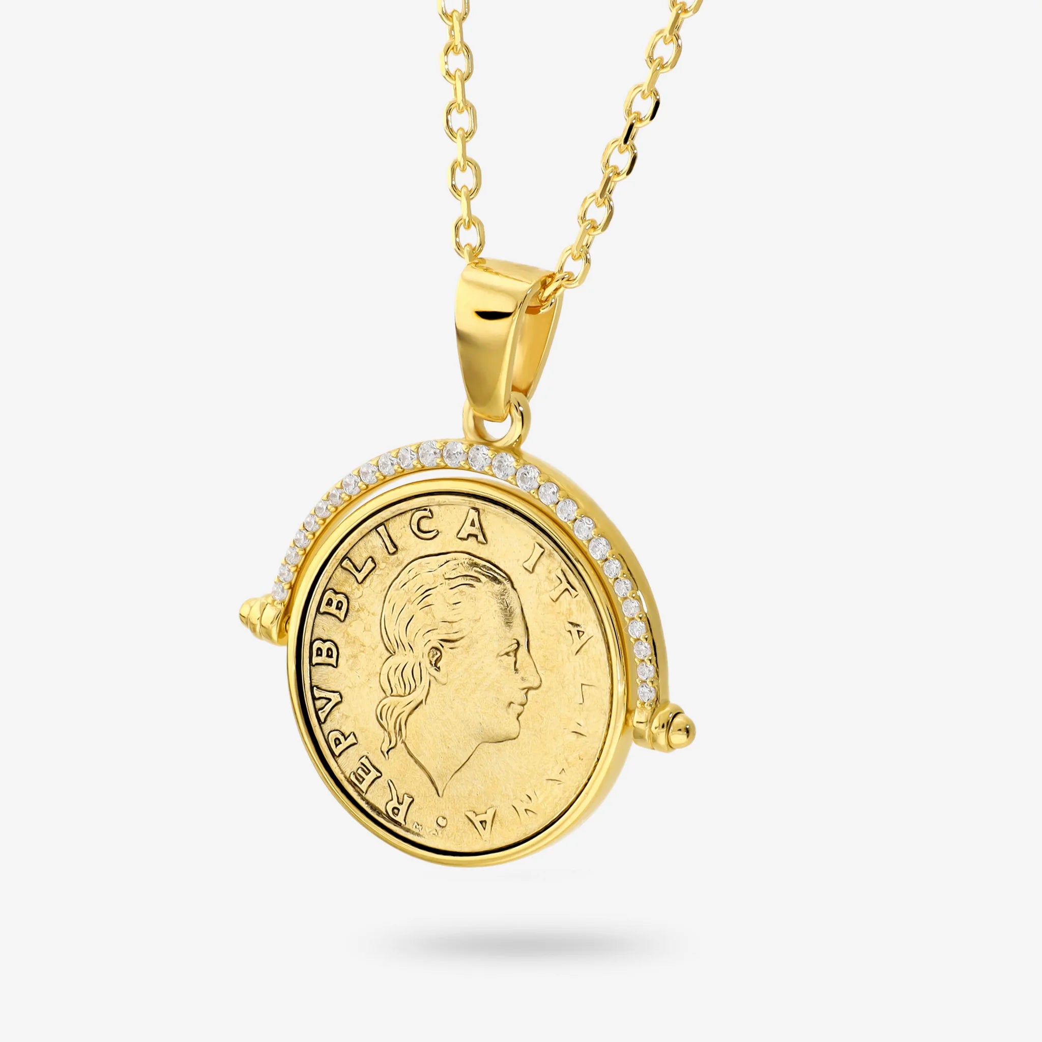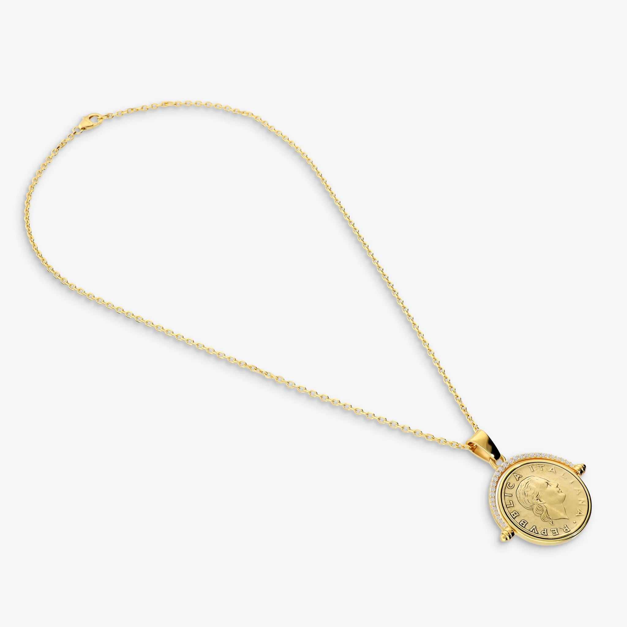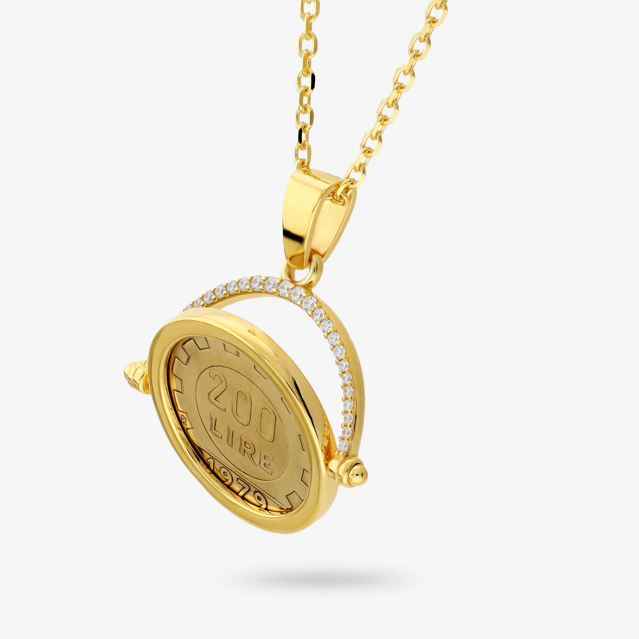 Halskette aus 925er Silber, vergoldet mit 18 Karat Gelbgold. Glitzernde Kettenglieder mit drehbarem Anhänger, veredelt mit Cubic Zirkonia der Qualität "Luminosa" im Gewicht von 0,42 ct, mit 200-Lire-Münze (24 mm). Länge 45,5 cm. Karabinerverschluss.