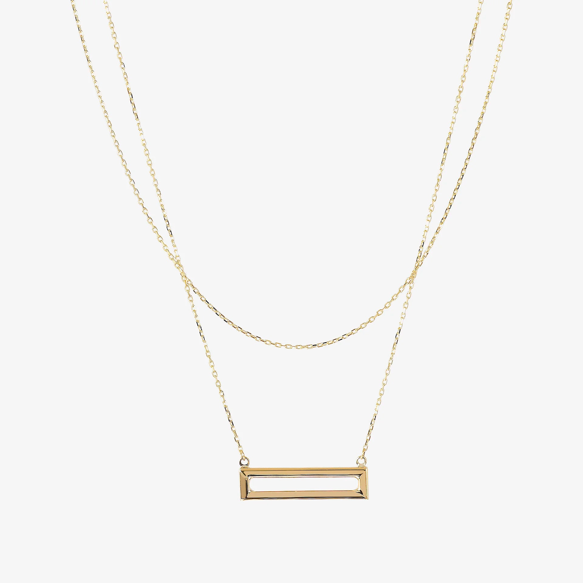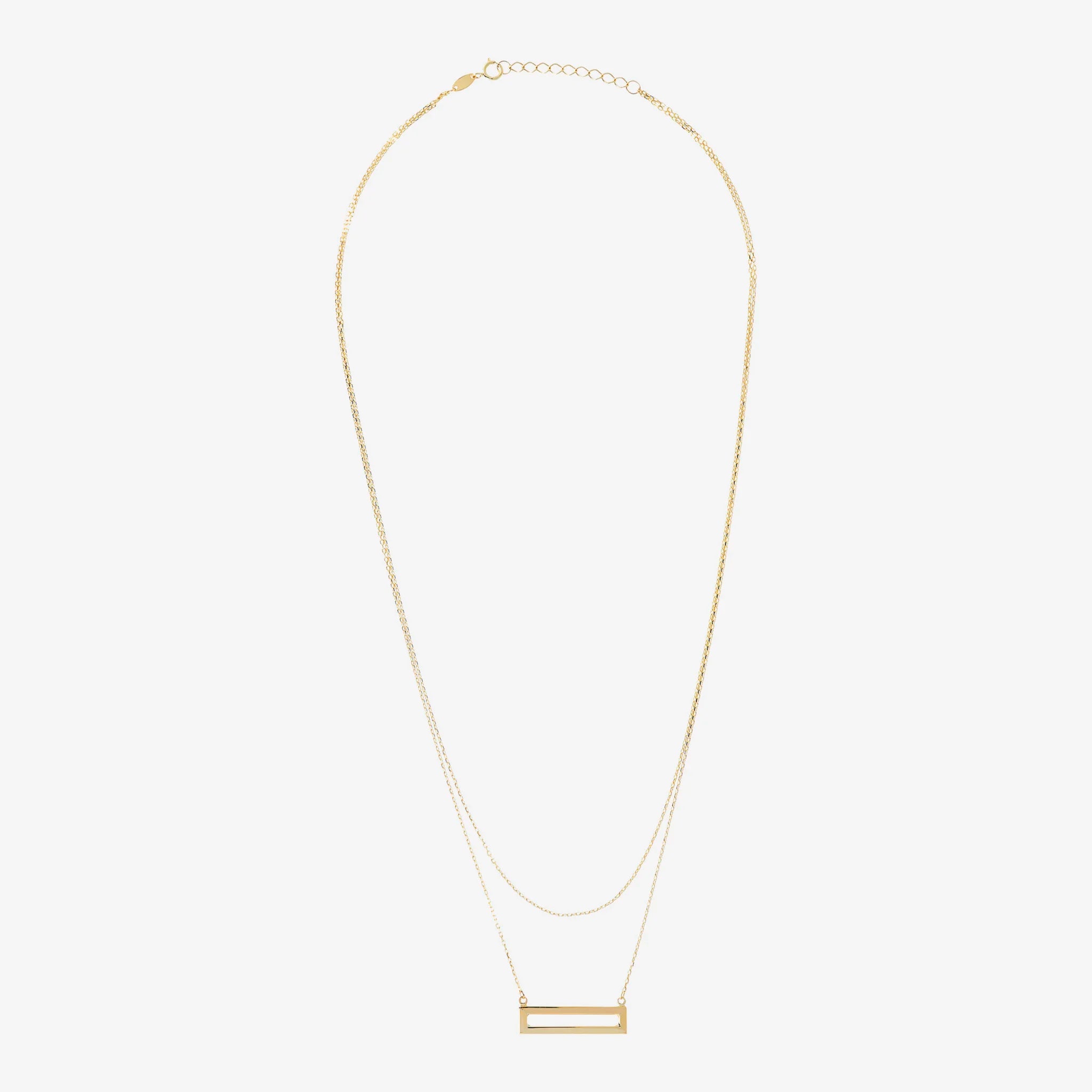 The 9Kt Gold Double Rectangular Design Pendant Necklace is graphic and pure. It has a double rolo chain element and a stylized pendant that makes it fresh and contemporary.