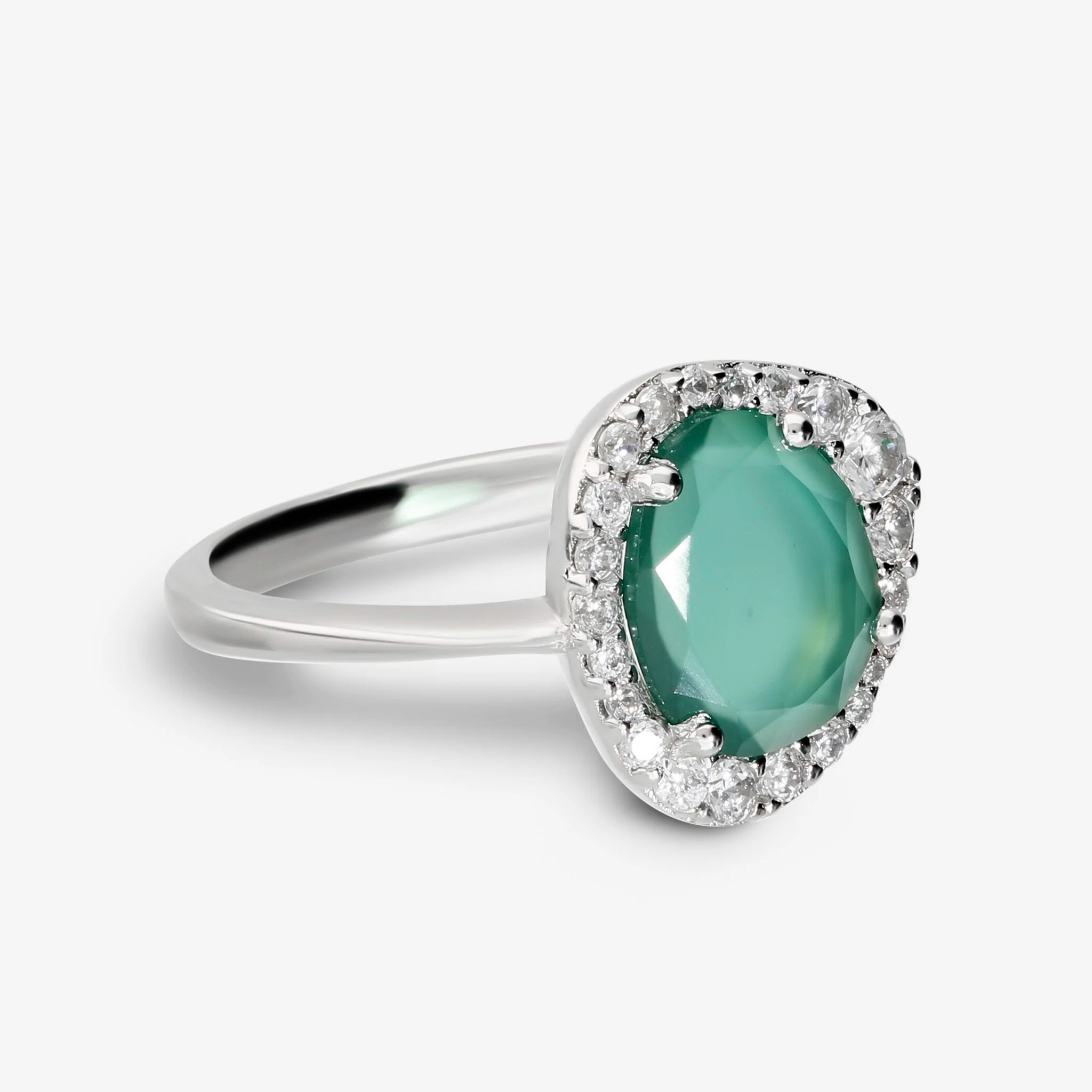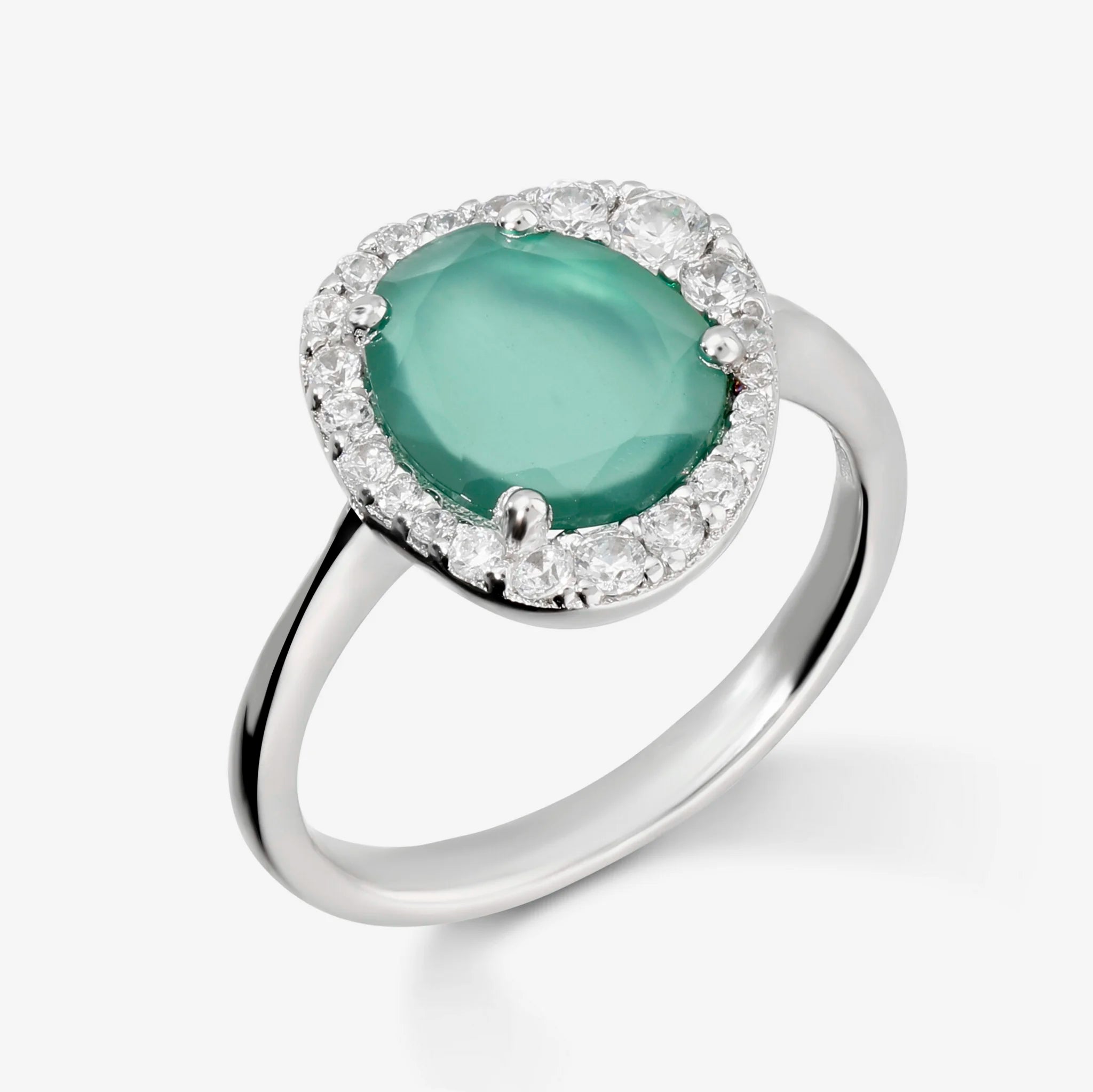Cocktail ring in 925 Silver, platinum plated, adorned with a natural faceted green chalcedony stone (13x14 mm) surrounded by pavé cubic zirconia, "Luminosa" quality, equal to ct.