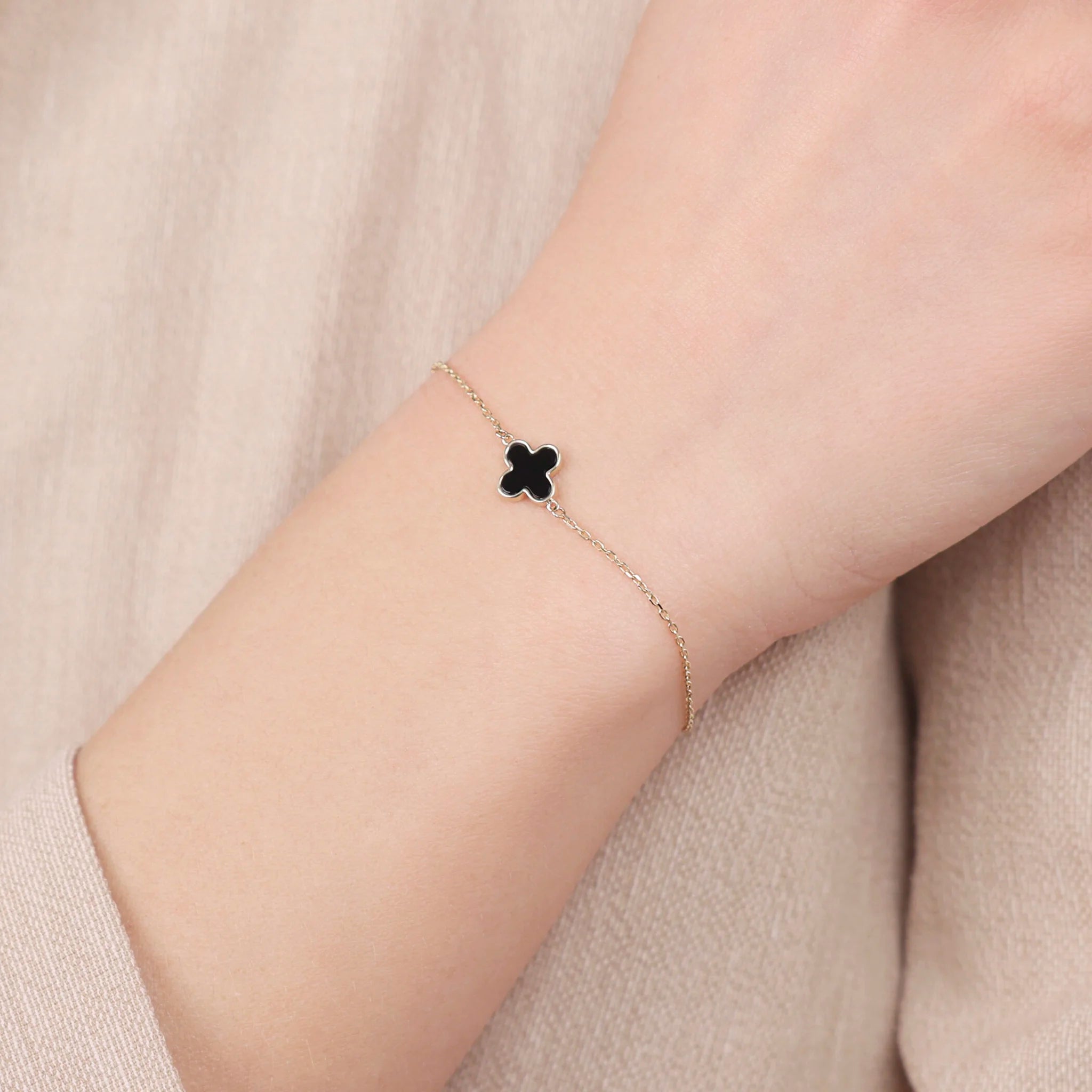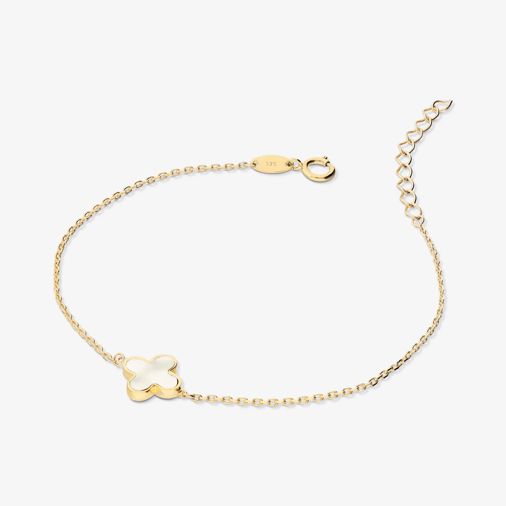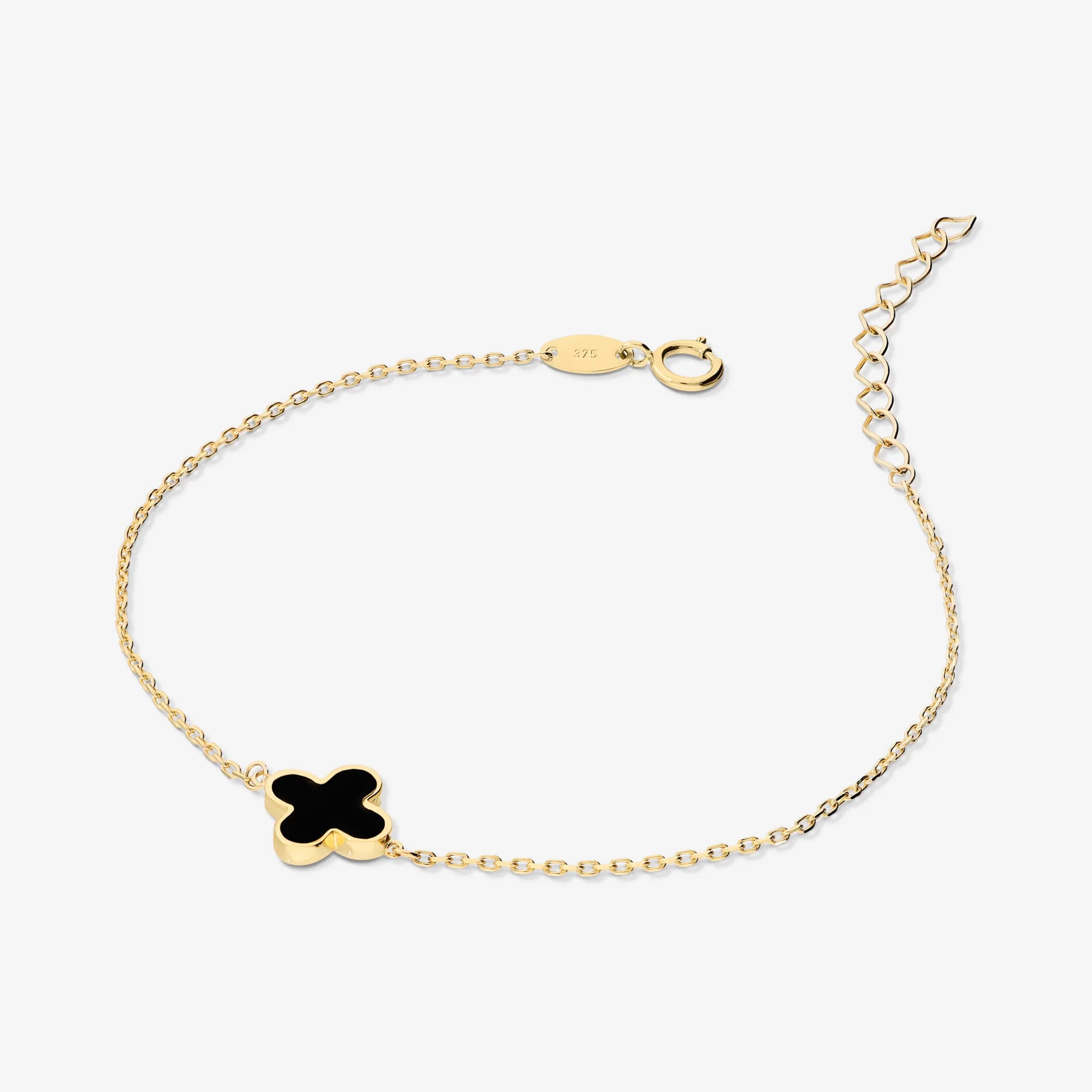 375/1000 Gold bracelet with glitter chain and clover-shaped pendant (8x8 mm) in natural stone. Length 15+3 cm extension. Spring ring closure.