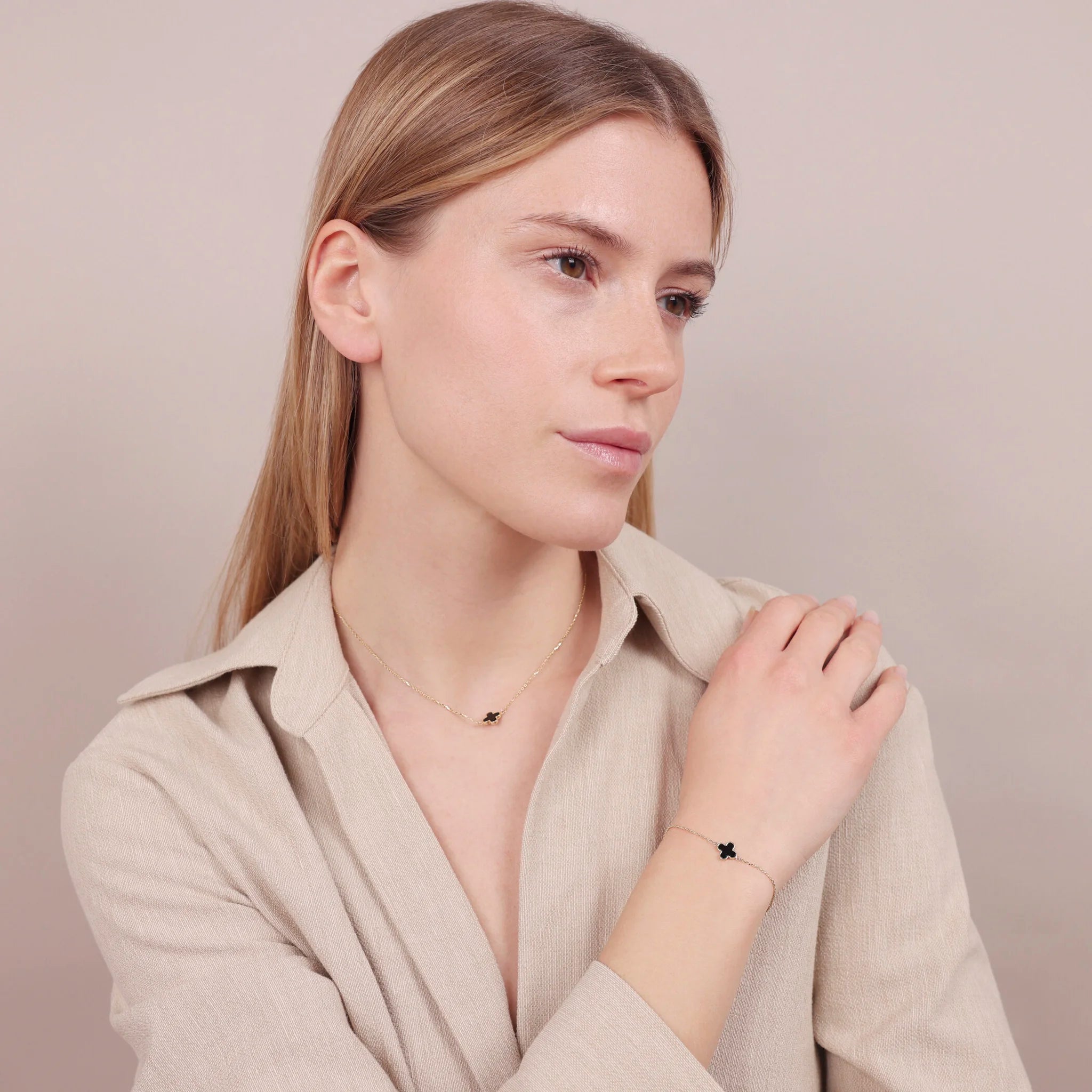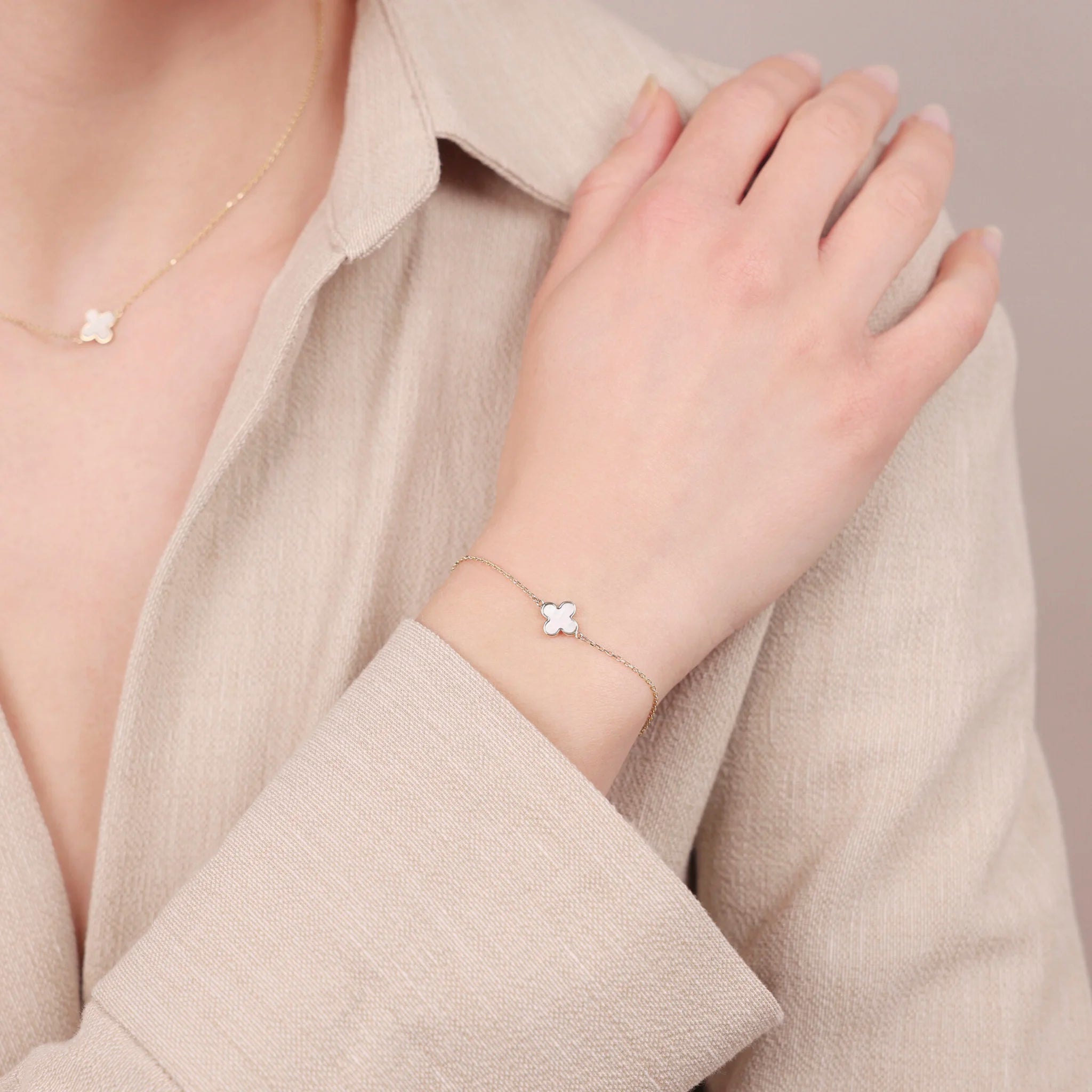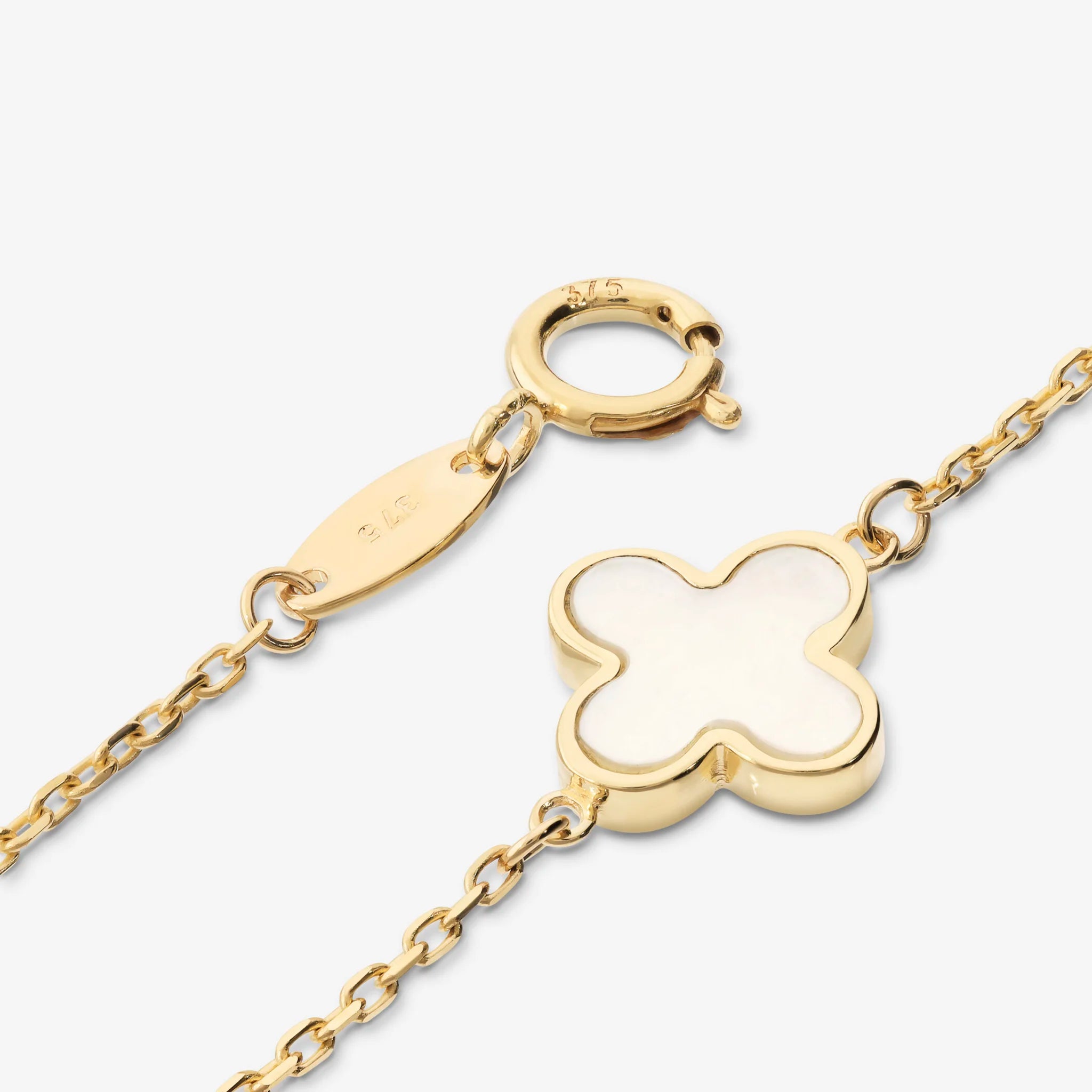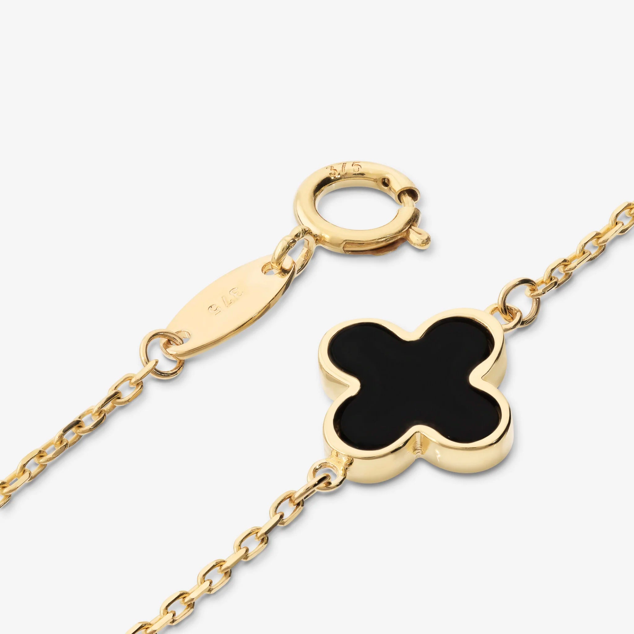 Gold 375 Glitter Link Bracelet with Natural Stone Clover