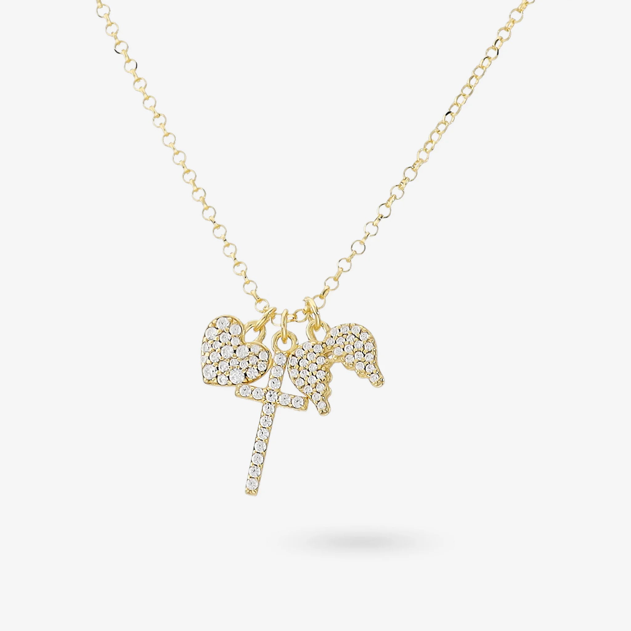 Collana in Argento 925 placcato Oro giallo 18kt. Maglia brillantina con triplo pendente (croce, ali e cuore) in pavé di cubic zirconia, qualità 'Luminosa', pari a 0.5ct. Chiusura a moschettone. Lunghezza totale 50cm con anellino interposto a 45.5cm.