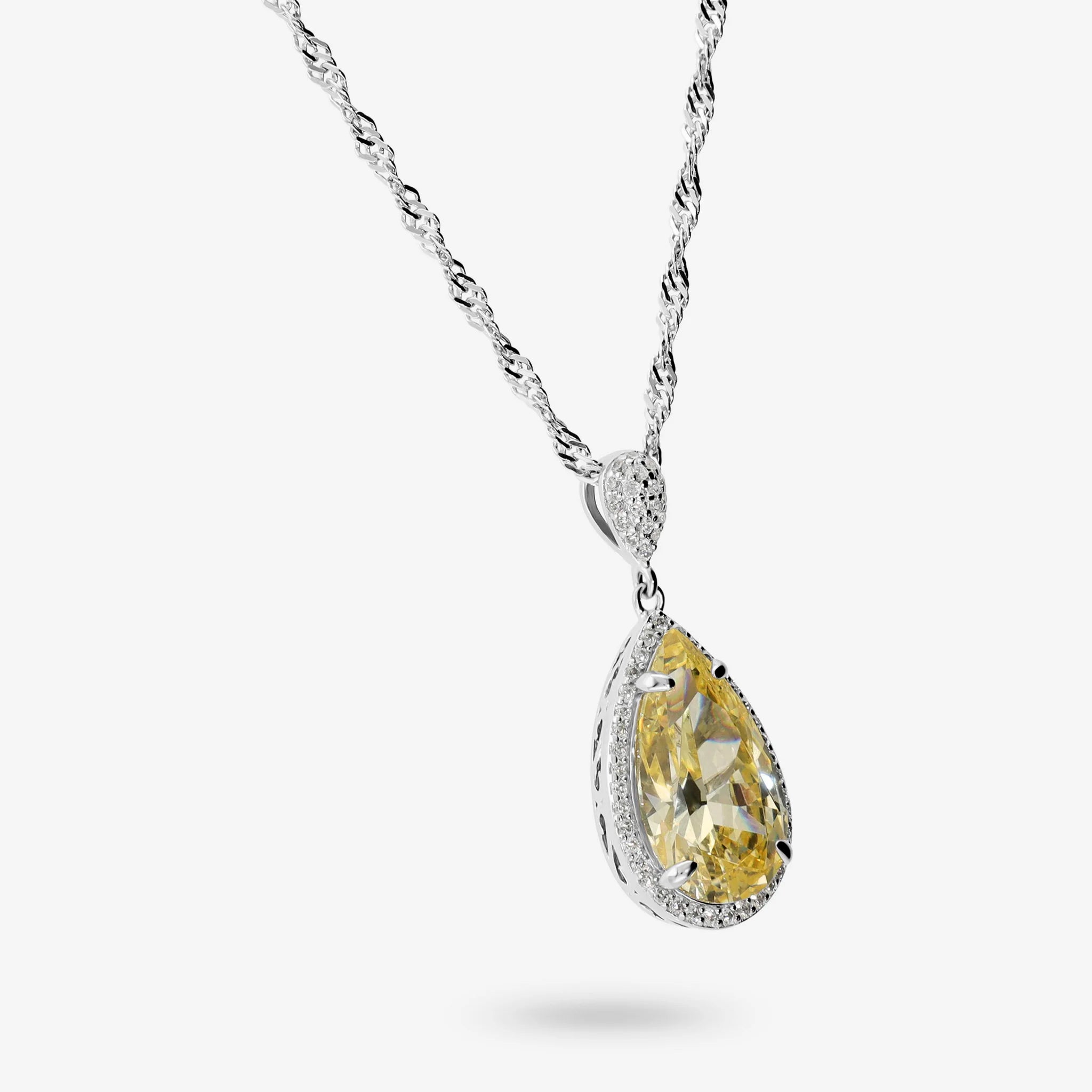 Collana in Argento 925 placcato Platino. Maglia Singapore con pendente a goccia (15x9 mm) in pietra gialla e pavé di cubic zirconia, qualità 'Luminosa'. Lunghezza 46 cm. Chiusura a moschettone.