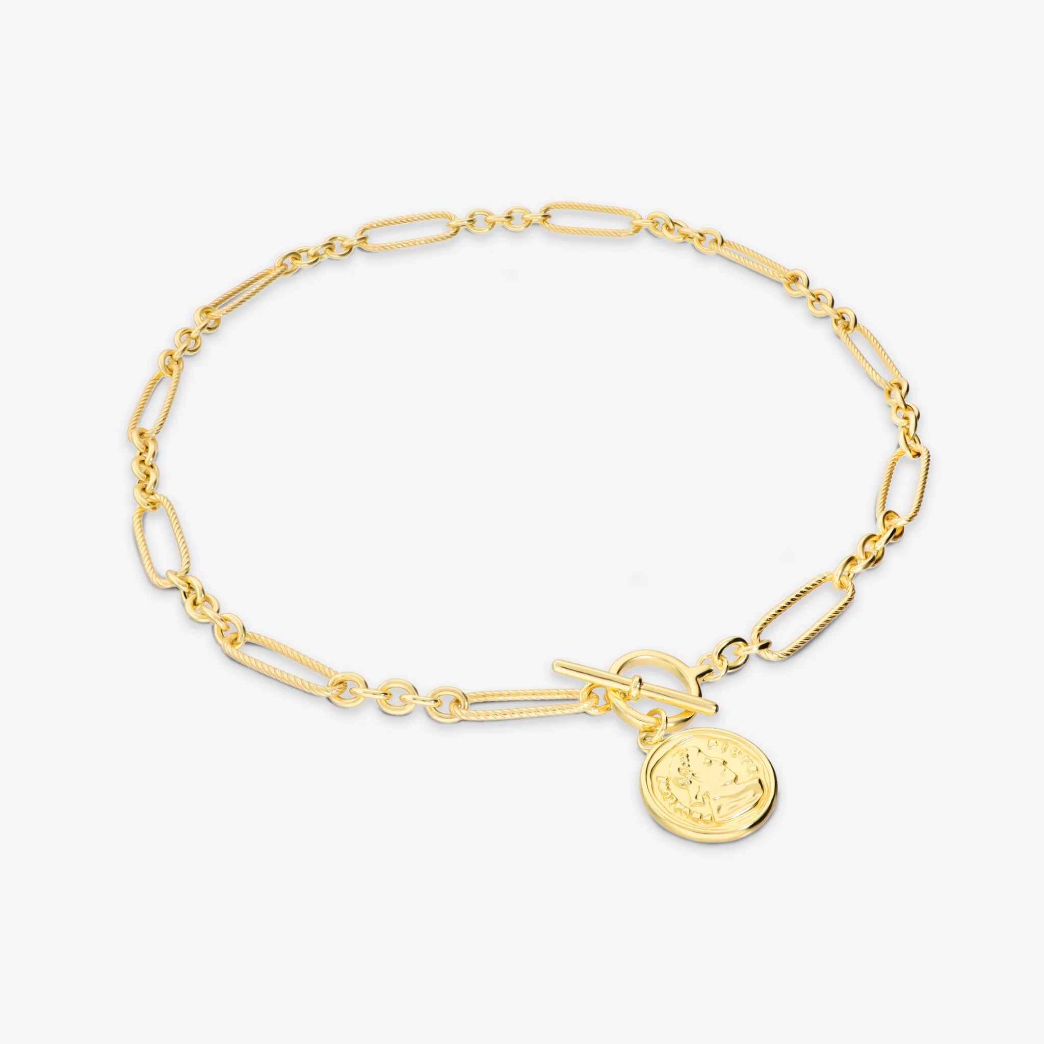 925 Silver choker necklace, plated with 18kt yellow gold, with alternating polished and twisted links and coin. Length 45 cm. 'T-Bar' clasp.