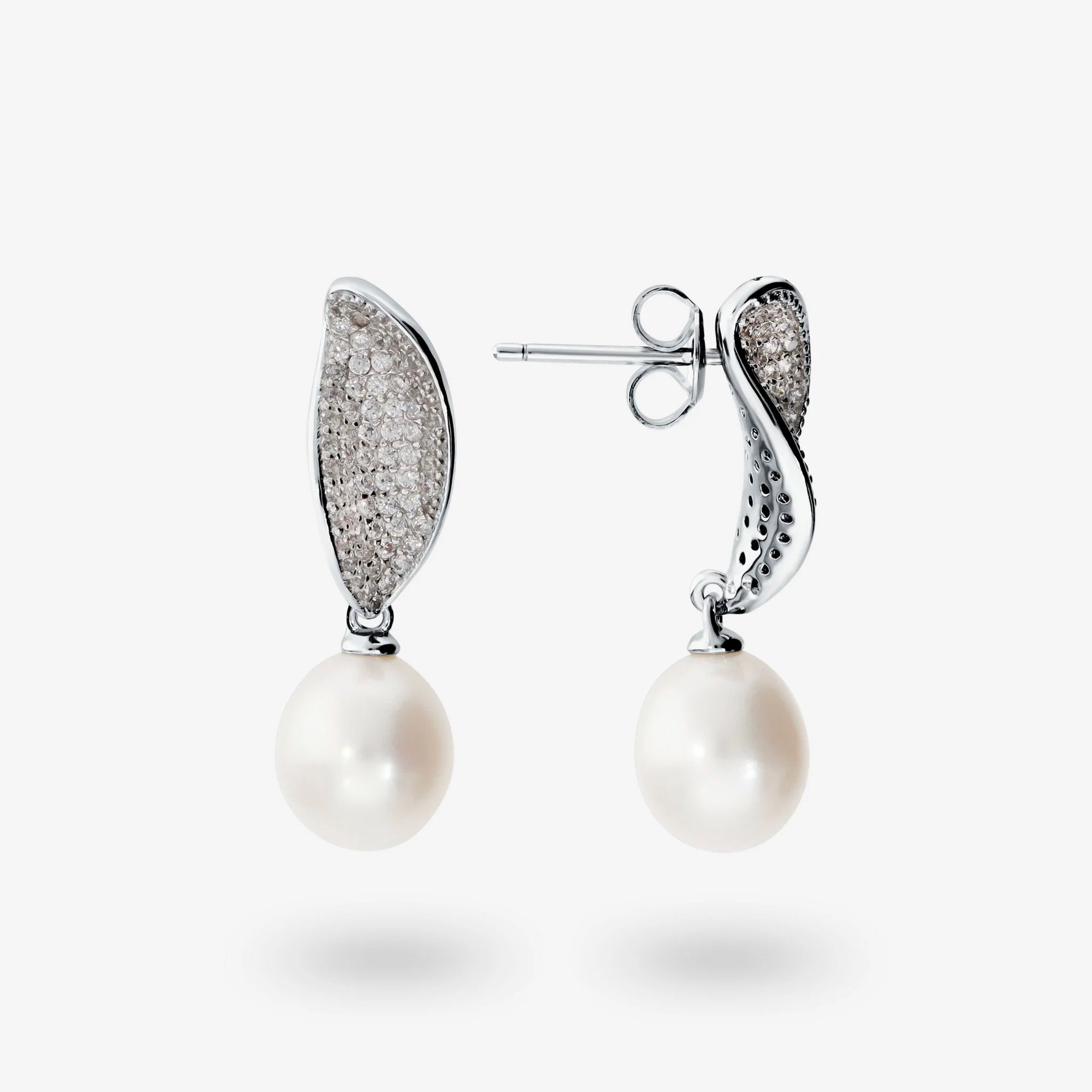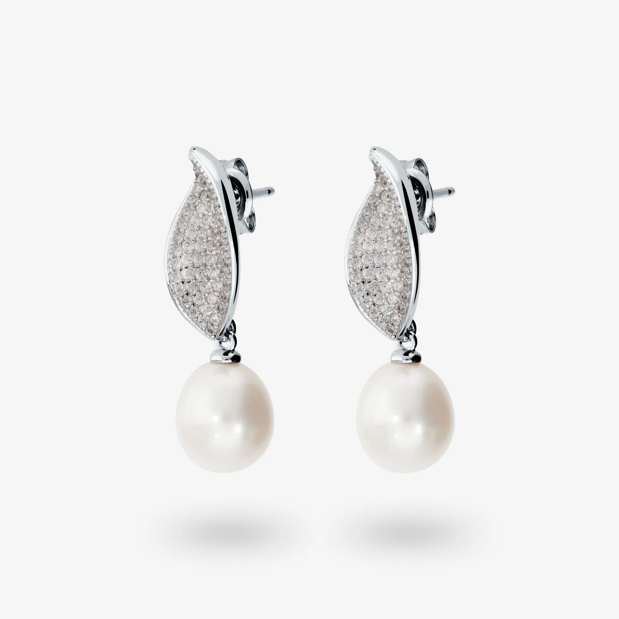 925 Silver drop earrings, plated with 18kt white gold, featuring a leaf-shaped top in pavé cubic zirconia, "Luminosa" quality, equivalent to 1.13ct, and a white button freshwater cultured pearl approximately 7/8 mm in diameter. Post and butterfly clasp.