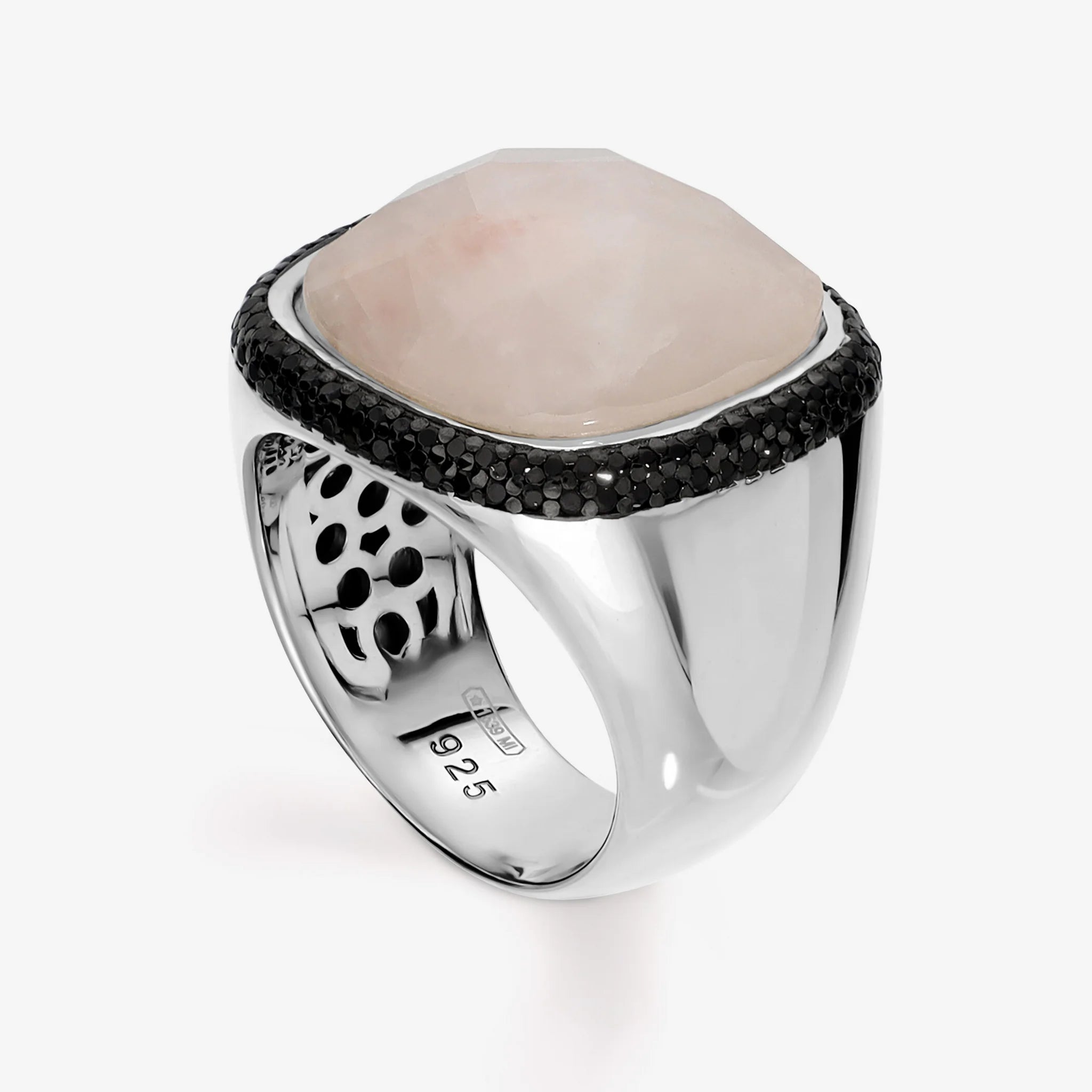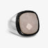 Anello chevalier in Argento 925, placcato Platino, impreziosito da una pietra naturale centrale di quarzo rosa sfaccettato (16x16 mm) circondato da pavé di spinelli neri. Finitura lucida.