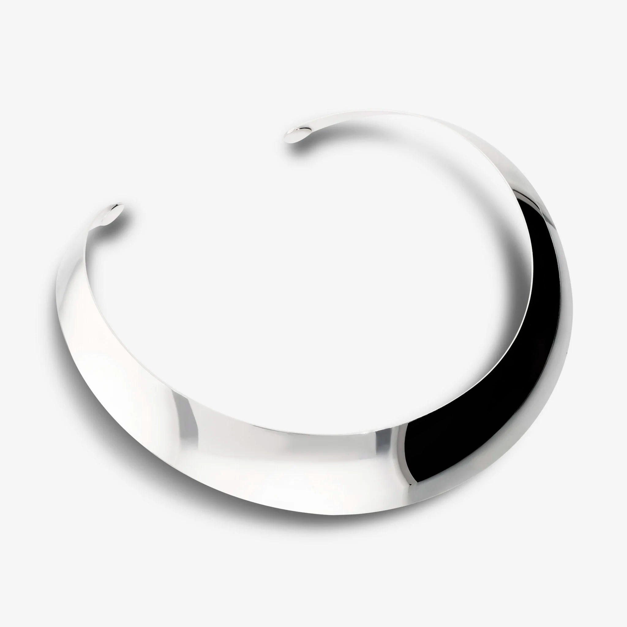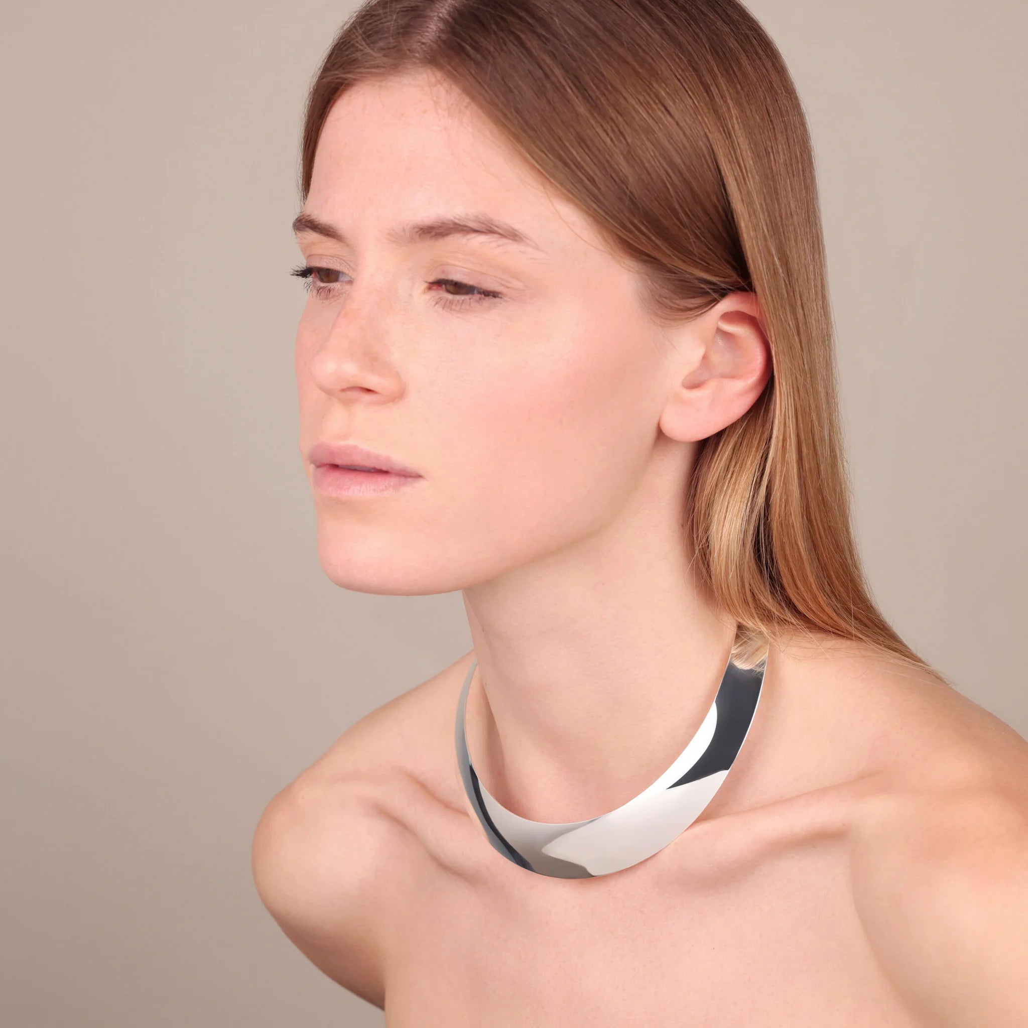 Platinum plated 925 silver choker rigid necklace with mirror polished surface; anatomical fit; maximum width of the surface 2 cm.