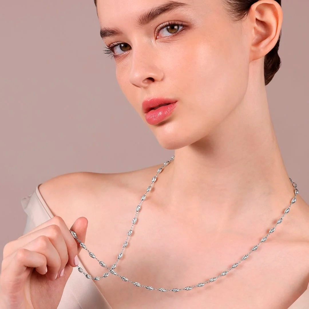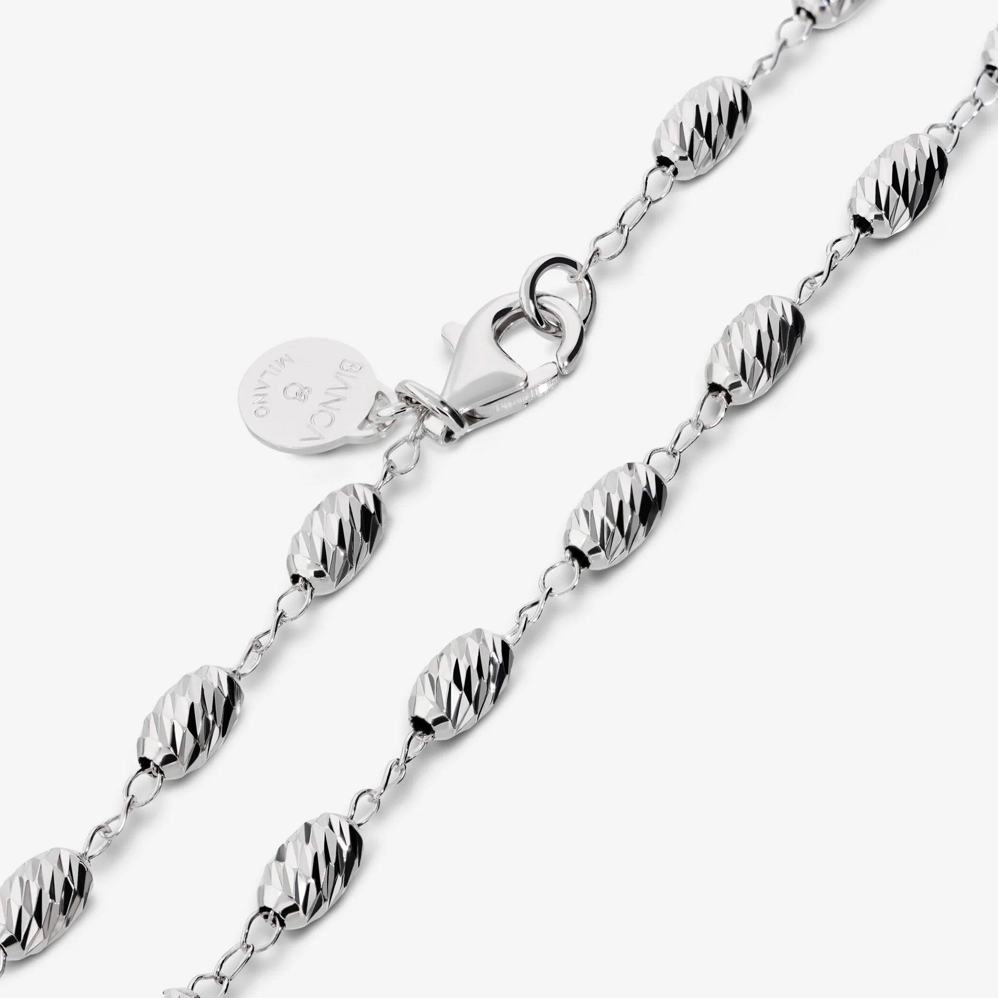 Platinum plated 925 silver necklace 70 cm long, embellished with diamond nuggets (4x6.7 mm); glossy finish; lobster clasp.