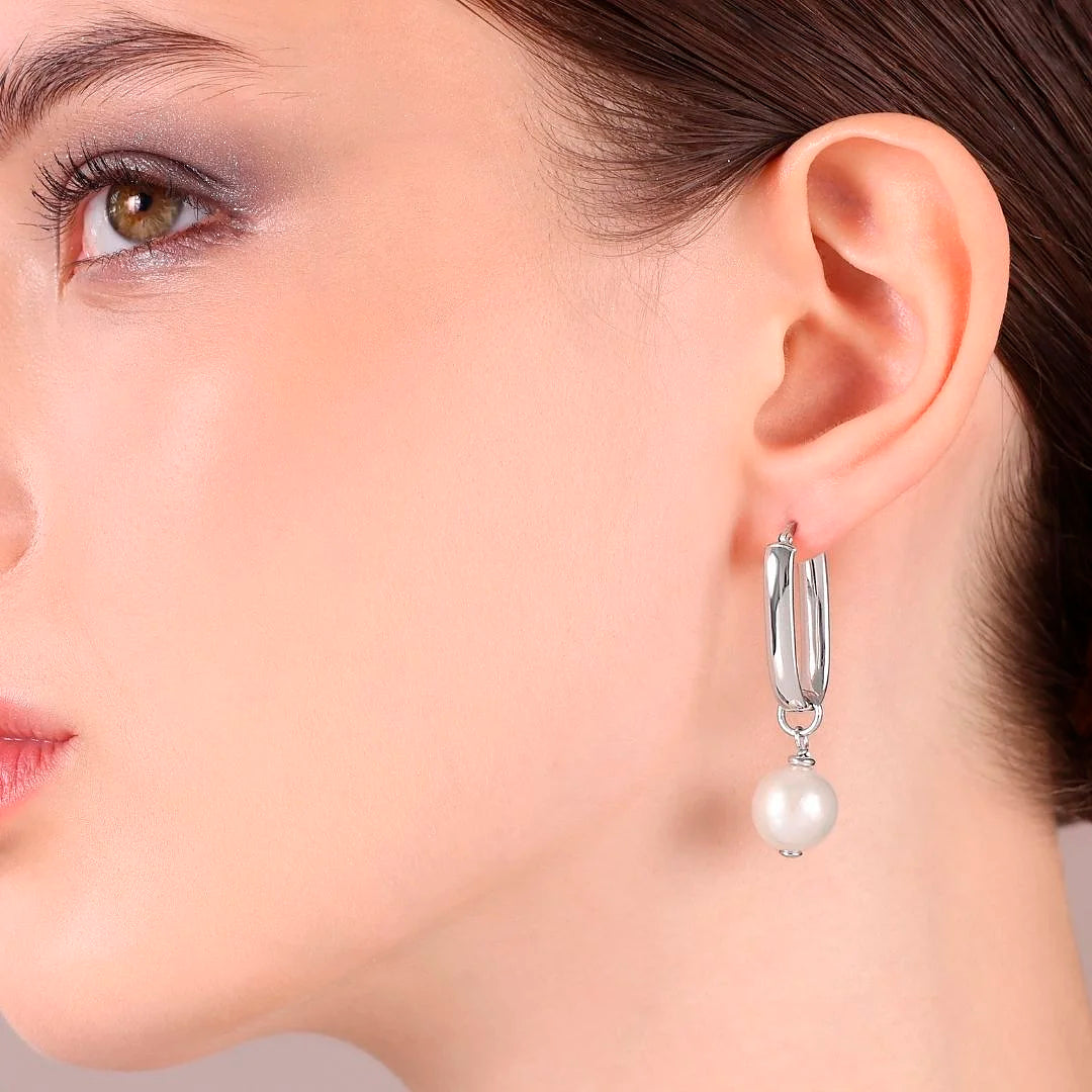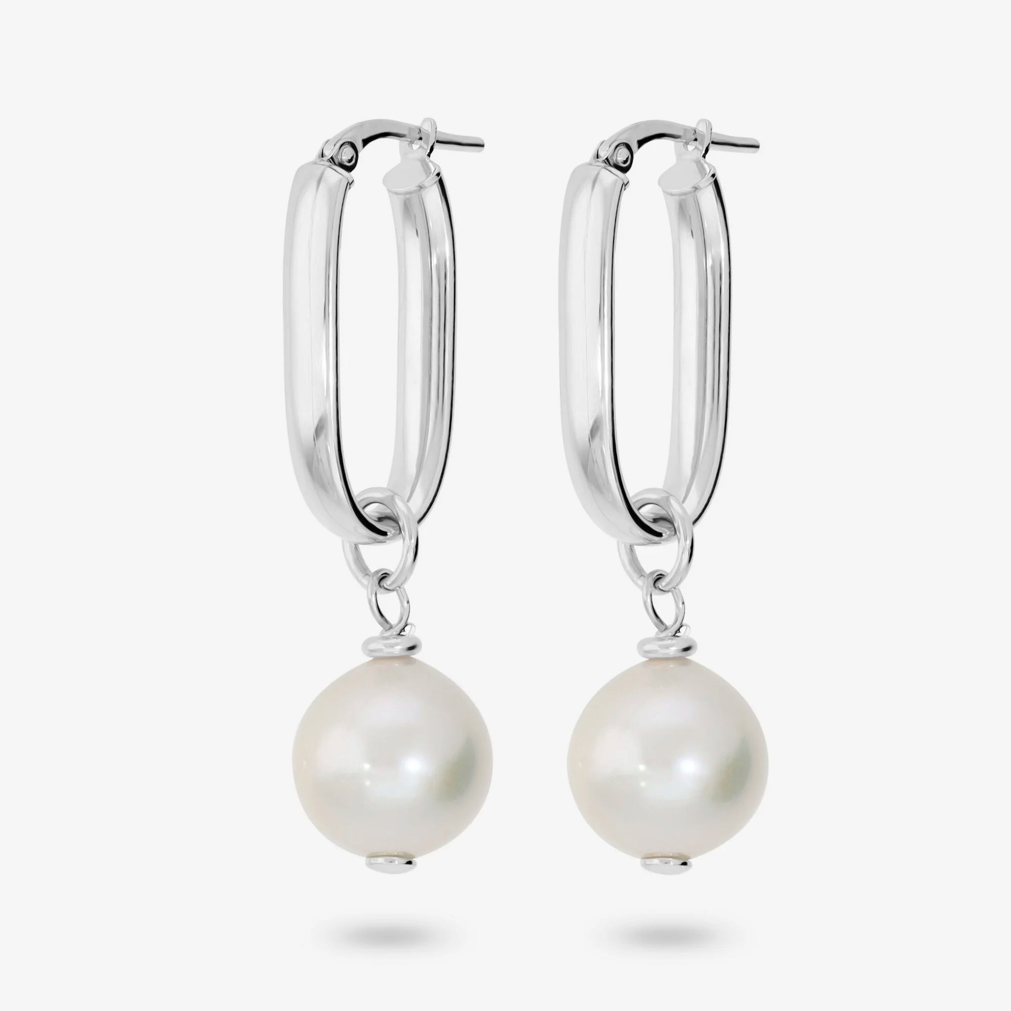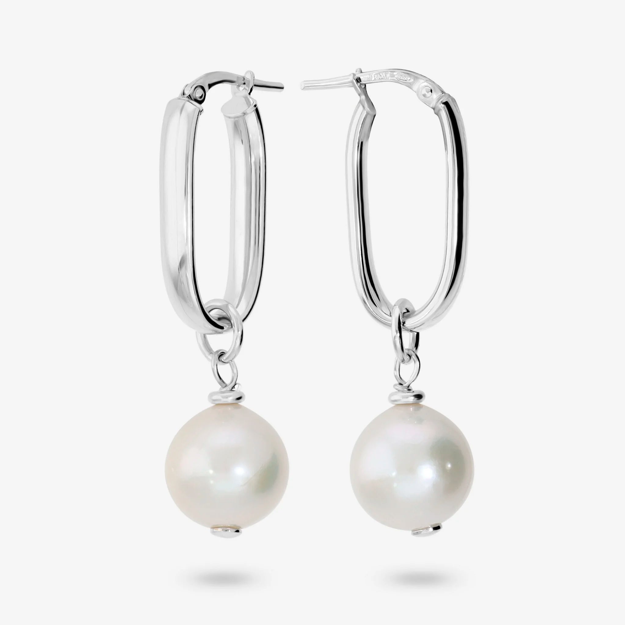 Elongated oval earrings in 925 Sterling Silver 18kt White Gold plated with two removable white freshwater cultured Ming pearls with a diameter of about 11/12 mm. Total length 4cm. Bayonet clasp.