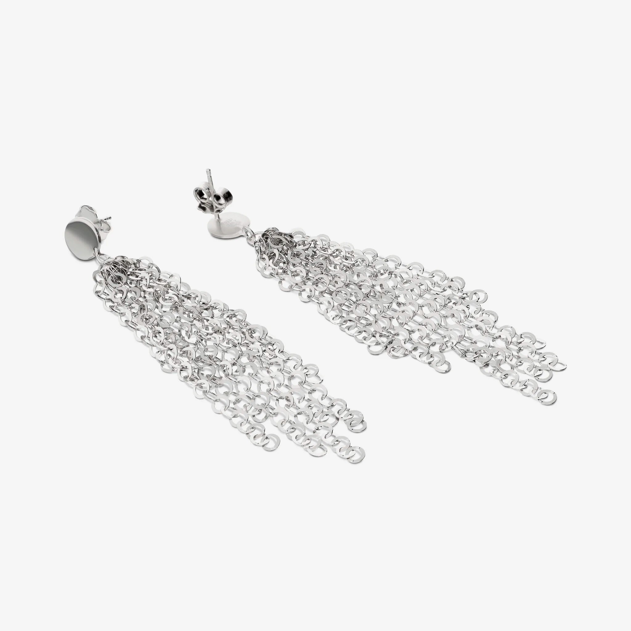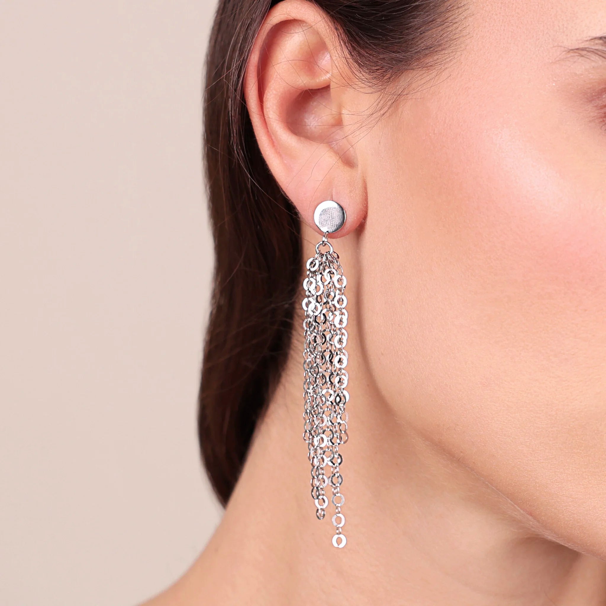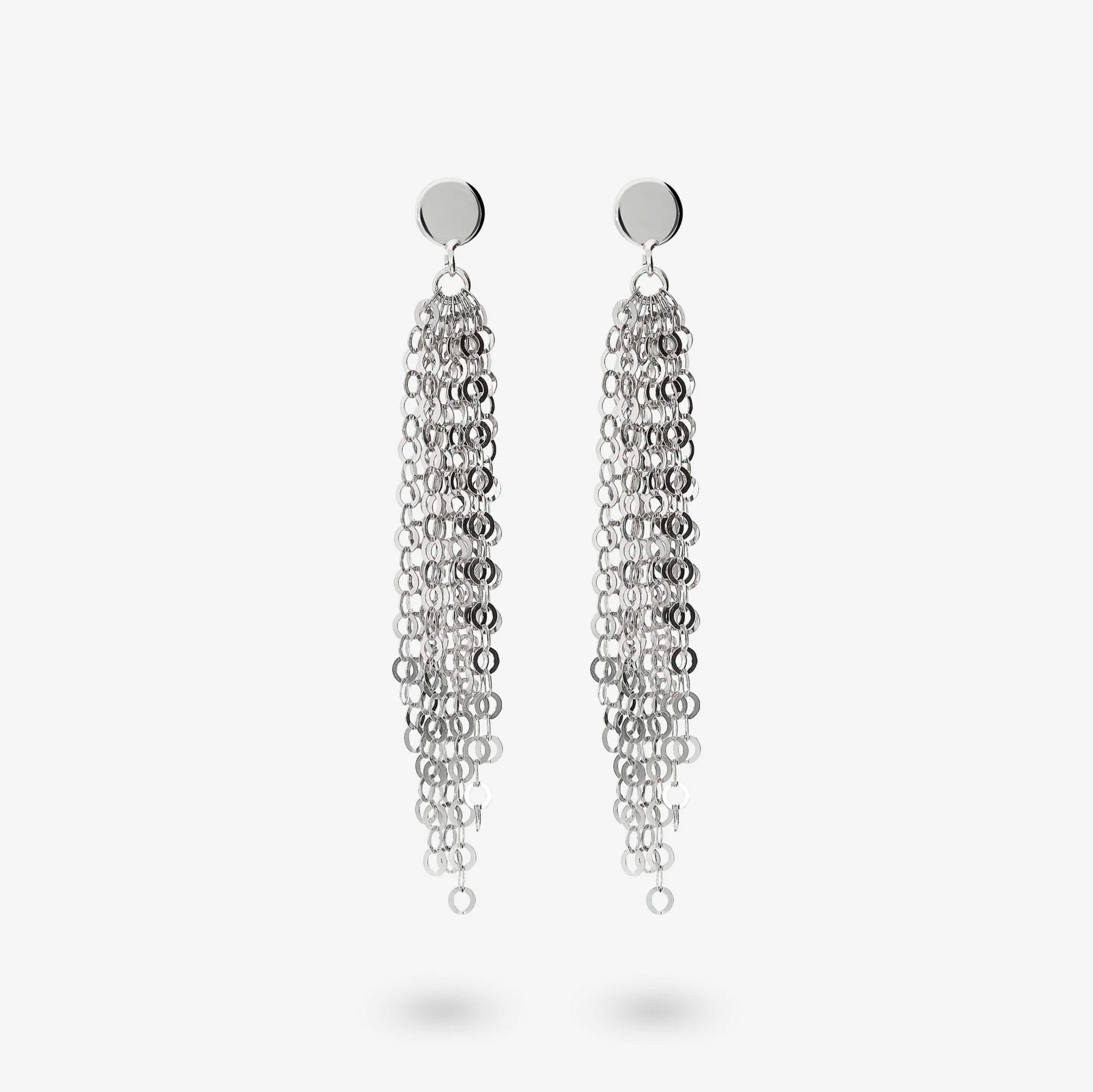Multi-strand dangling earrings in 925 Silver plated with Platinum, composed of eleven graduated rows of diamond-cut rolo chain. Length 8 cm. Pin and butterfly clasp.