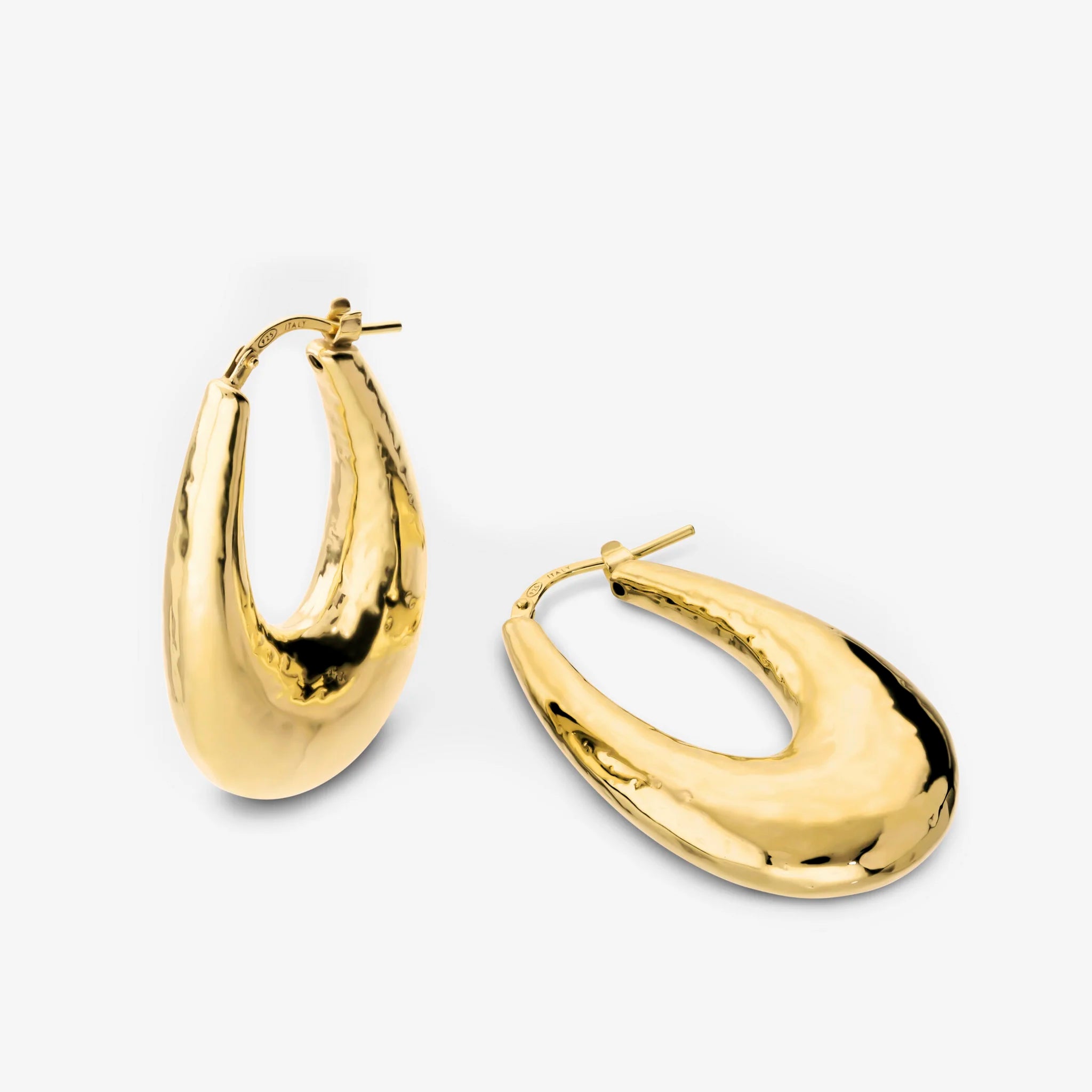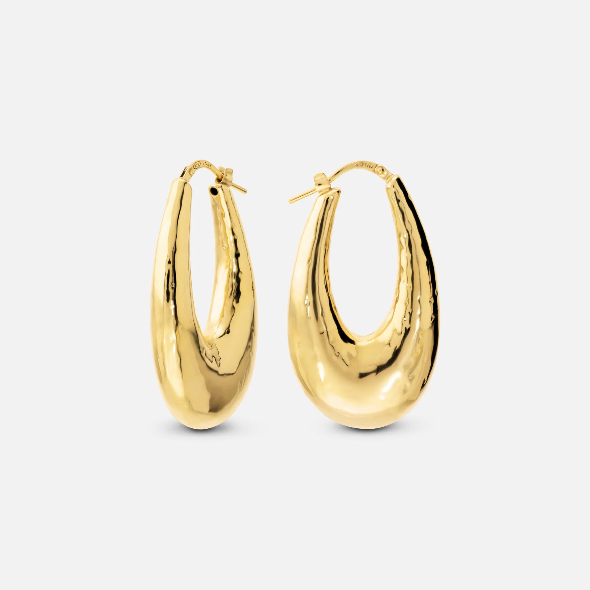 Electroformed hoop earrings in 925 Silver plated with 18kt Yellow Gold. Slightly hammered finish. Dimensions 40x23 mm. Bayonet closure.