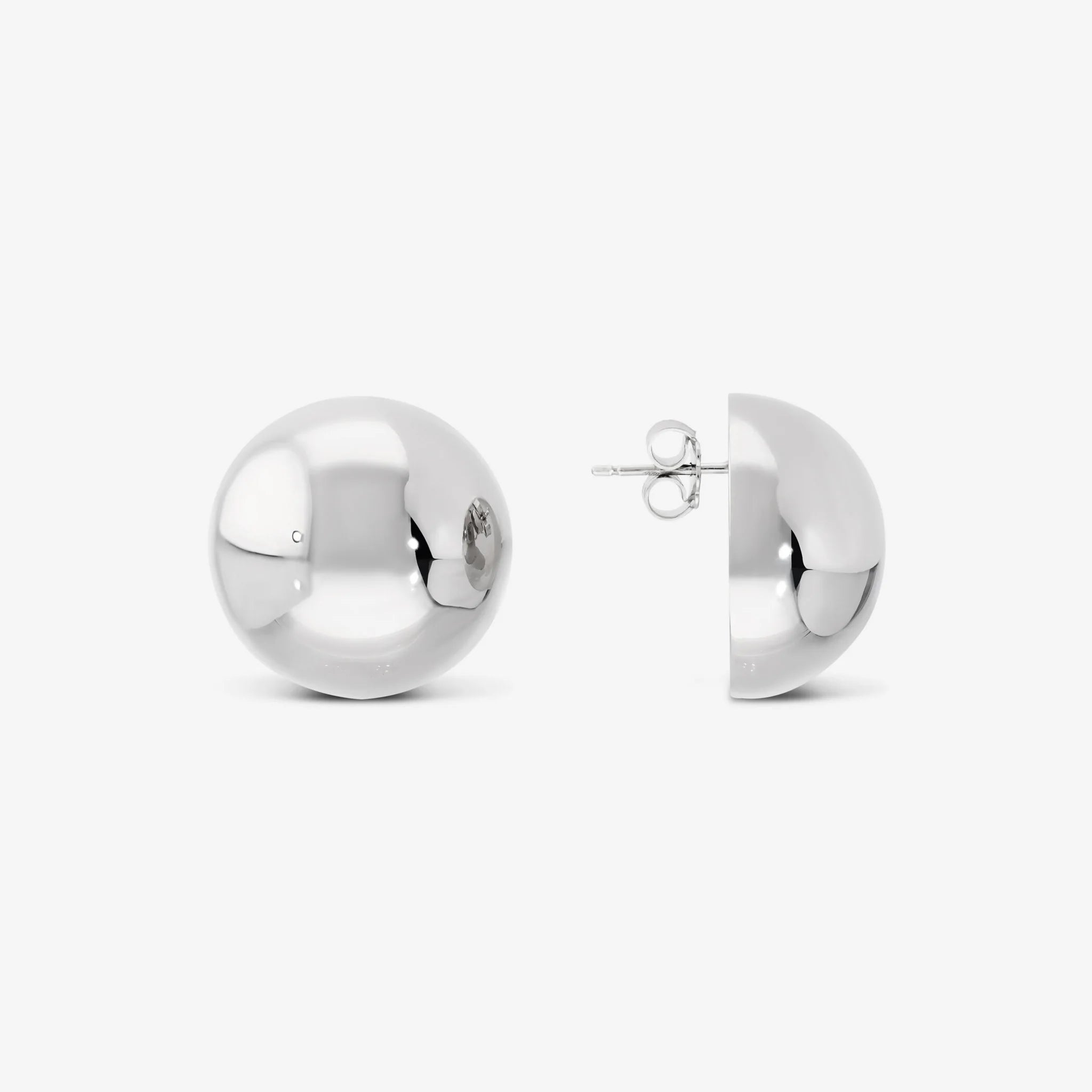 925 Silver stud earrings, platinum plated, with a spherical design (24 mm). Glossy finish. Post and butterfly clasp.