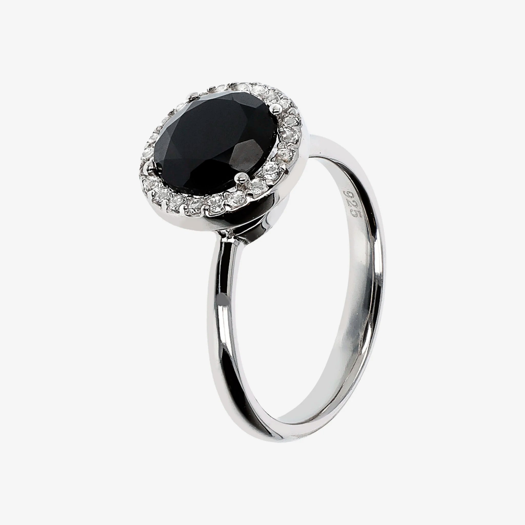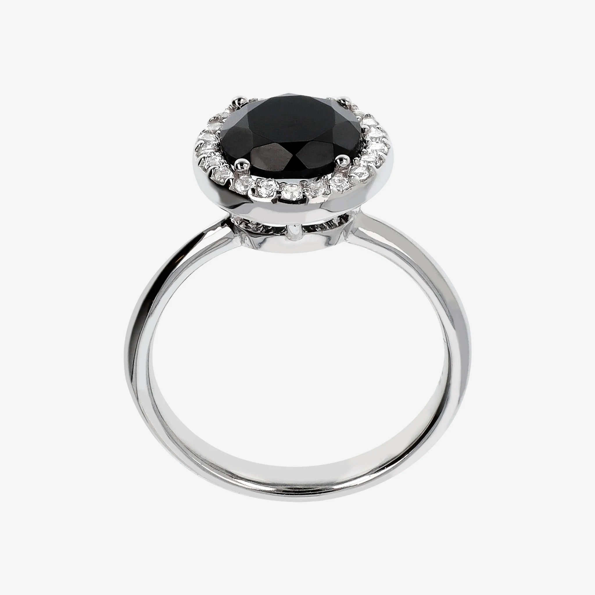 925 silver cocktail ring with black spinel natural stone (11.5 mm) positioned in the central part, surrounded by small white cubic zirconia, luminous quality.