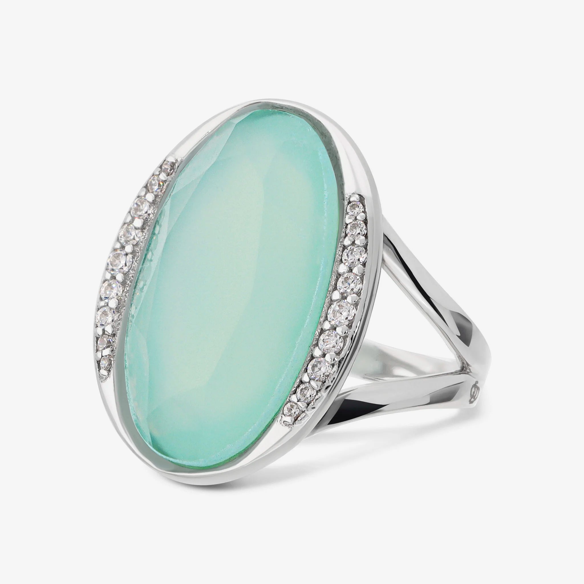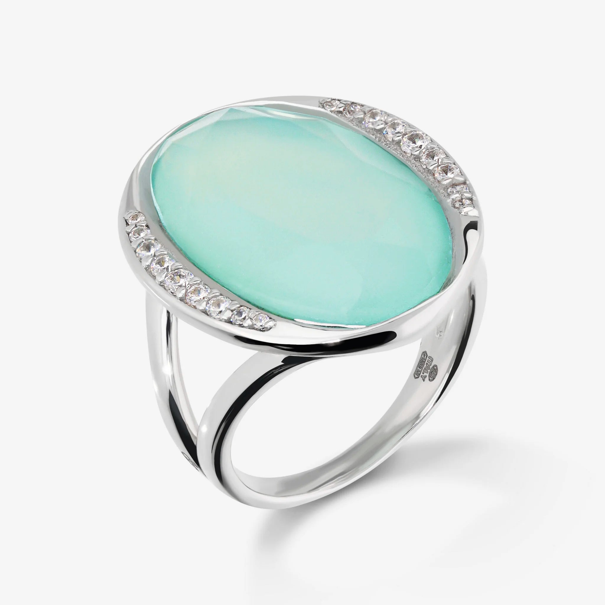 Cocktail Ring in 925 Silver Platinum Plated with Aquamarine Chalcedony and Pavé of Cubic Zirconia