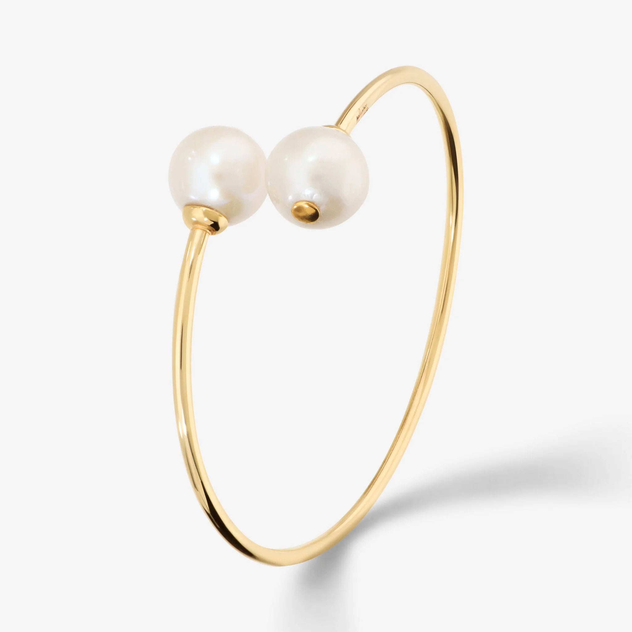 Contrarié bracelet in 925 Silver, plated with 18kt Yellow Gold, adorned with two white Ming freshwater cultured pearls with a diameter of about 12/13 mm. Internal diameter 65.5 mm.