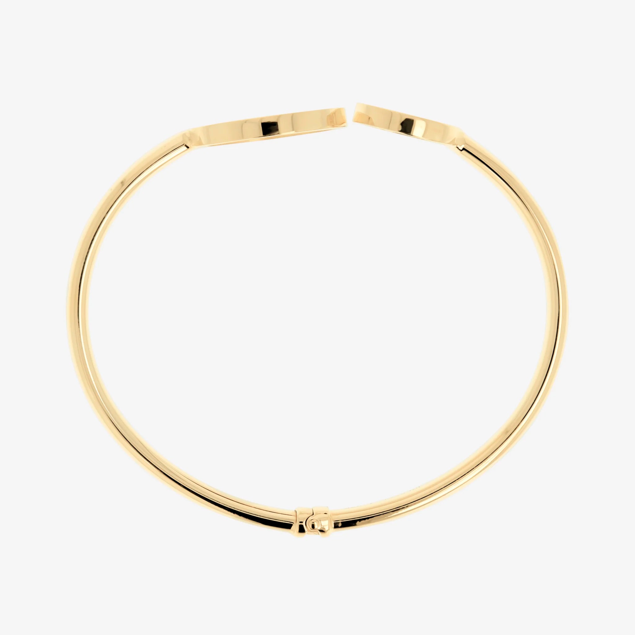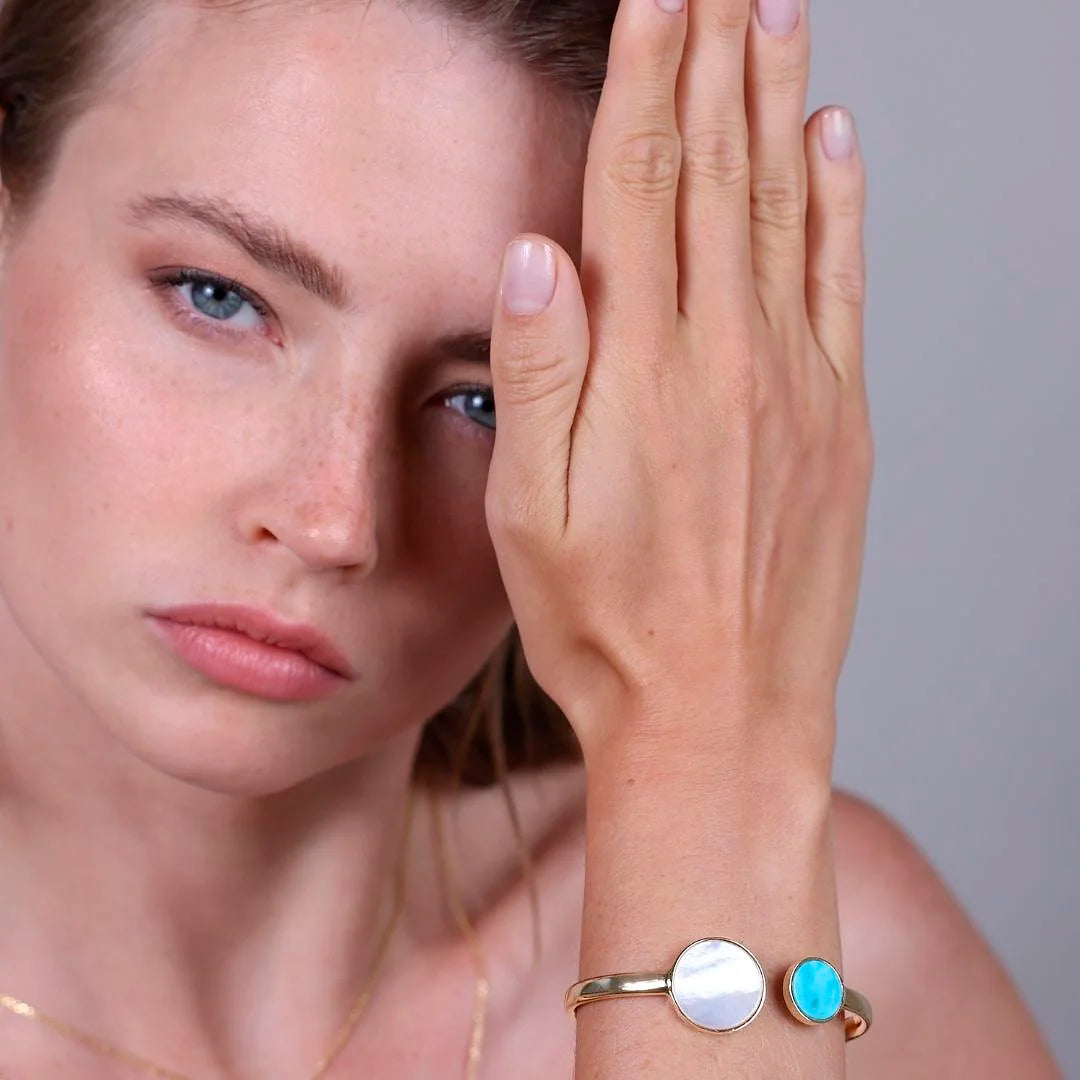 Rigid bracelet in 18kt yellow gold plated 925 silver with double disc in white mother-of-pearl (20 mm) and turquoise (12 mm) natural stone. Internal diameter: 59x48 mm. Equipped with joint.