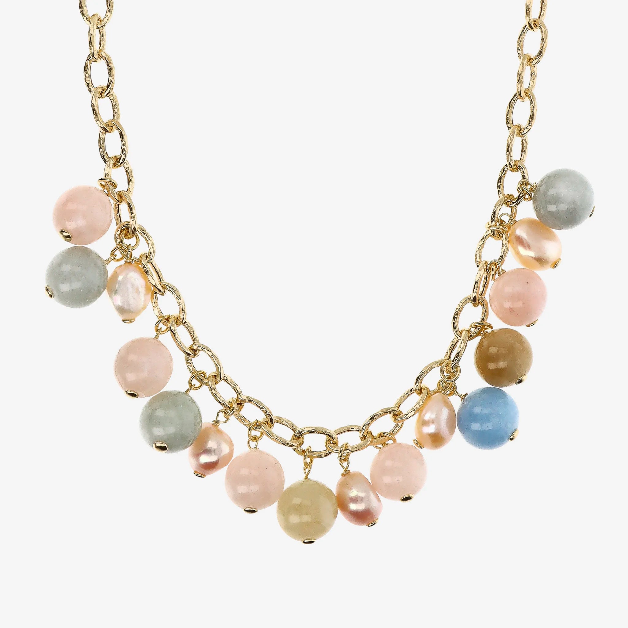 Necklace in 925 Silver, 18kt yellow gold plated, with finely hammered rolo chain enriched with faceted natural stone pendants (12 mm) alternating with multicolored freshwater cultured pearls with a diameter of approximately 9/10 mm. Length 46+4 cm extension. Lobster clasp closure.