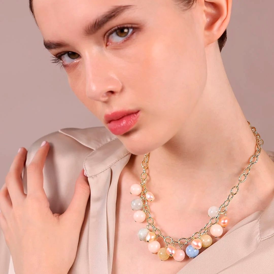 Charms Necklace in 18Kt Yellow Gold plated 925 Silver with Natural Stones and Multicolor Freshwater Pearls Ø 9/10 mm