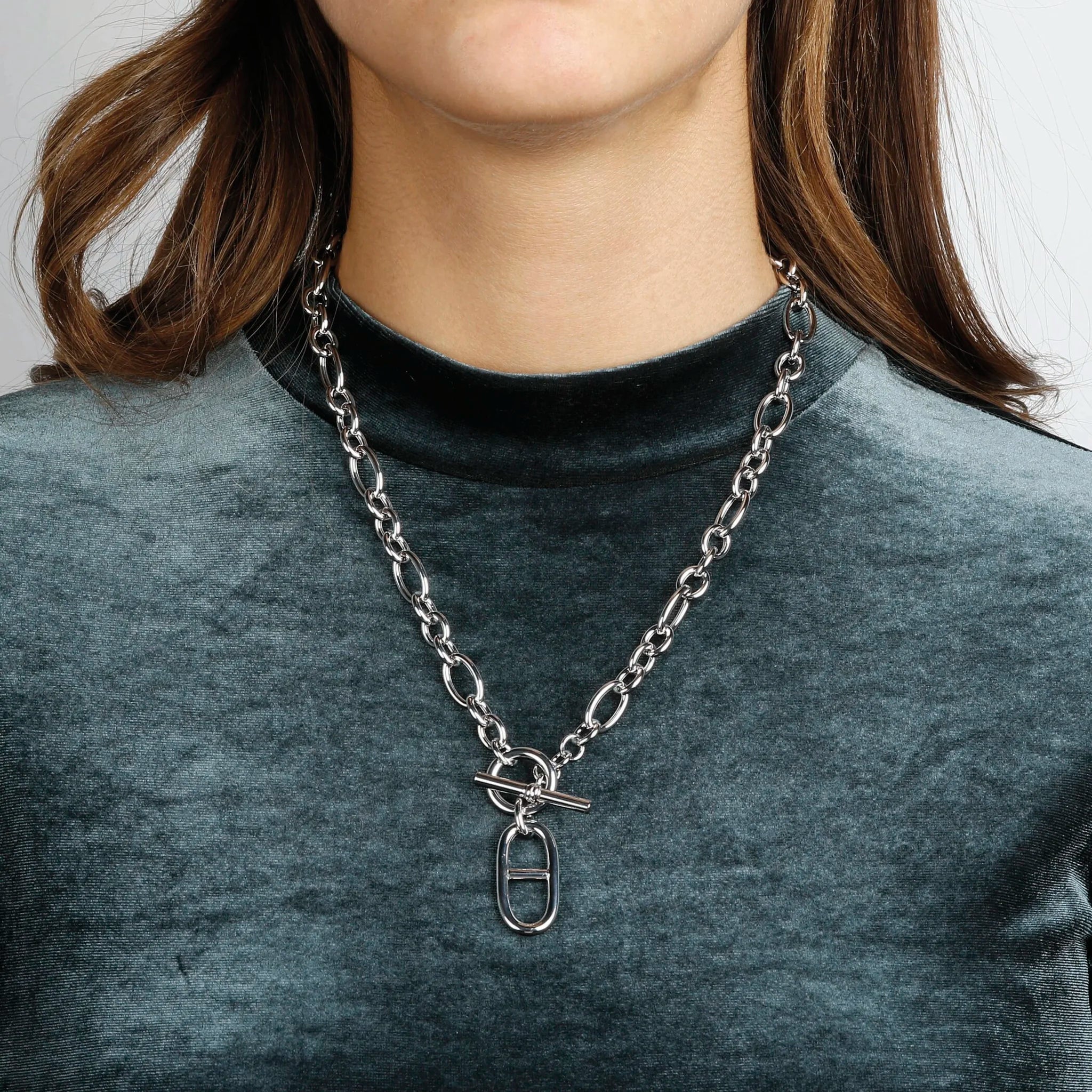 White Necklace by Milor in 925 silver with platinum plating embellished with a rolo chain with alternating links. The 'T' bar clasp features an element with marine link.