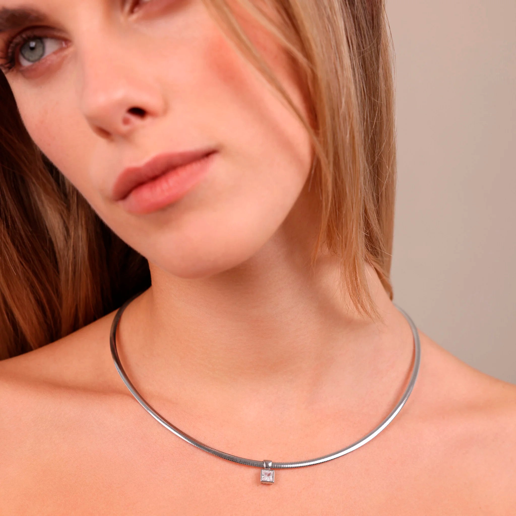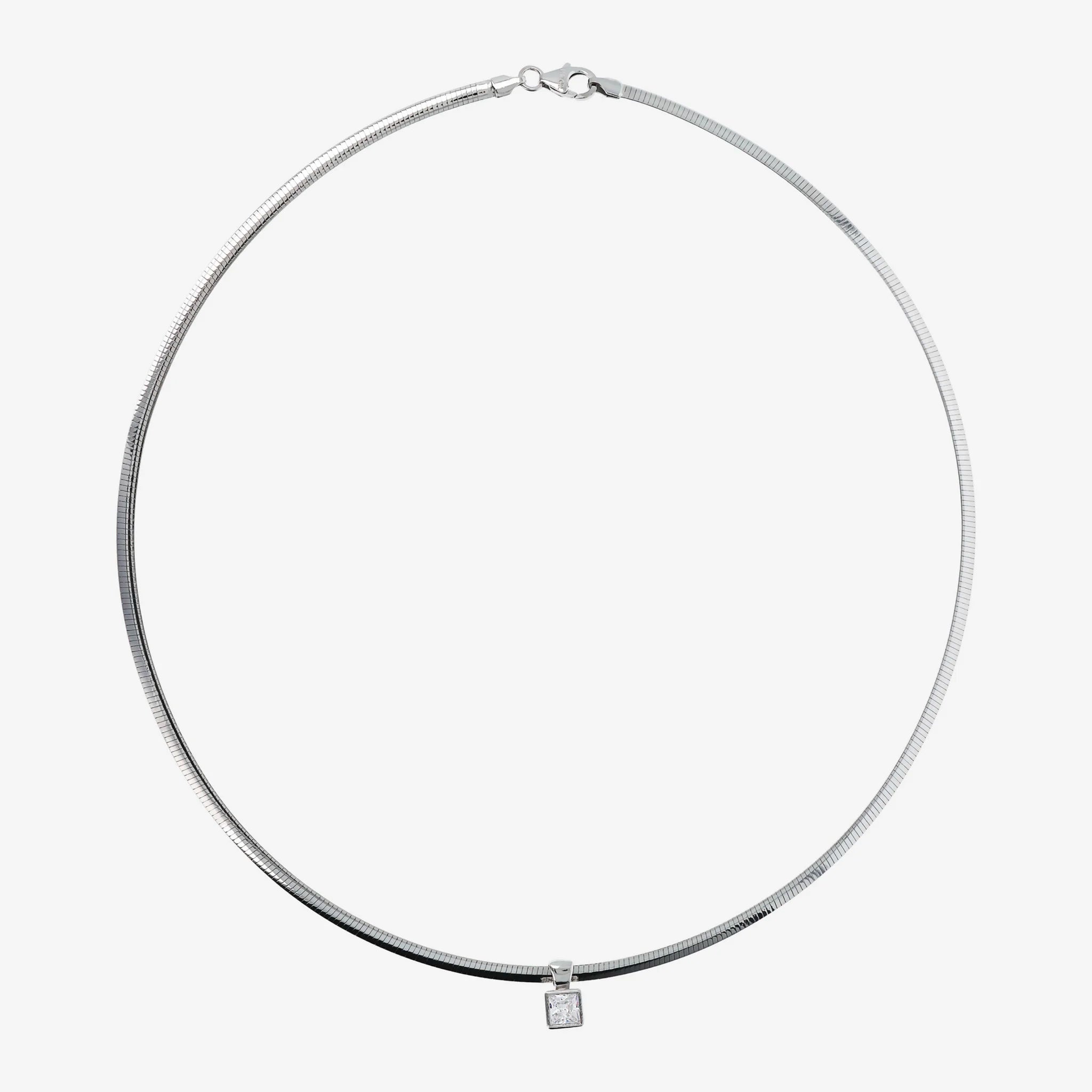 Choker necklace in Rhodium plated 925 Silver. Omega link with sliding cubic zirconia pendant, 'Luminosa' quality, equal to 0.95ct, princess cut. Length 46 cm. Lobster clasp closure.