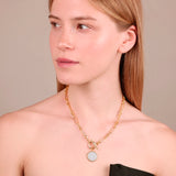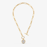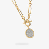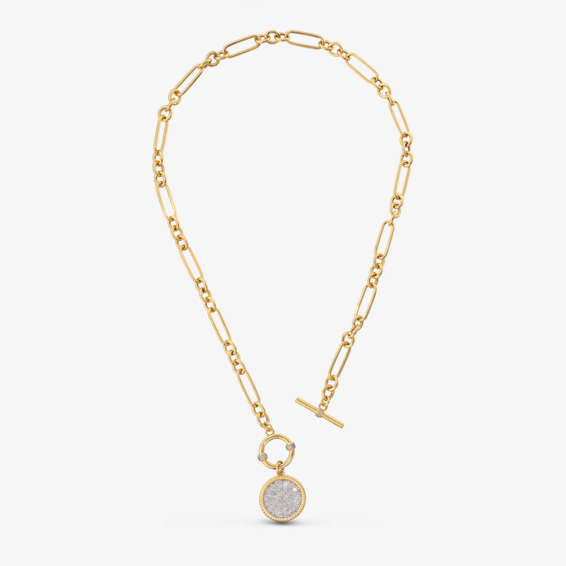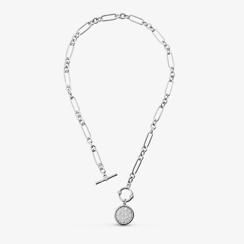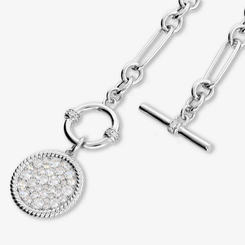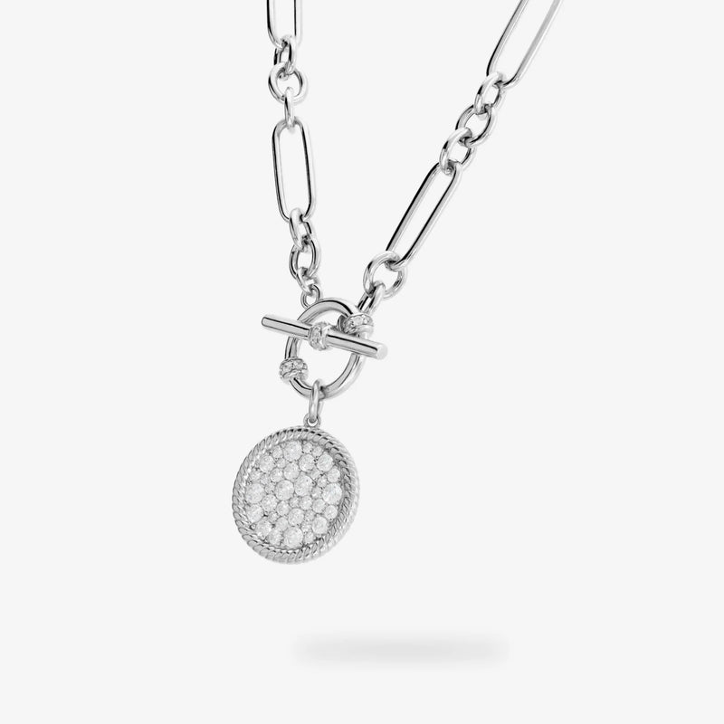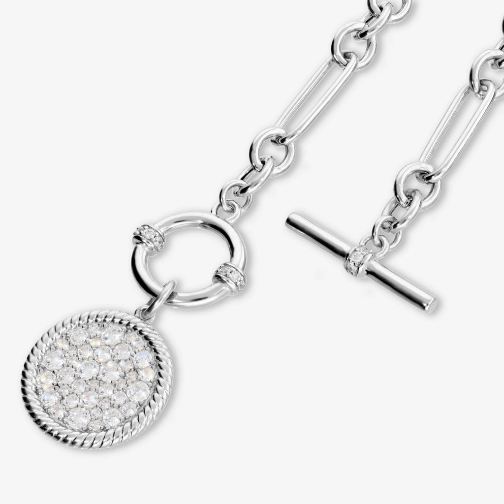 925 Silver necklace with alternating oval links and round pendant with grooved frame and pavé of cubic zirconia, "Luminosa" quality, equal to 3ct. Length 45 cm. "T-Bar" clasp.
