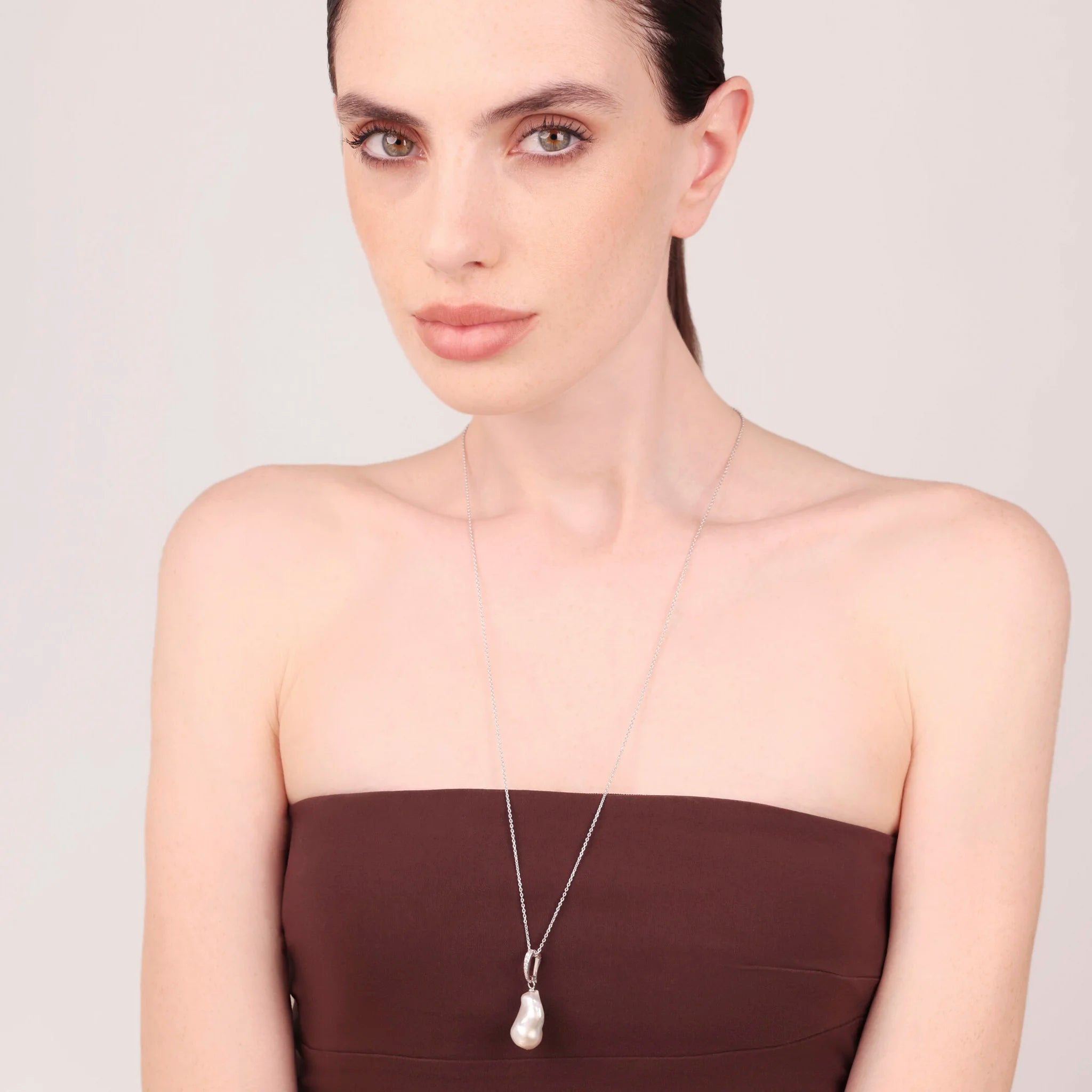 Long necklace in 925 Silver plated with 18kt white Gold. Glitter chain with counter-chain in pavé of cubic zirconia, "Luminosa" quality, equal to 0.13ct, and openable pendant with white Scaramazza freshwater cultured pearl (21x18 mm). Length 80 cm with intermediate ring at 70 cm. Lobster clasp closure.