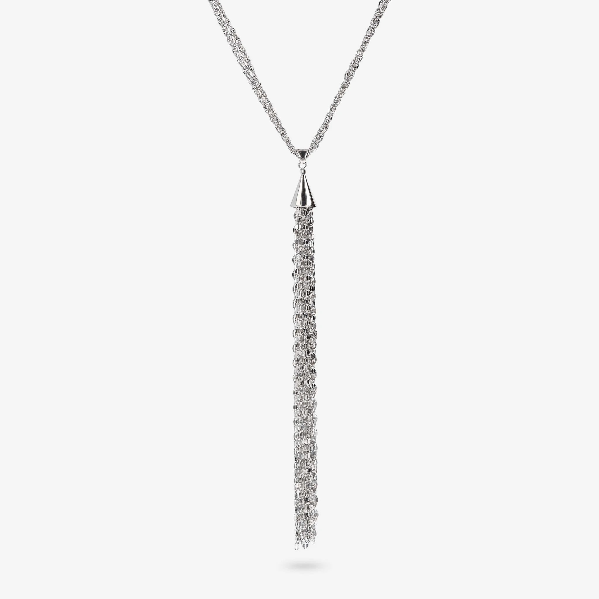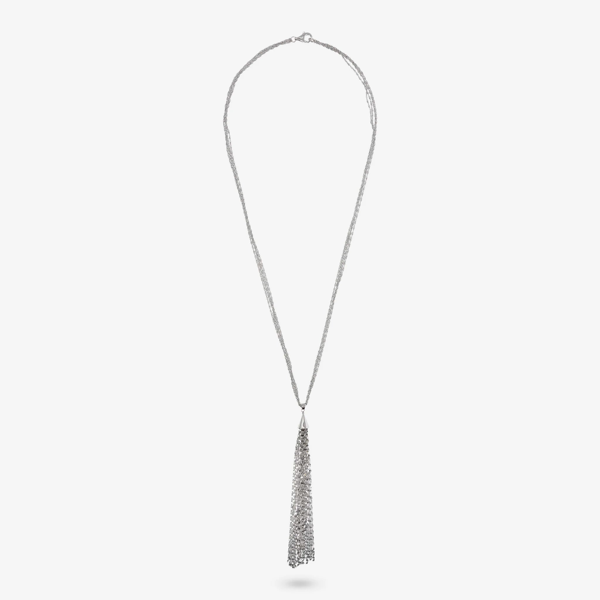 Multi-strand necklace in Platinum-plated 925 Silver. Four rows of Singapore mesh and sliding pendant with eighteen rows of diamond mesh. Lobster clasp closure.
