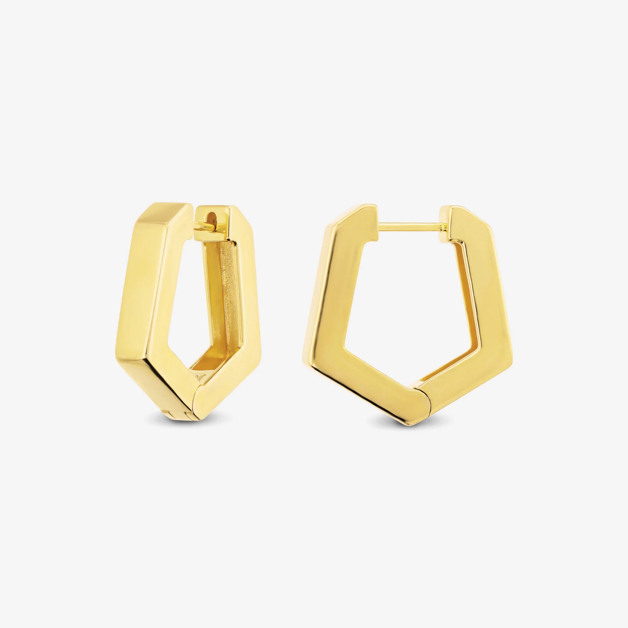 925 Silver hoop earrings, plated with 18kt yellow gold, with a hexagonal design (20x19 mm). Glossy finish. Post and clutch closure.