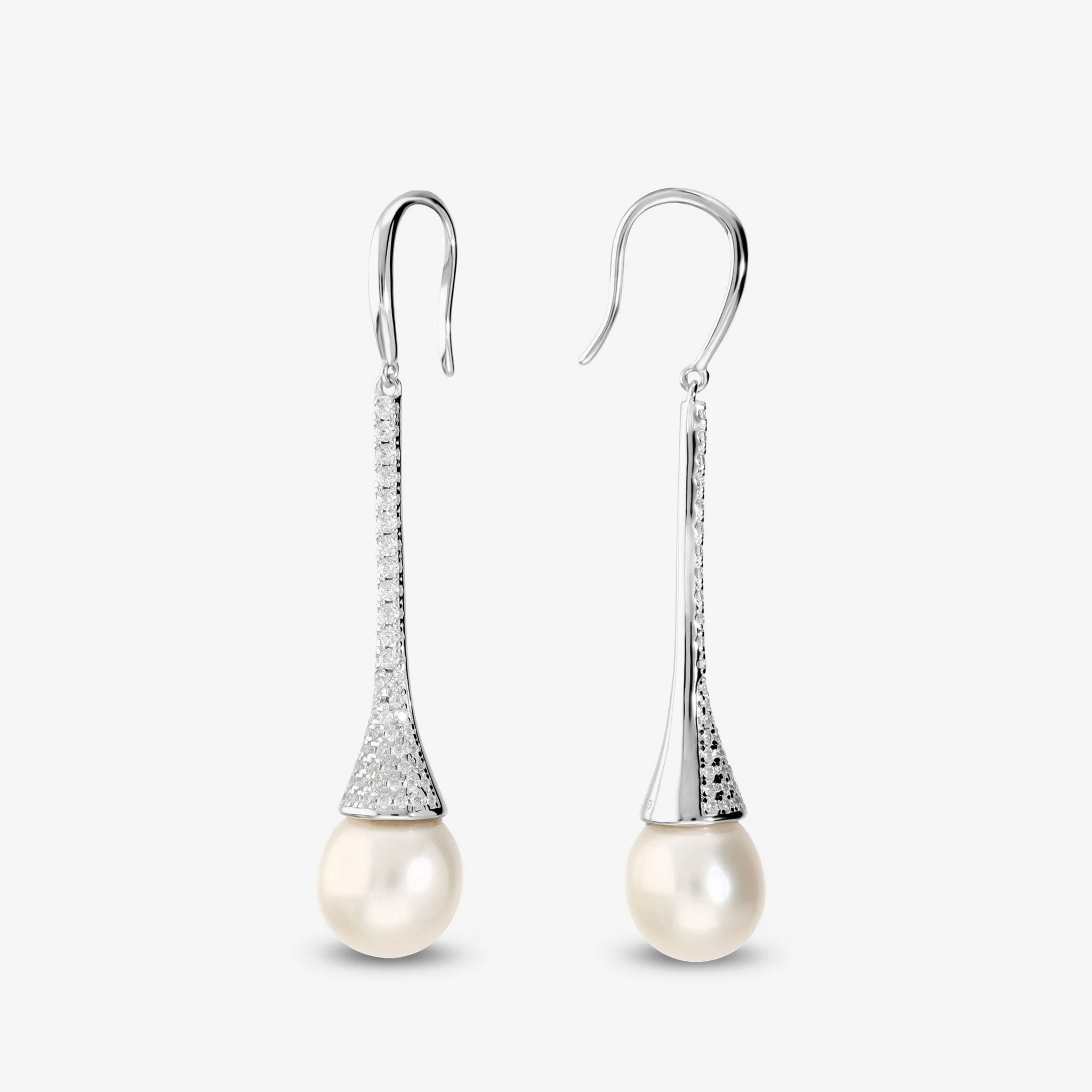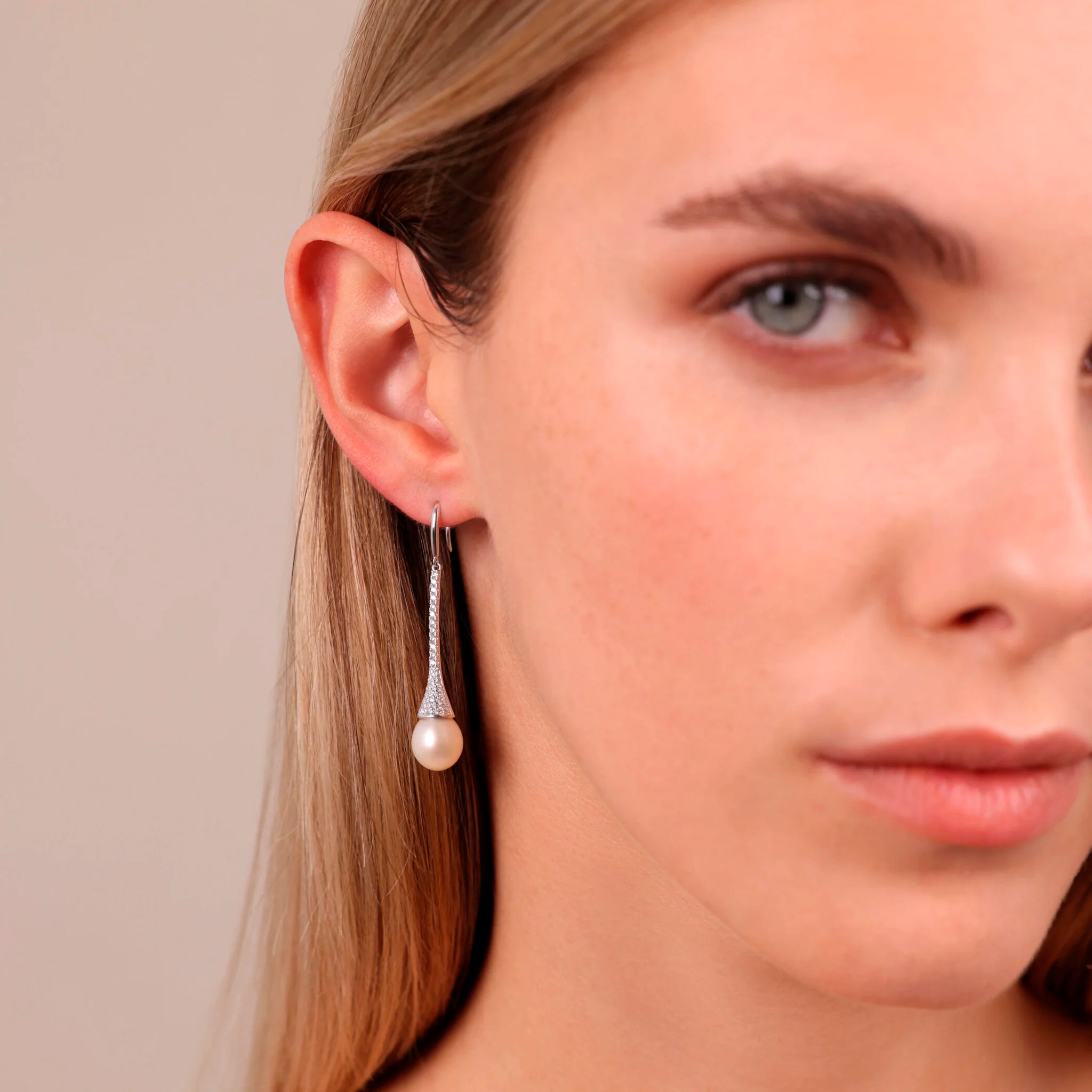 925 Silver drop earrings, plated with 18kt white gold, with pavé of cubic zirconia, "Luminosa" quality, equal to 0.24ct, and white freshwater cultured pearls with a diameter of about 8 mm. Hook closure.