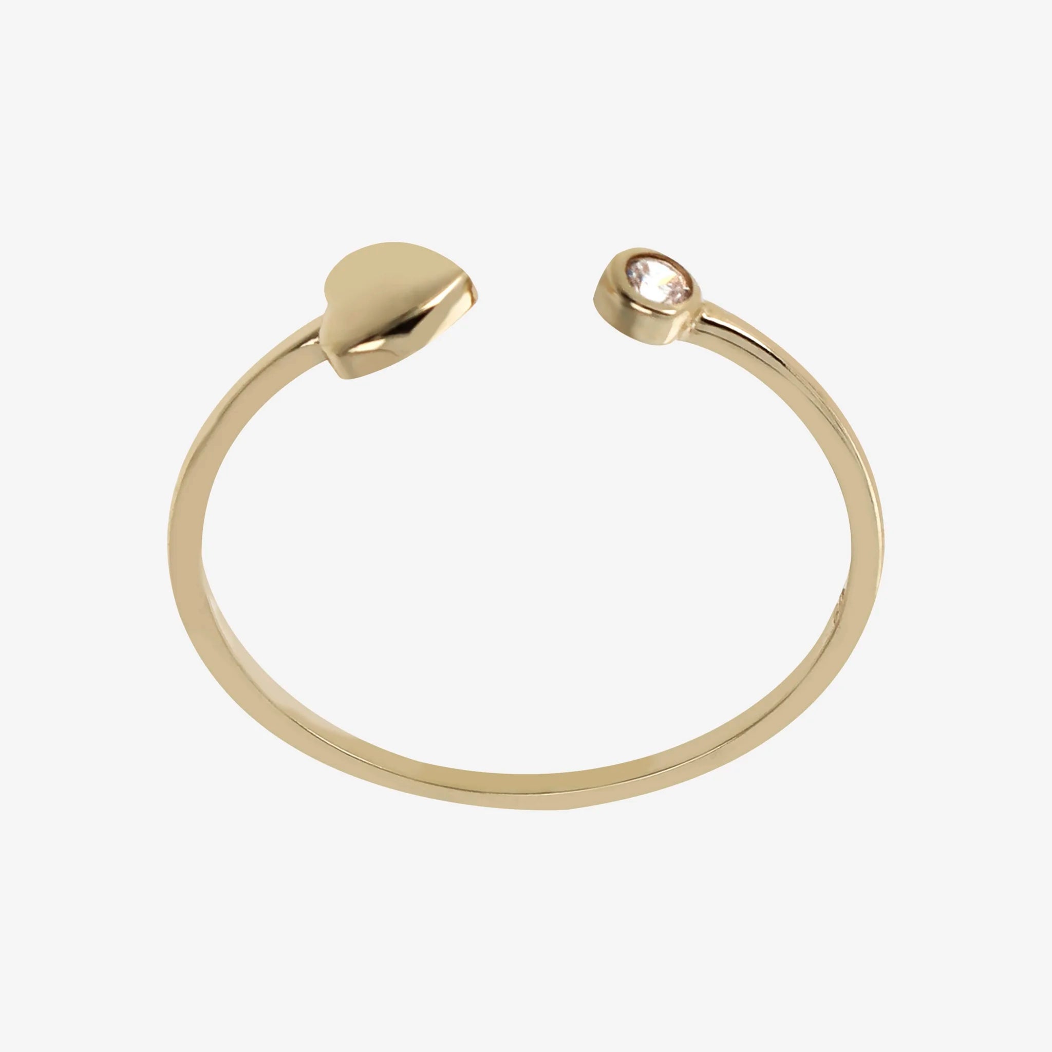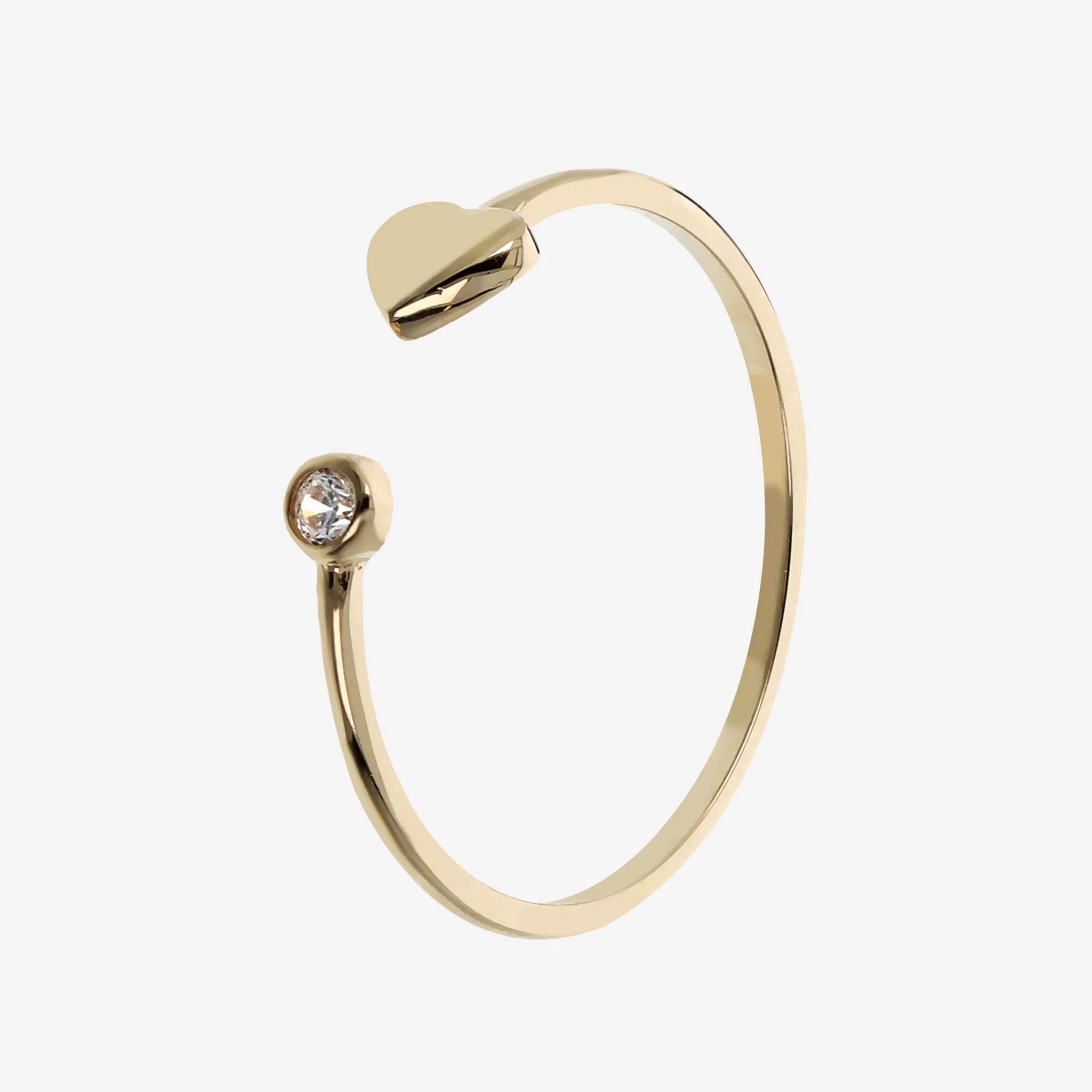 Contrary ring in 375/1000 gold embellished with a heart-shaped element and a cubic zirconia light point, luminous quality.