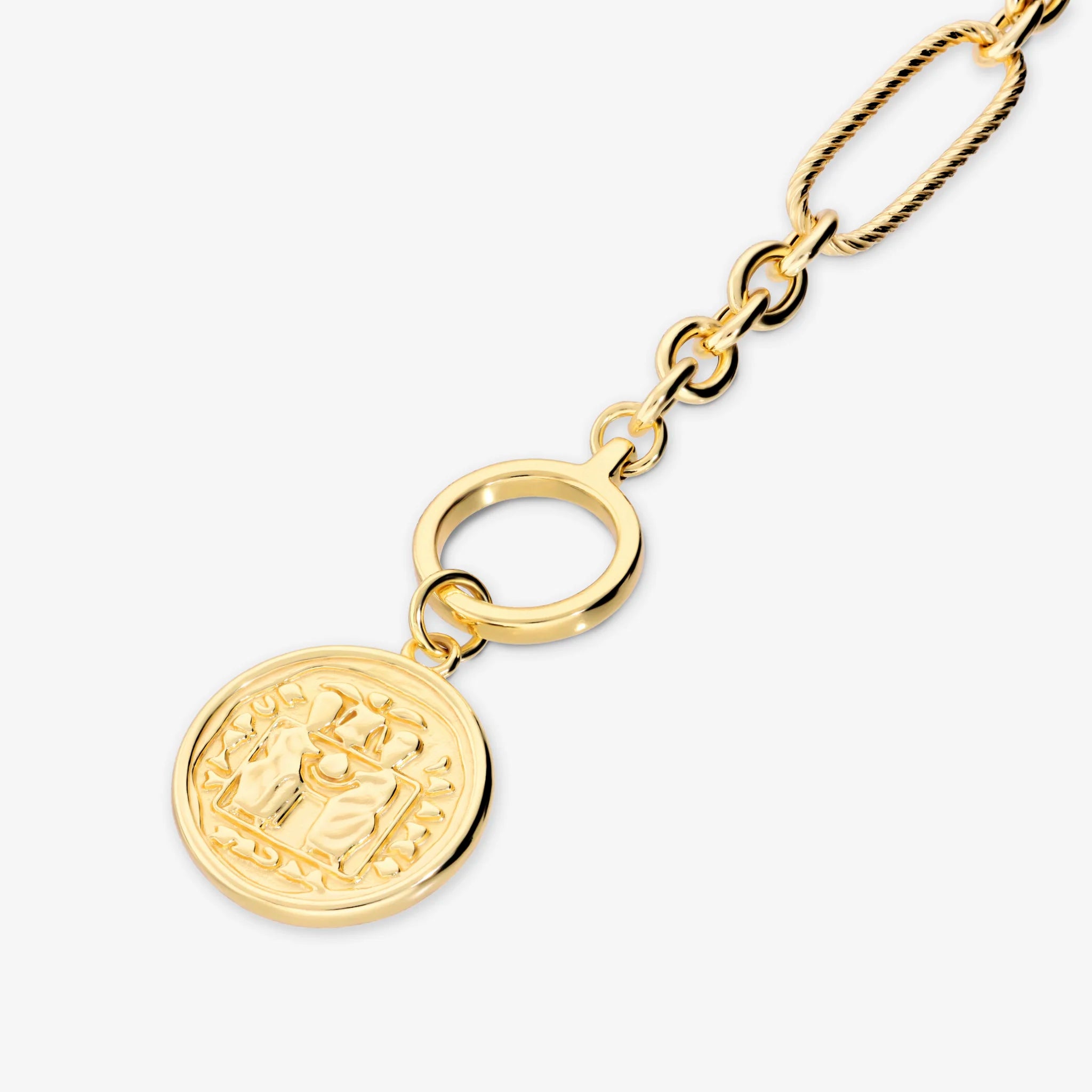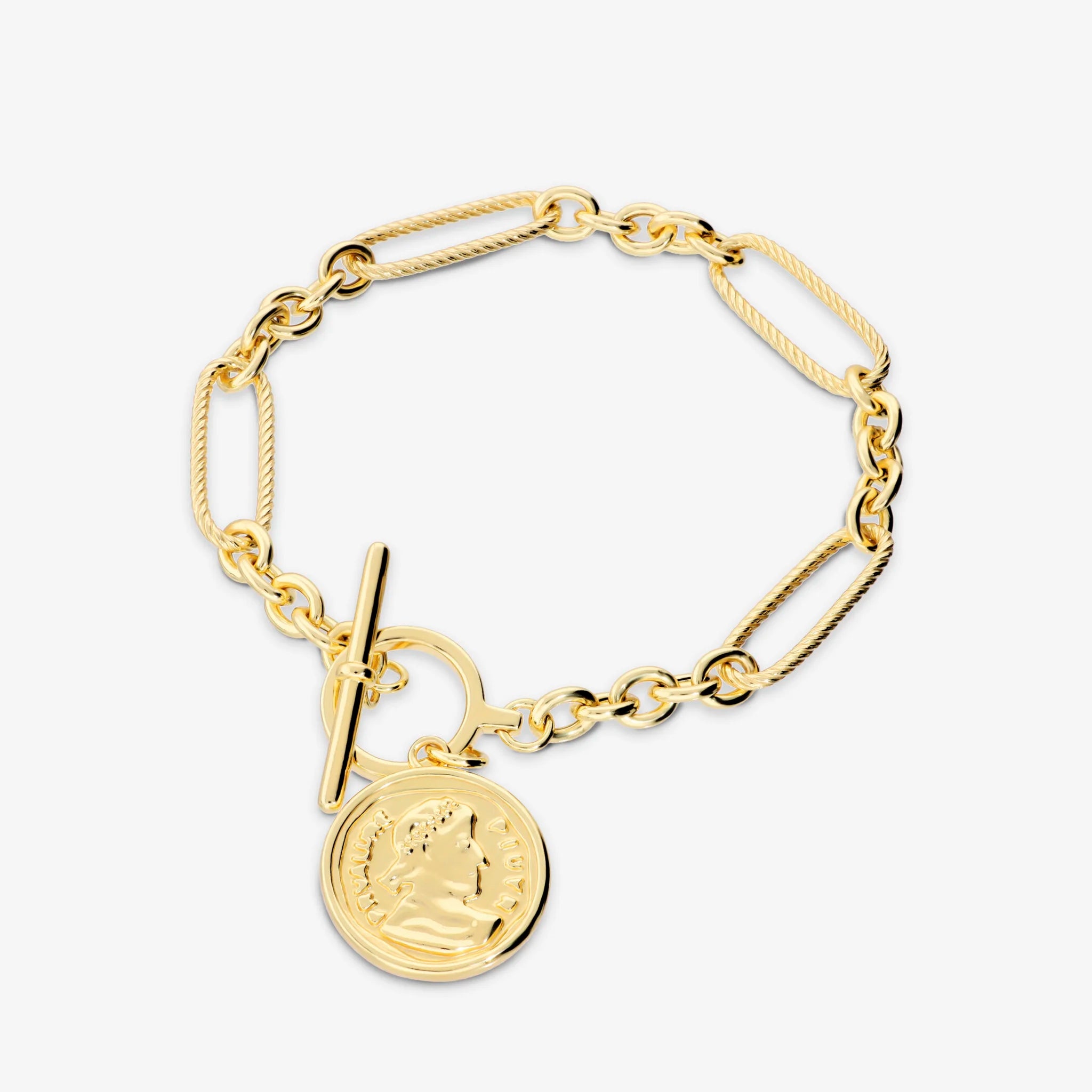 Bracelet in 925 Silver, plated with 18kt Yellow Gold, with alternating polished and twisted links and coin. Length 20 cm. 'T-Bar' clasp.