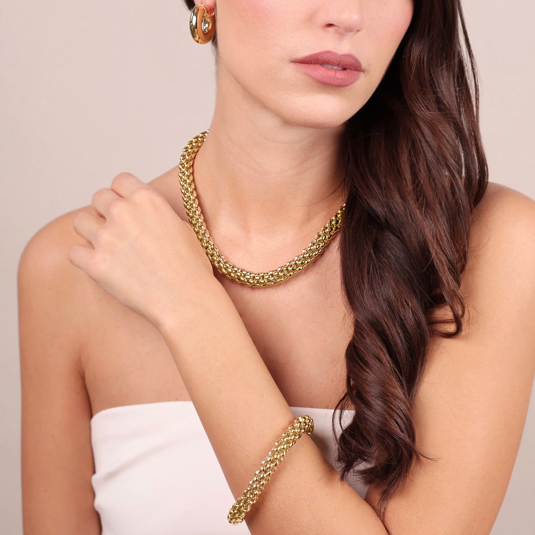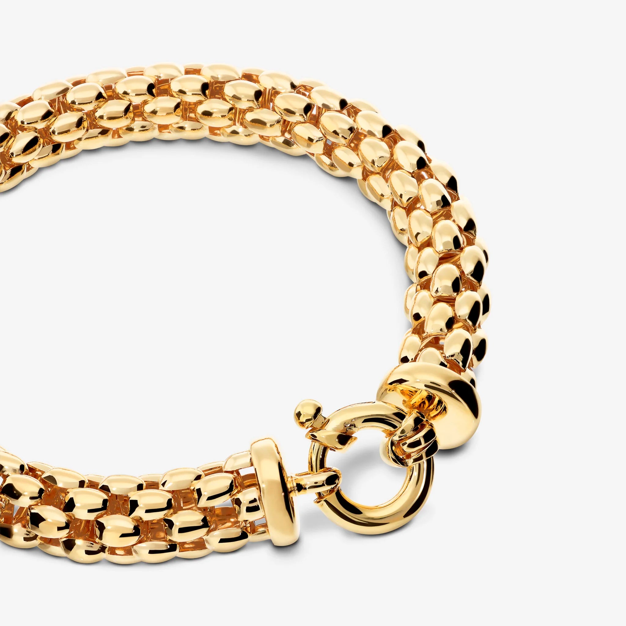 Maxi popcorn link bracelet in 925 Silver plated with 18kt Yellow Gold. Thickness 9.5 mm. Length 23 cm. Closure with spring ring.