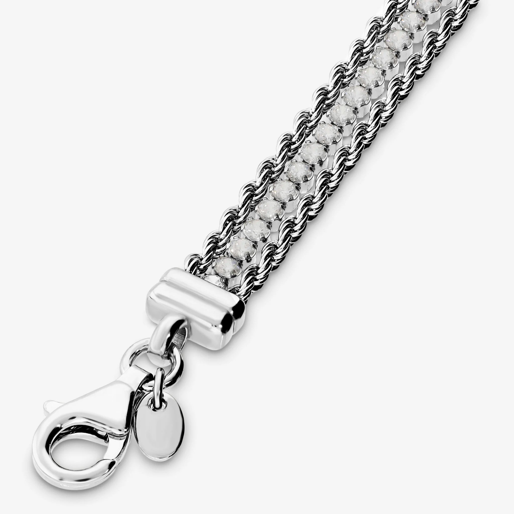 Bracciale multi-filo in Argento 925, placcato Platino, con due fili di maglia a corda e un filo di cubic zirconia, qualità 'Luminosa'. Chiusura a moschettone. Disponibile in tre misure: Small (16cm - 1.65ct) / Medium (17.8cm - 1.85ct) / Large (19.7cm - 2ct).