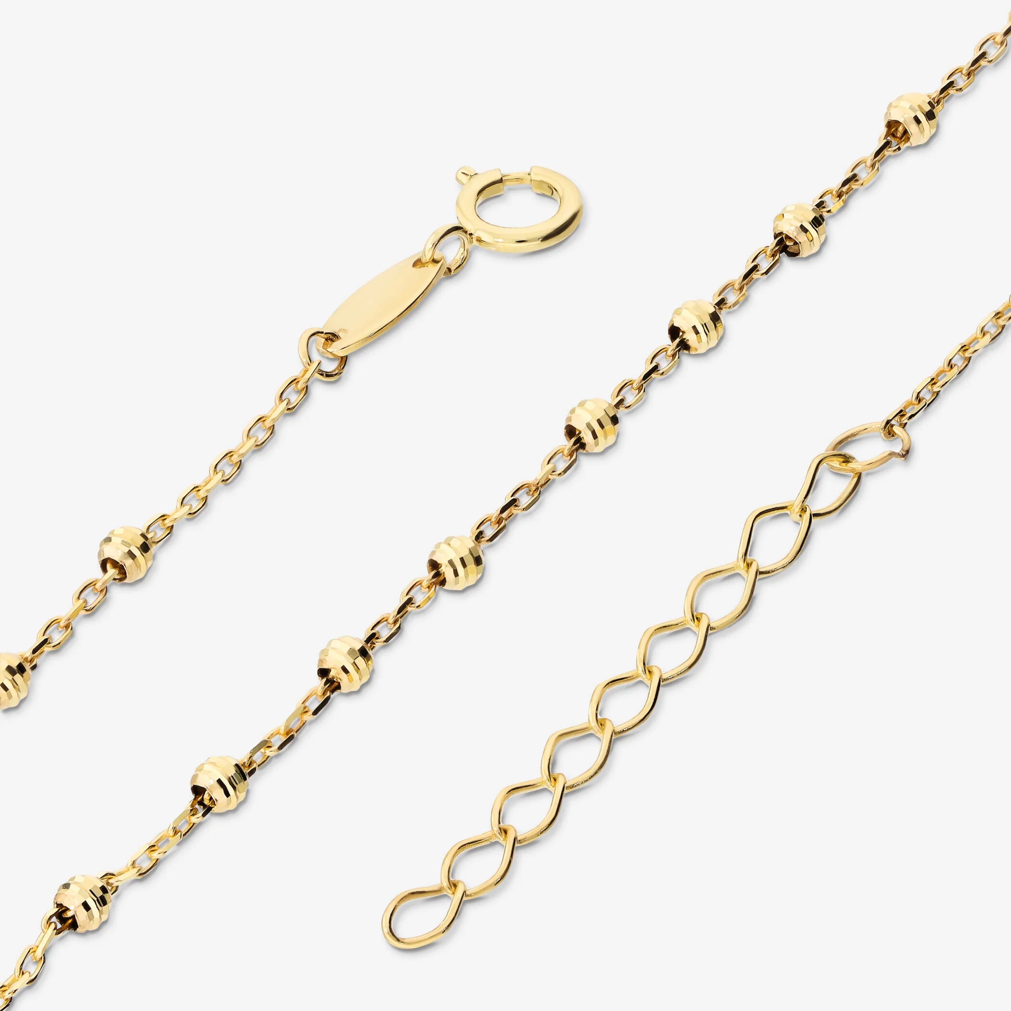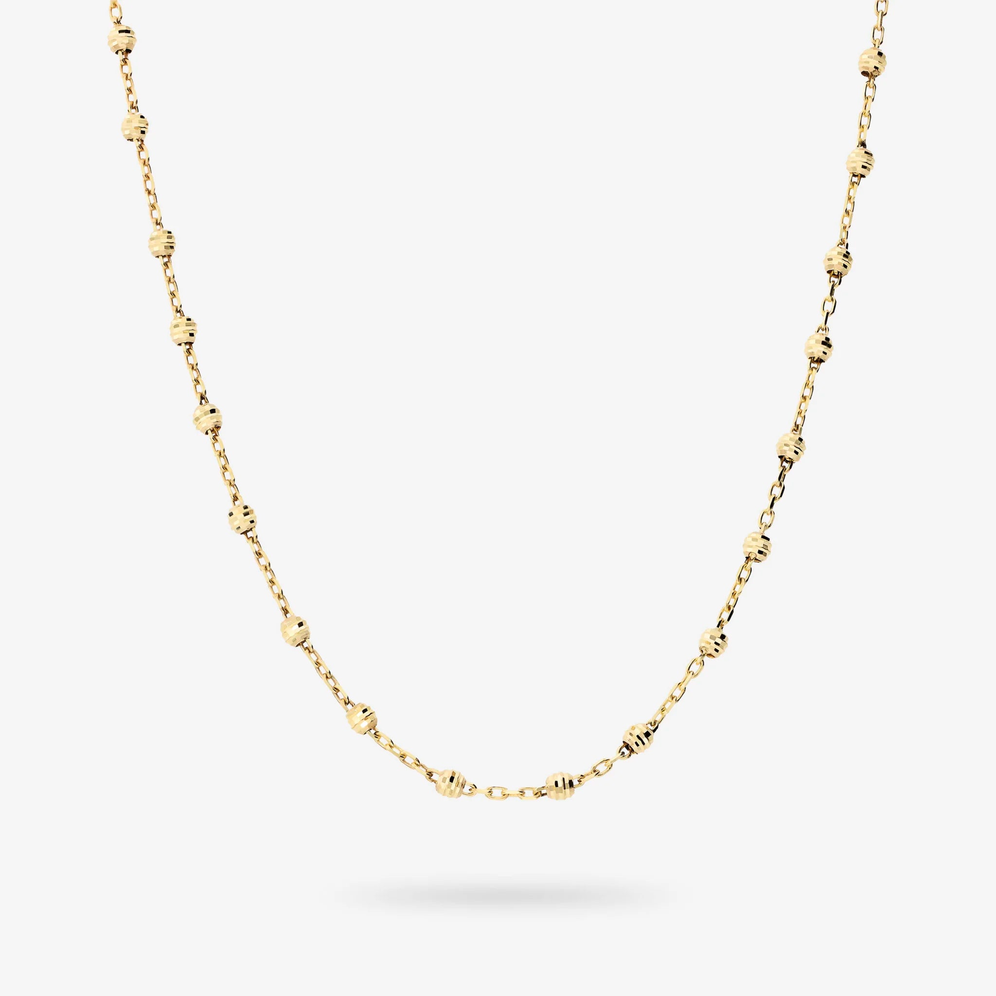 The long 9 carat gold necklace with diamond elements is a romantic and feminine jewel. The classic base with geometric and linear cable chain houses small diamond-studded and very bright spheres, for maximum elegance.