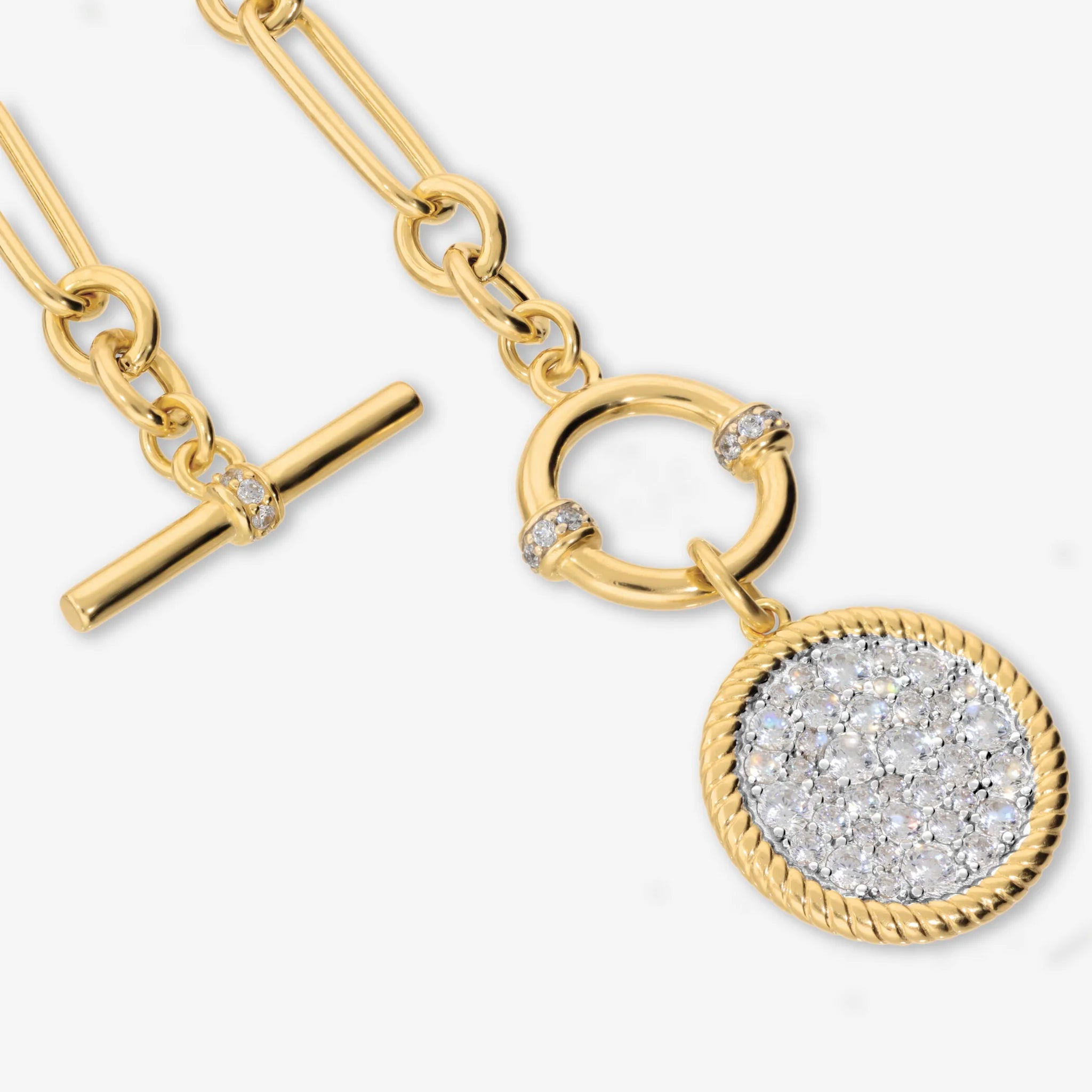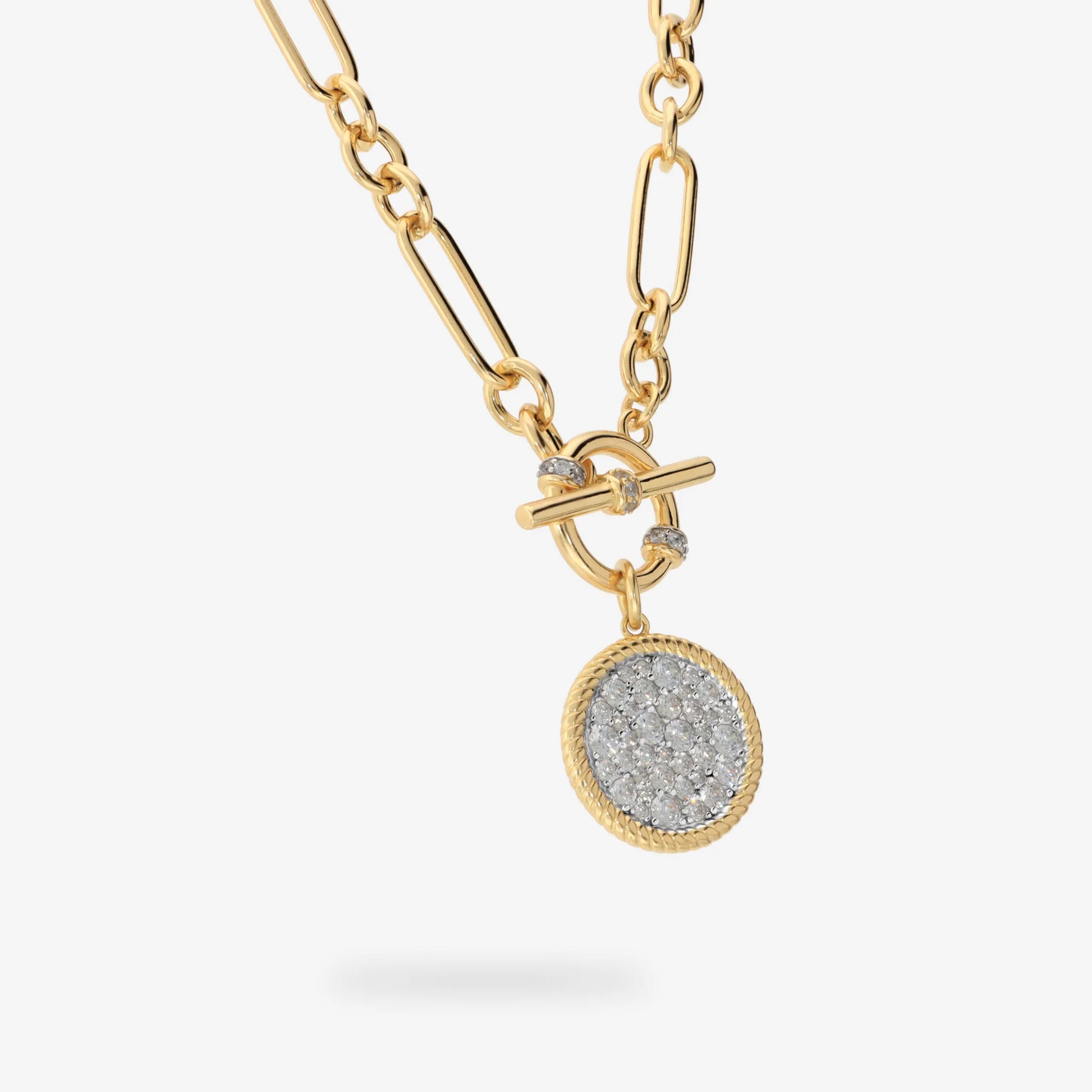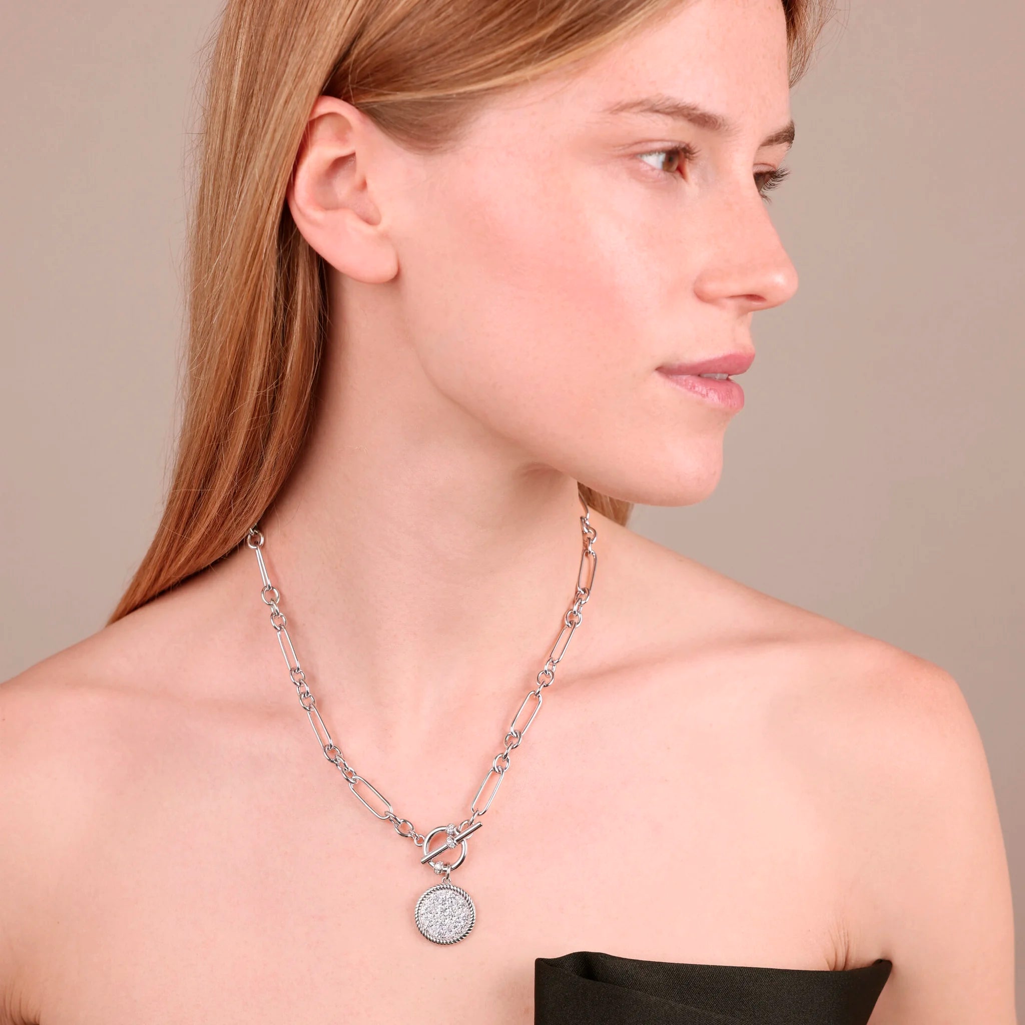 925 Silver necklace with alternating oval links and round pendant with grooved frame and pavé of cubic zirconia, "Luminosa" quality, equal to 3ct. Length 45 cm. "T-Bar" clasp.