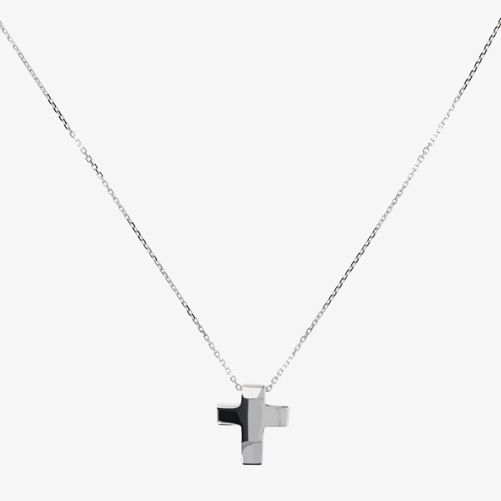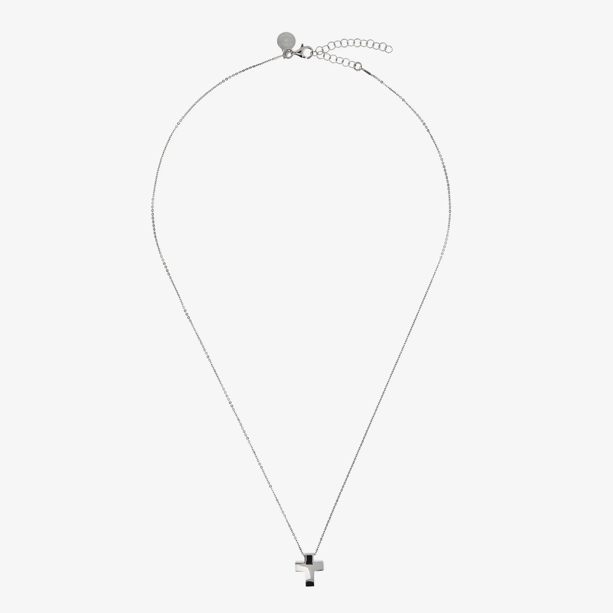 Necklace in Platinum plated 925 Silver with three-dimensional sliding cross pendant. Lobster clasp closure.