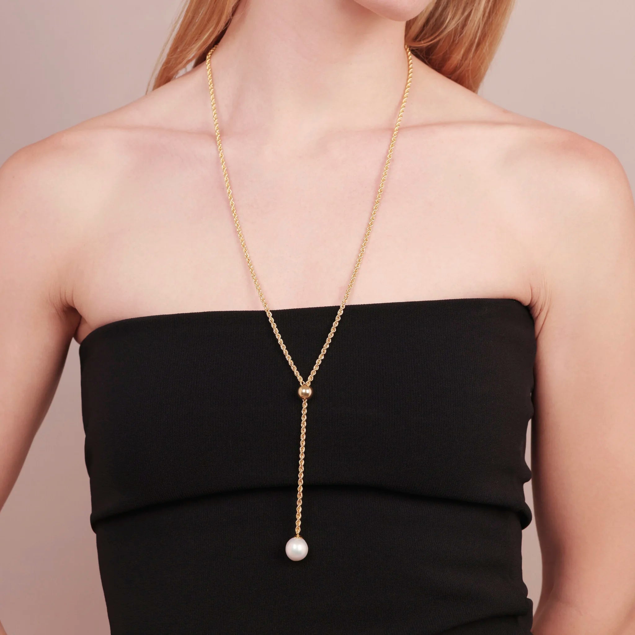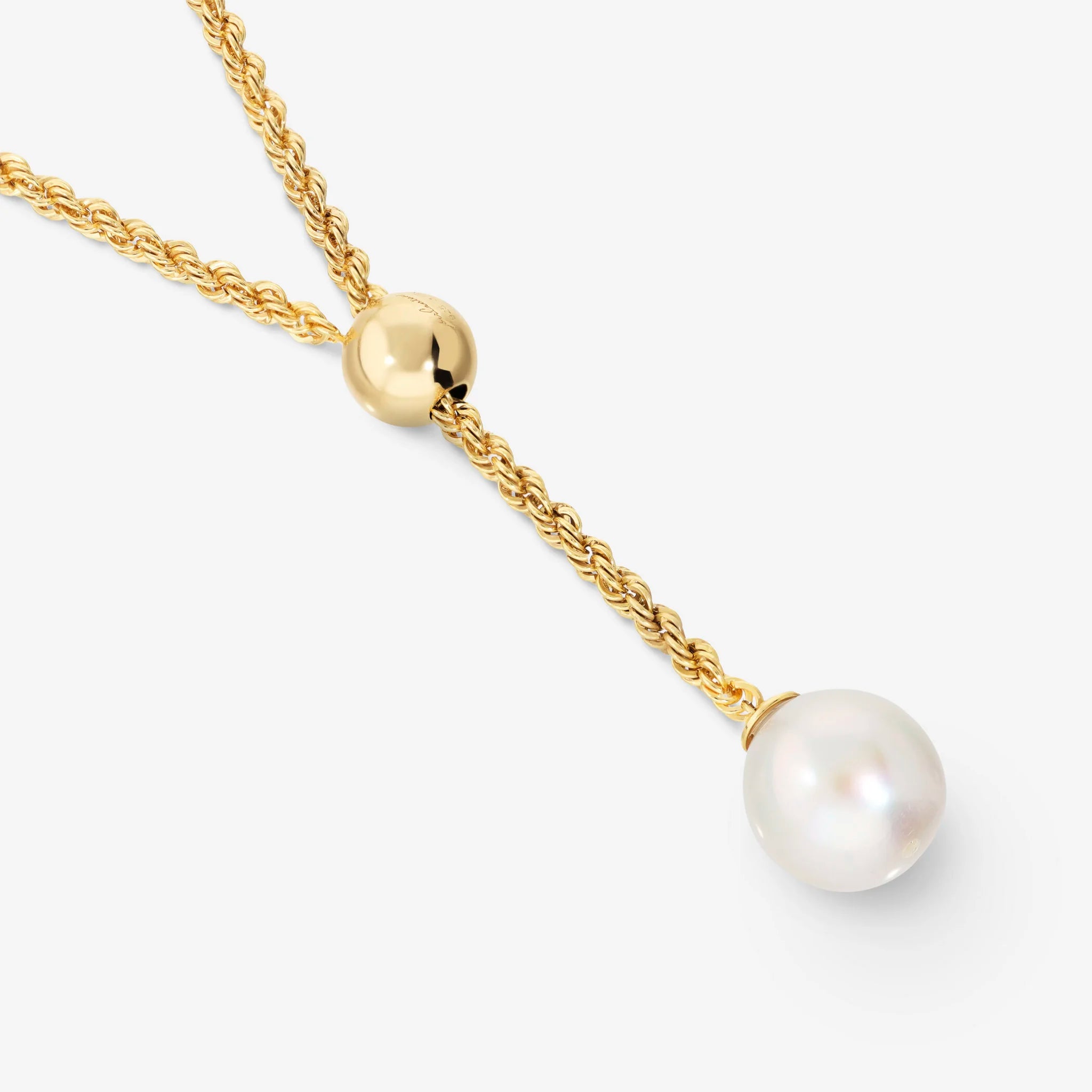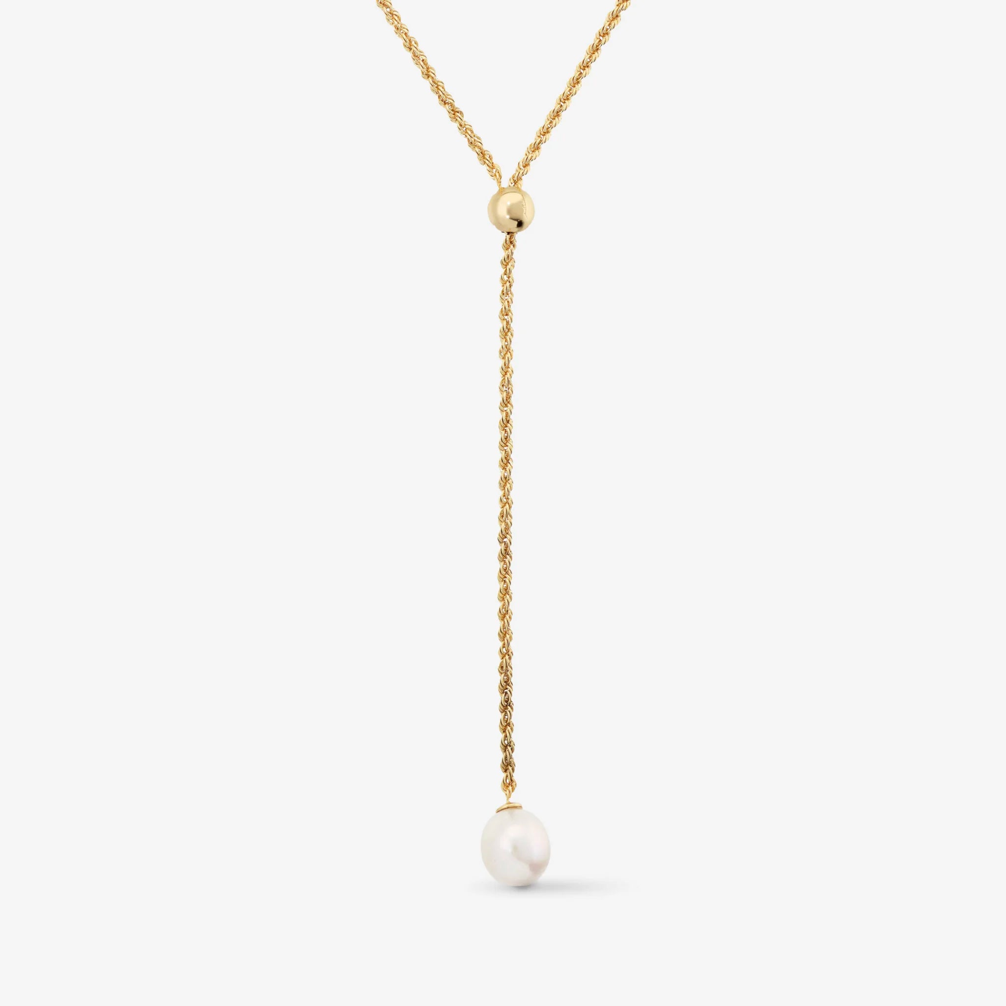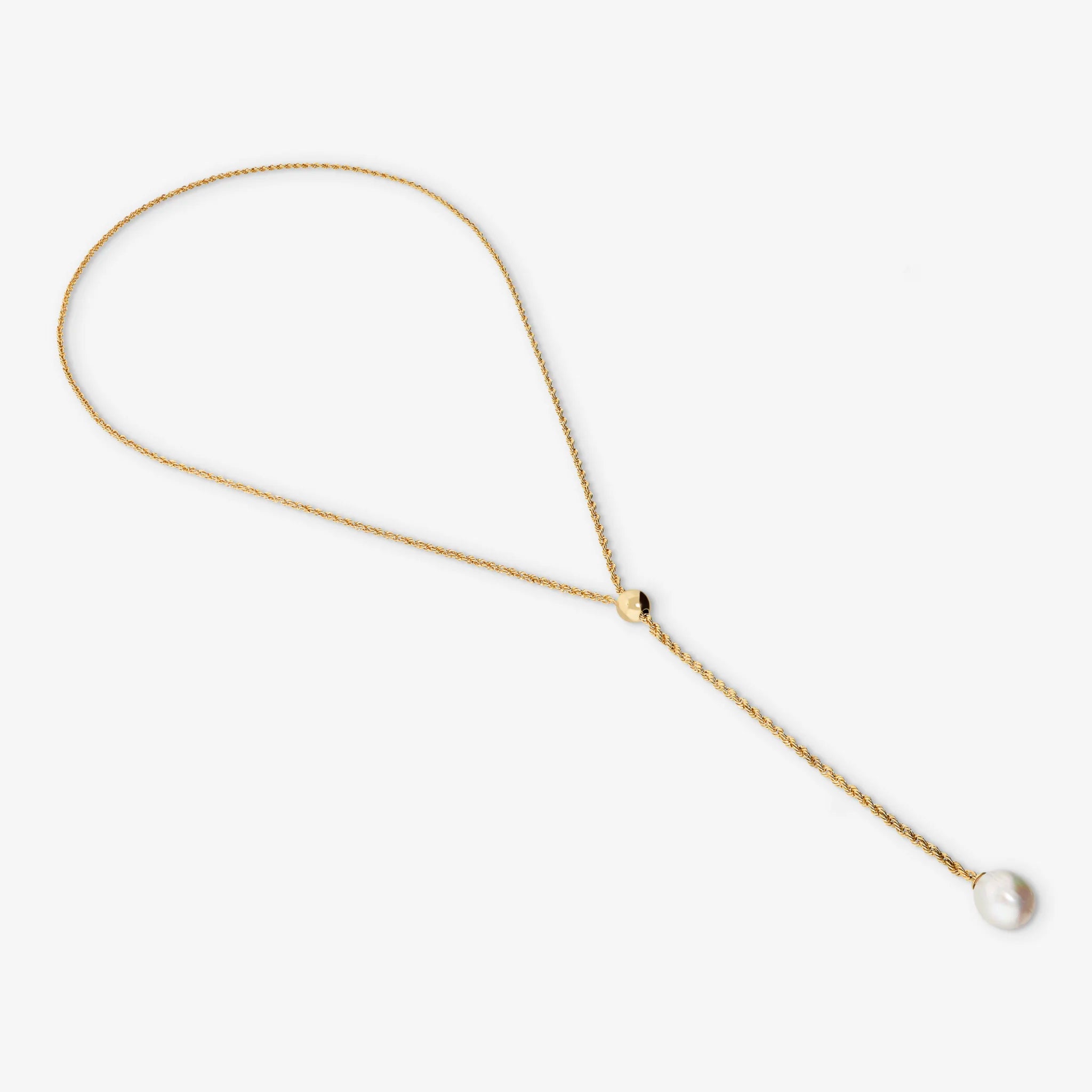 Adjustable necklace in 925 Silver plated with 18kt Yellow Gold. Rope chain with sliding central bead and white Ming freshwater cultured pearl with a diameter of about 12/13 mm. Total length 77 cm.